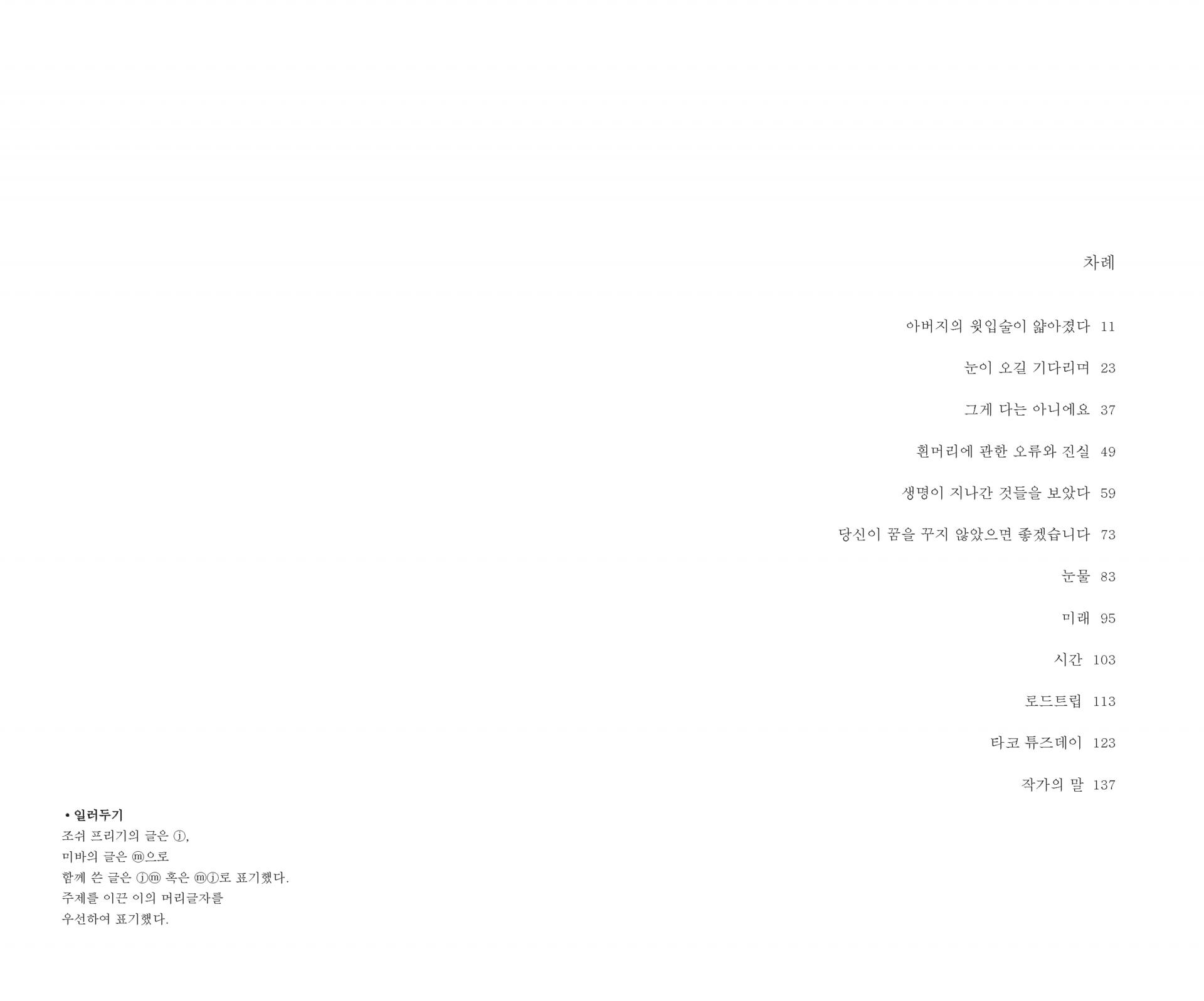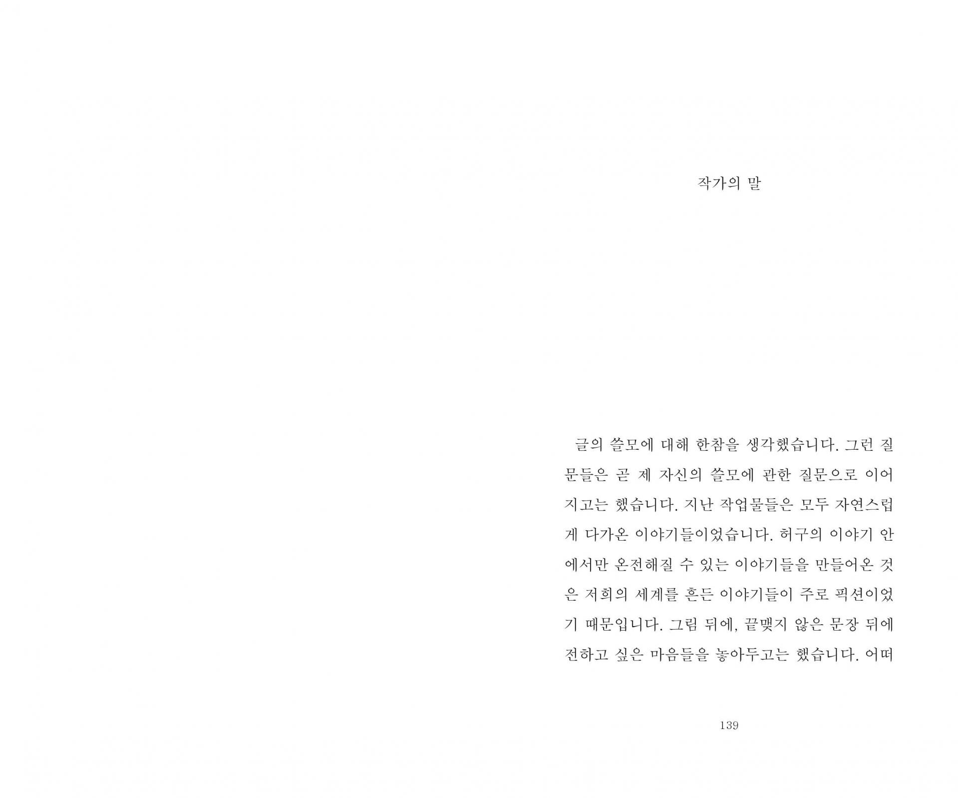 “그림 뒤에, 끝맺지 않은 문장 뒤에 전하고 싶은 마음들을 놓아두고는 했습니다. 어떠한 문장 안에 마음을 다 담는다는 것은 불가능한 일처럼 느껴졌으니까요. 그것은 하나의 장면이거나 흐름 같은 것이어서, 특정한 색과 형태로 때로는 소리로 전해져야만 하는 것들이었습니다. 적어도 그렇게 생각했었지요. 말로 하는 것보다는 글이, 글보다는 장면으로 표현하는 것이 익숙한 사람들입니다만, 그림으로는 다 담지 못했던 마음들을 엮었습니다.” 작가의 말 중