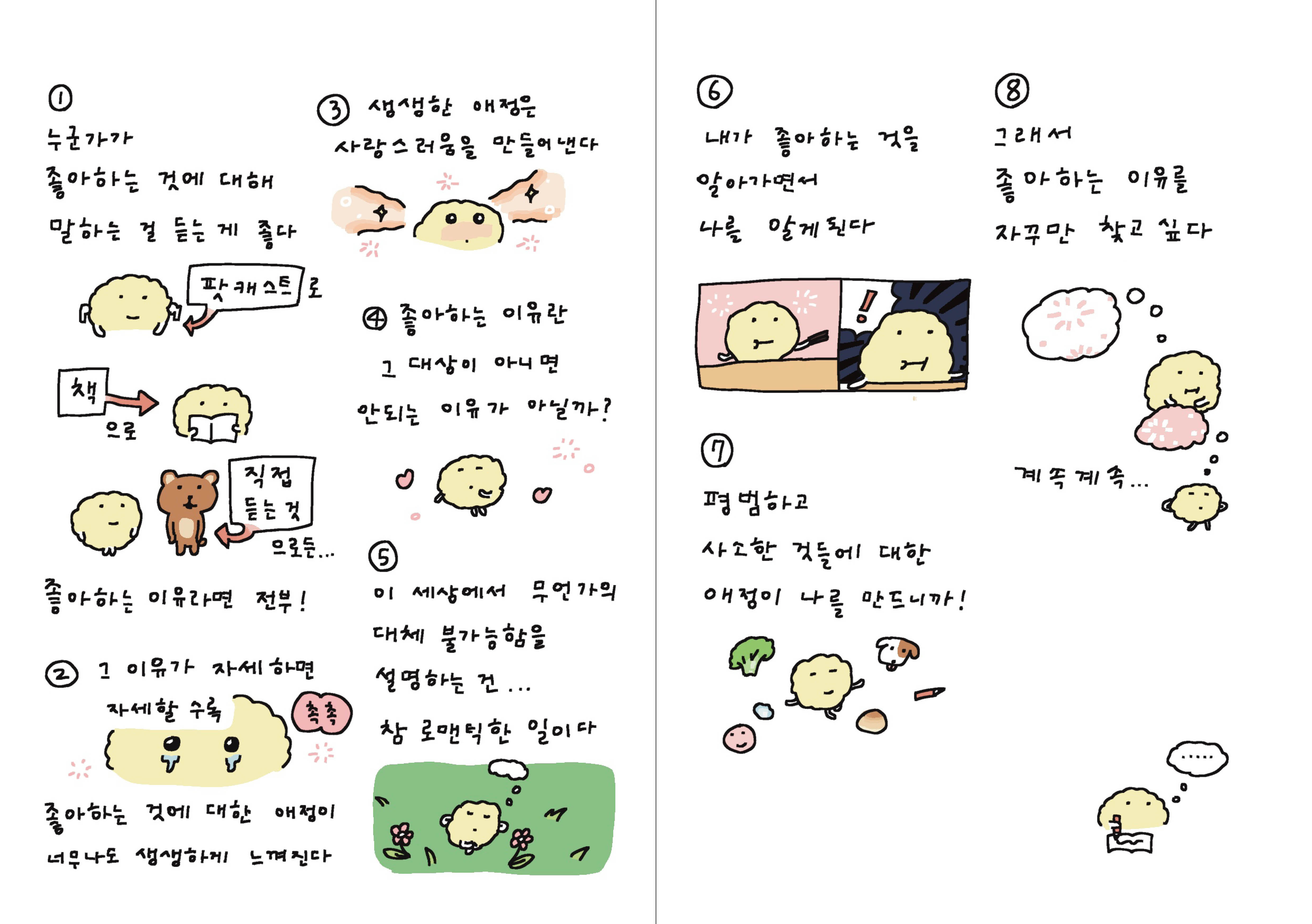 『작고 좋은 것들』은 사소하고 평범한 것들을 유심히 들여다보며, 왜 좋아하게 되었는지 곱씨는 마음을 그림과 글로 담아낸 에세이 만화입니다.