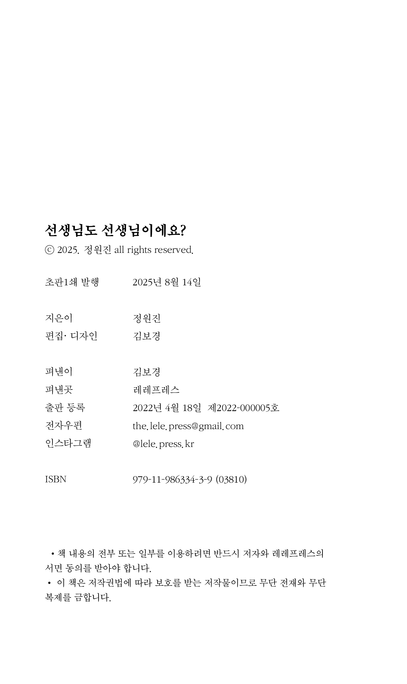『선생님도 선생님이에요?』는 흔한 교단 일기가 아닙니다. 비교과 교사라는 ‘변두리’에서 느낀 소외와 무관심, 방황 속에서 실패를 반복하며 아파했던 기록이자, 동시에 그 속에서 아이들에게 위로받고 성장해 간 이야기입니다. 결국 이 책은 특정 직업군을 넘어, “어른이 되고 싶지만 여전히 미성숙한” 사회초년생 모두에게 닿는 이야기로 확장됩니다.
