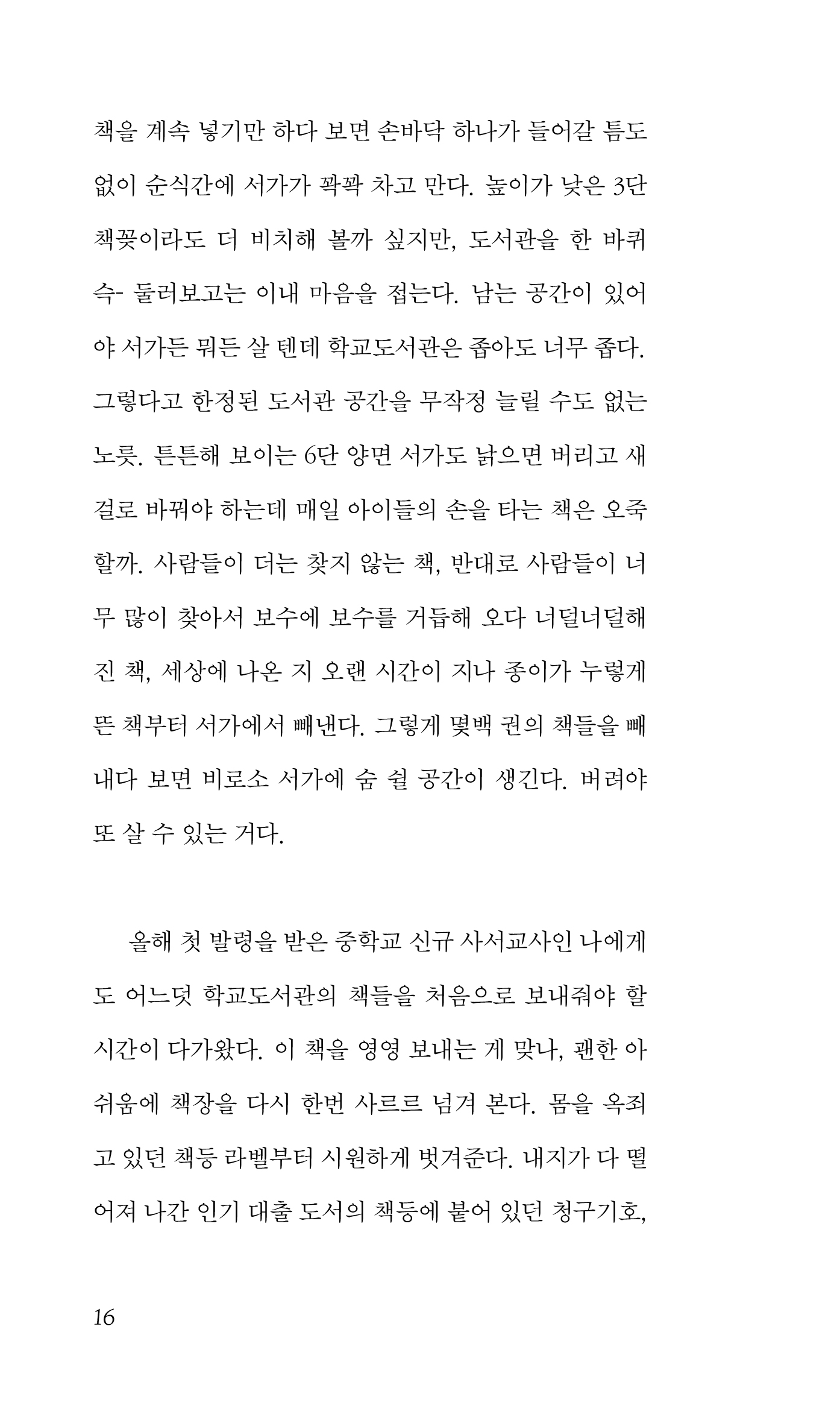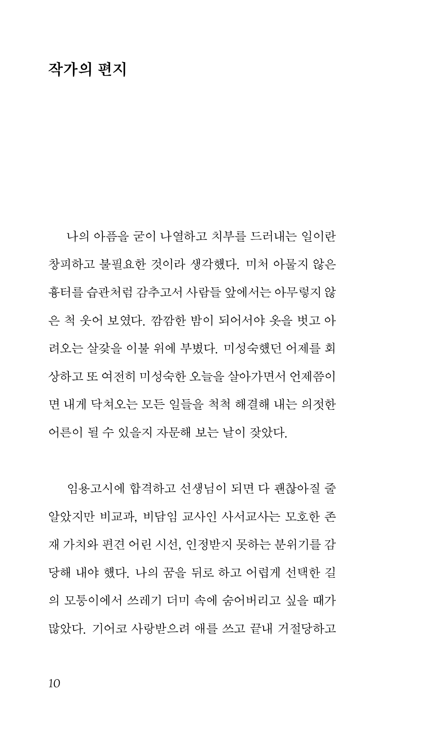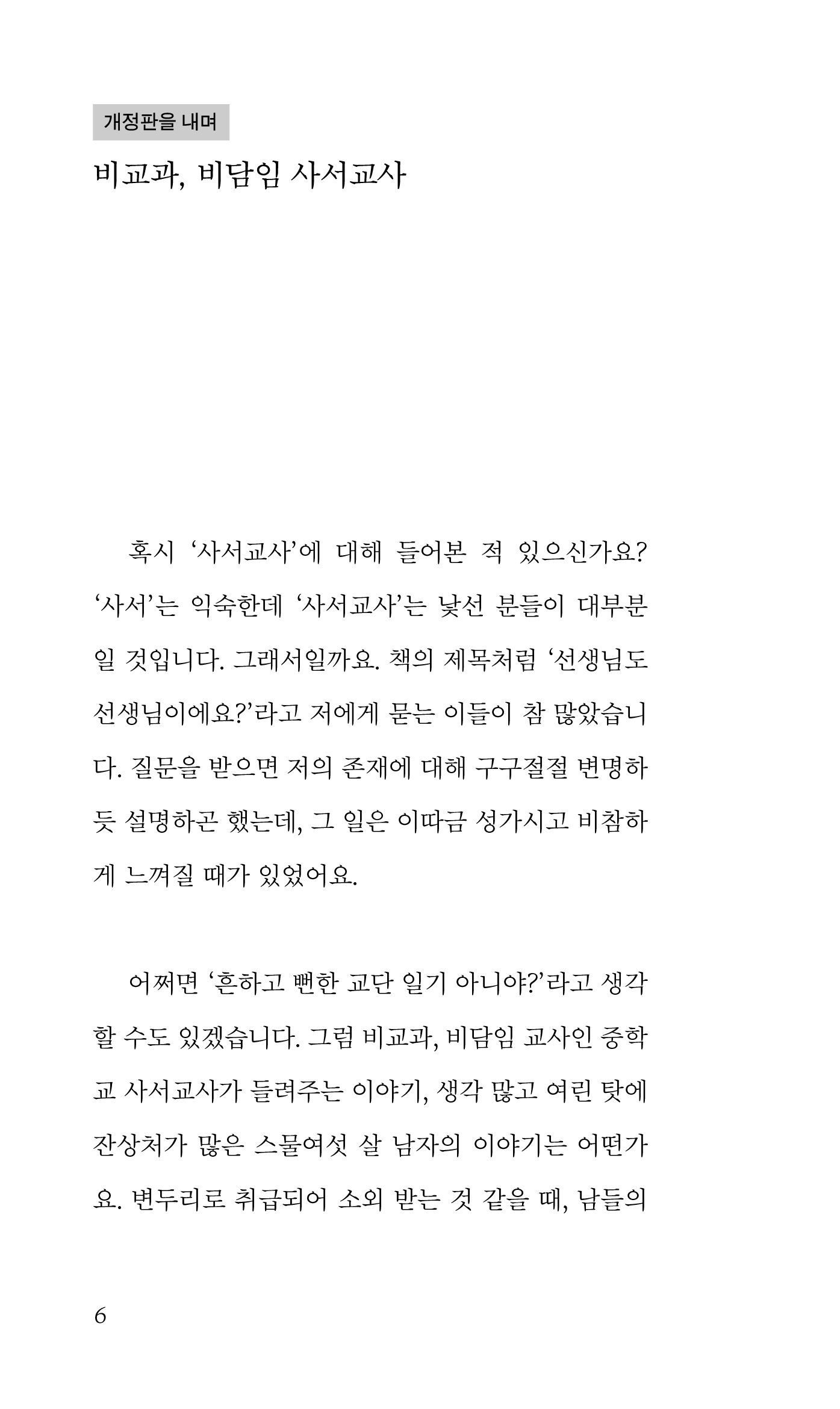 “선생님도 선생님이에요?” 어느 날 학생의 질문은 사서교사의 정체성을 뒤흔들었습니다. 임용고시에 합격하면 모든 게 괜찮아질 거라 믿었지만, 비담임·비교과 교사인 사서교사는 여전히 모호한 존재 가치와 편견 어린 시선, 교사로서 인정받지 못하는 분위기를 감당해야 했습니다. 중학교에 첫 발령을 받은 스물여섯, 교사라는 이름을 가졌지만 여전히 서툴고 여린 사회초년생의 모습이 이 책에 담겨 있습니다.