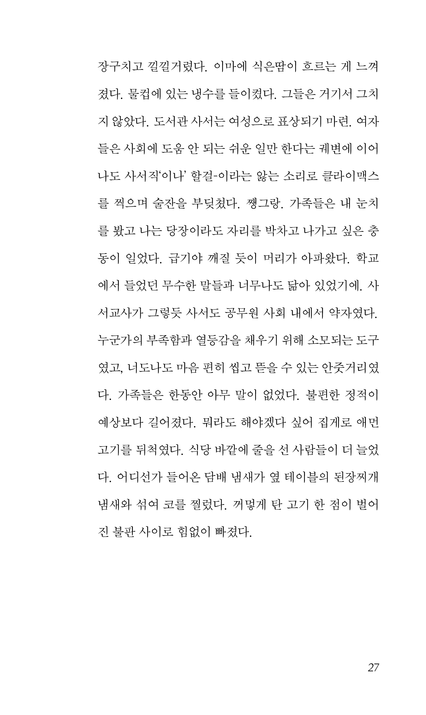 어쩌면 정면으로 마주할 자신이 없는 게 아닐까. 엄마의 일그러진 표정을, 엄마의 들썩이는 어깨를, 엄마의 애달픈 울음을, 또는 엄마의 모든 것들을. 아니면, 이 중 어느 하나도 감당해 내지 못하는 나 자신의 모습을. 엄마 때문에 되레 내가 상처받을까 봐 일부러 피하는 건 아닐까.