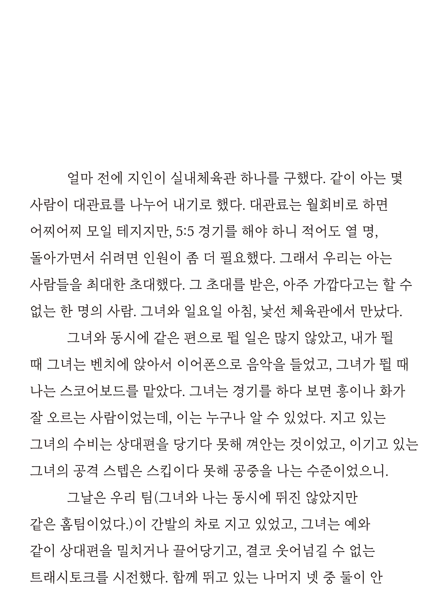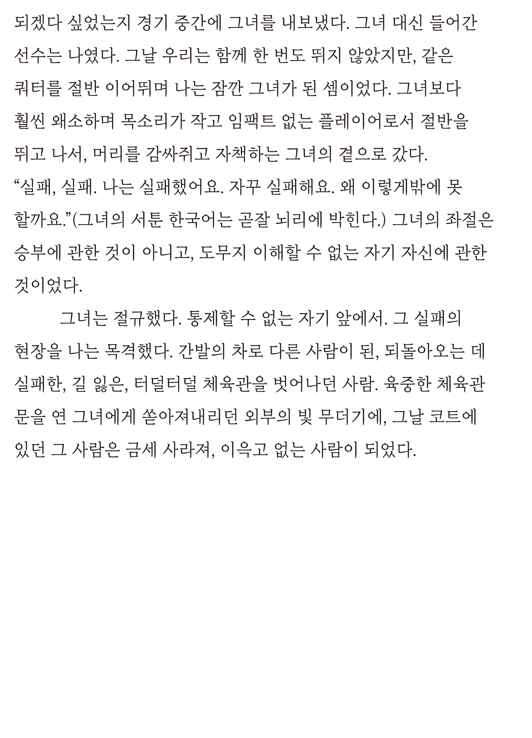 친구보다는 동료에 가깝던 사람이, 세계에서 사라졌다. 대부분의 관계 정의에 인색했던 나는 그를 동료로 들이는 데도 수년을 필요로 했다. 그는 수년간 이따금 요청했고, 나는 힘이 닿는 선에서 절반 이상을 수락했으며, 그 일들이 미친 영향, 그 일들을 하는 동안 내가 맞은 일들, 그러는 새 쌓인 나라는 사람의 생애가 그를 ‘동지’로 자리매김시켜주었다. 그가 내가 있는 세계에 더 이상 존재하기를 멈췄을 때, 나는 아쉬워했다. 우리가 아직 친구가 돼보지 못한 것을. 그가 늘 그랬듯 태연하게 부탁을 던지던 톤으로 나의 집에 방문하겠다던 목소리를 거절한 것을. ‘지금 당장’의 시간은 너무나 폭좁고, ‘언젠가 나중’의 시간은 너무나 폭넓었던 그때에 언제나처럼 어색하게 굴었던 것을. (9쪽)