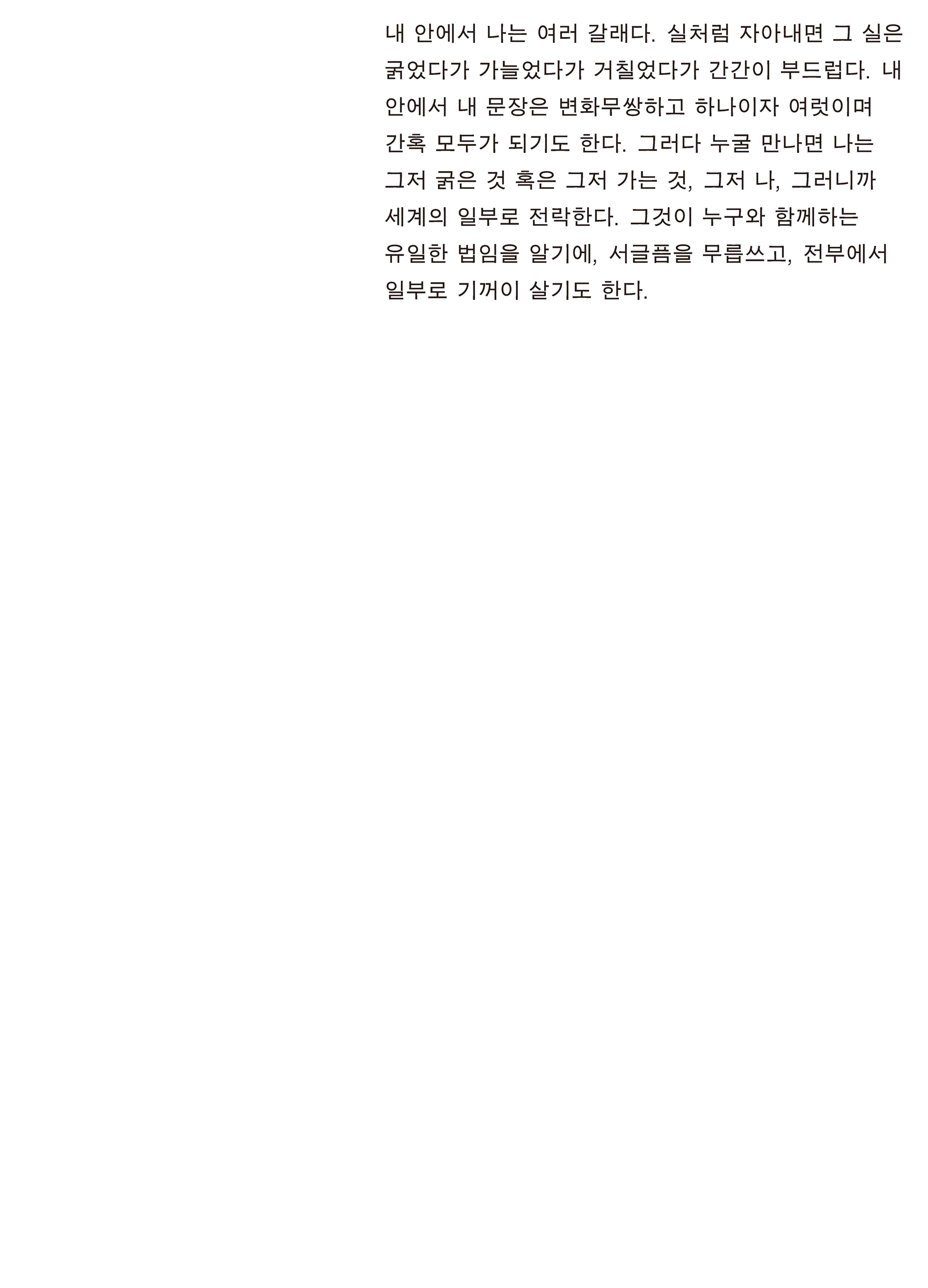 내 안에서 나는 여러 갈래다. 실처럼 자아내면 그 실은 굵었다가 가늘었다가 거칠었다가 간간이 부드럽다. 내 안에서 내 문장은 변화무쌍하고 하나이자 여럿이며 간혹 모두가 되기도 한다. 그러다 누굴 만나면 나는 그저 굵은 것 혹은 그저 가는 것, 그저 나, 그러니까 세계의 일부로 전락한다. 그것이 누구와 함께하는 유일한 법임을 알기에, 서글픔을 무릅쓰고, 전부에서 일부로 기꺼이 살기도 한다. (3쪽)