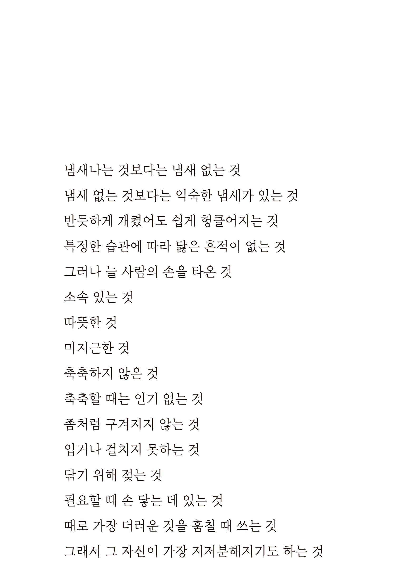 맨 처음 타월을 만든 사람이 있었습니다. 그는 용도를 정하지 않고 그저 쓰는 사람마다 자신의 편의에 맞추면 거기 걸맞은 쓰임새가 생기는 타월이면 좋겠다 싶었습니다. 무엇이든 될 수 있다면, 어째서 타월을 만드는가 묻는다면, 글쎄요. 만들어보고 싶기도 했고, 만드는 걸 도와줄 사람도 가까이 있었습니다. 목화솜부터 꼼꼼히 골라 채취해서 잘 말리고, 면의 결을 고르게 하여 원단으로 가공한 다음, 그것으로 딱 한 장의 타월을 만들었습니다. 과연, 아주 보드라운 타월이 태어났습니다. 새로 만든 타월이 깨끗하고 단정한 벽에 걸렸을 때, 만든 사람은 물론, 보는 사람마저 뿌듯해졌지요. 화려하거나 눈길을 끌지는 않아도, 아니 그렇기 때문에 한층 오래도록 바라보아도 질리지 않고, 매일, 아니 하루에도 몇 번이고 써도 충분히 포근하고 따스했으니까요. (25쪽)