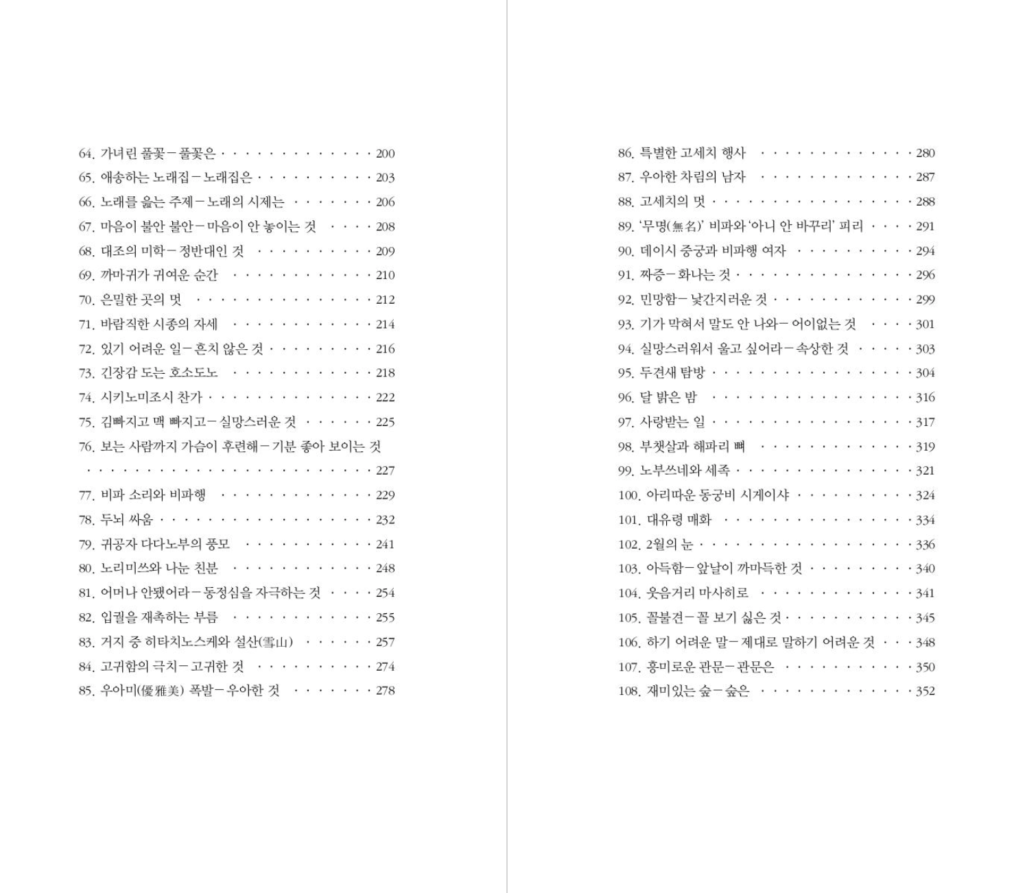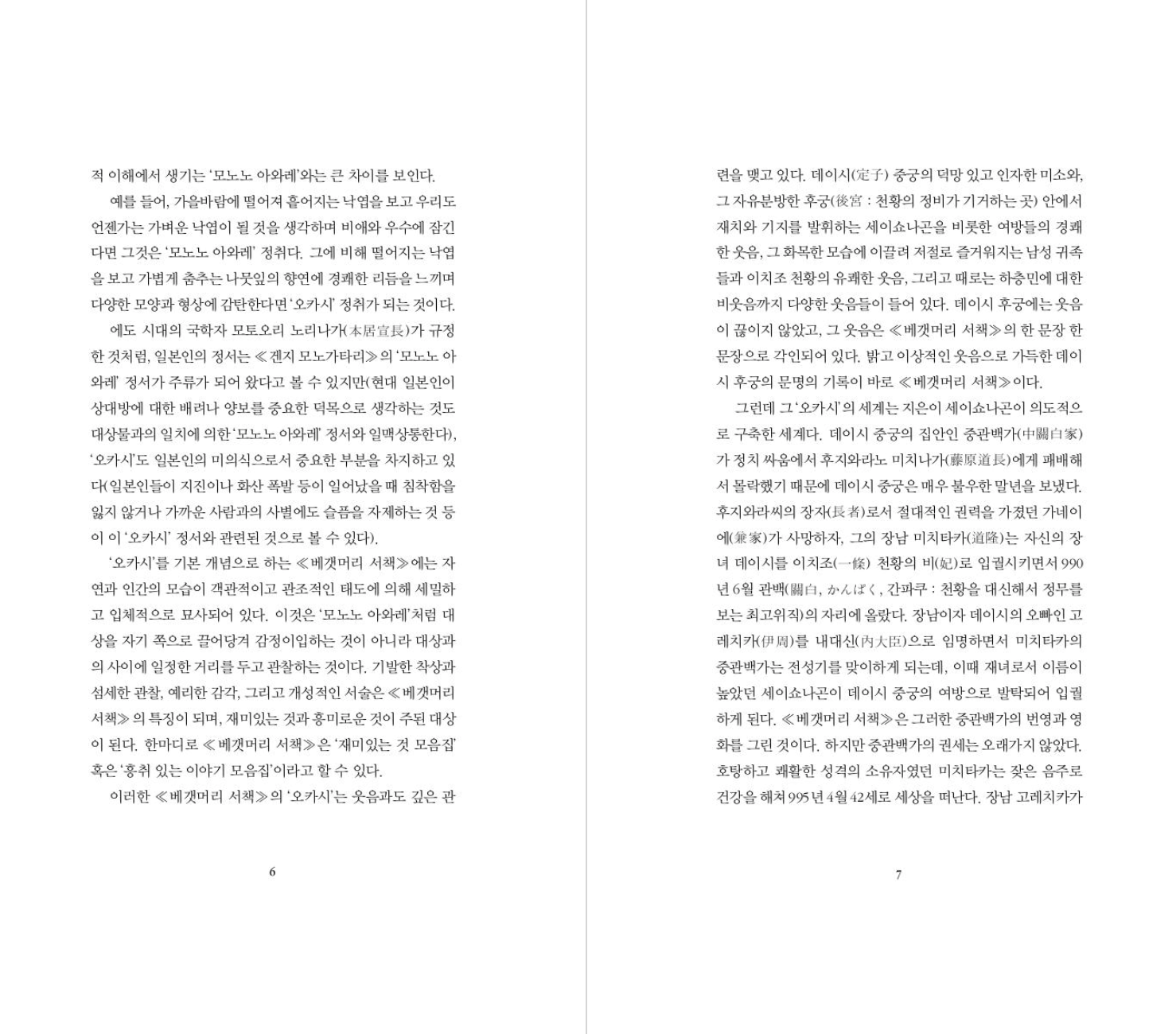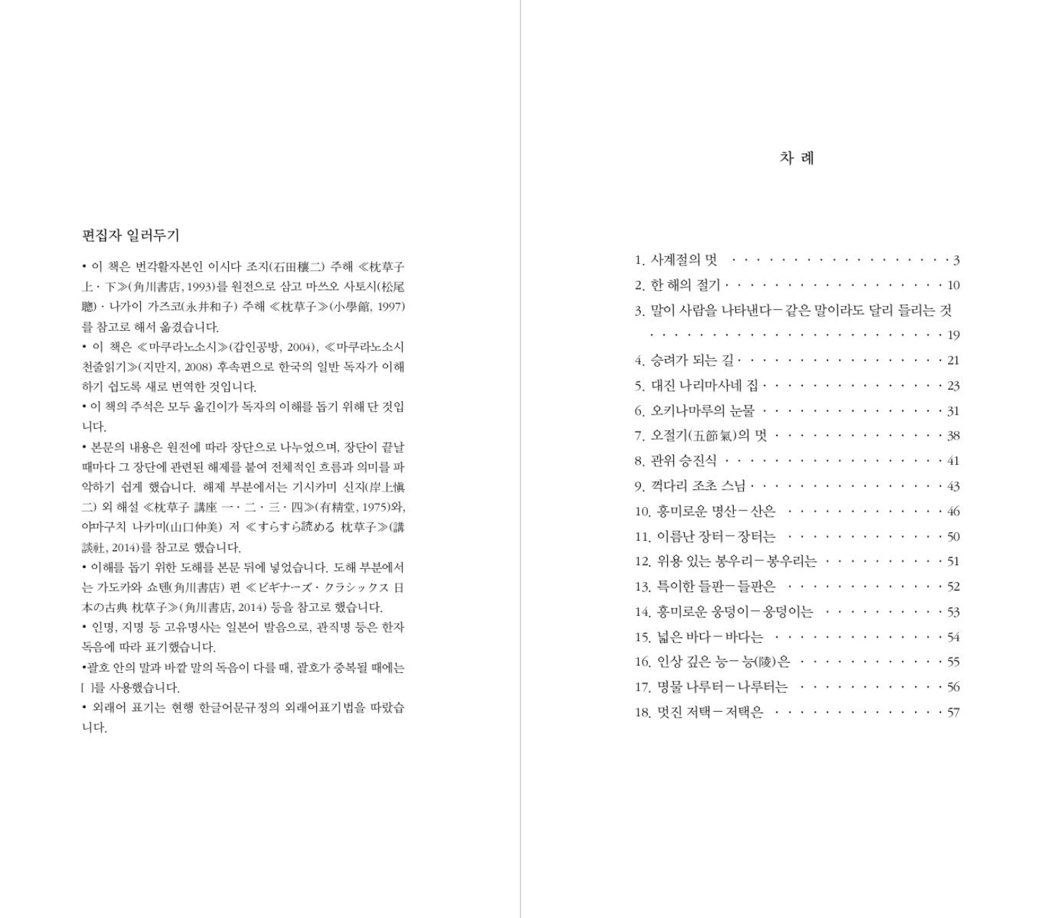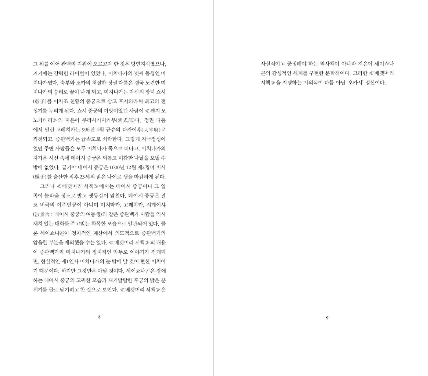일본 수필 문학의 효시인 ≪마쿠라노소시(枕草子)≫를 완역했다. 세이쇼나곤은 객관적인 시각과 경쾌하고 간결한 문장으로 독창적인 리얼리즘을 낳았다. 헤이안 시대, 화려함의 극치인 궁중 문화와 운치로 가득한 귀족들의 생활 모습을 엿볼 수 있다.