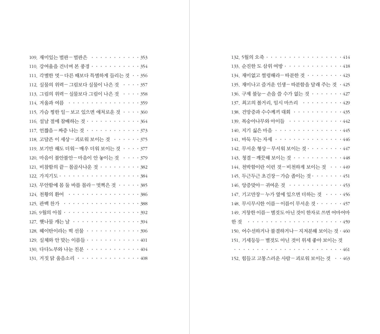 매일같이 세이쇼나곤의 눈에 비치고 귀에 들어오는 다양한 모습들. 그중에서 가장 아름답고 흥미로운 풍경과 현상, 그리고 아 맞아 하고 무릎을 칠 만한 발견, 자신도 모르게 흐뭇해지는 감동, 평소에 대수롭지 않게 지나치던 것에 새로운 가치를 부여했을 때의 기쁨. 그러한 것들이 ≪베갯머리 서책≫의 문장 속에 고스란히 담겨 있다.