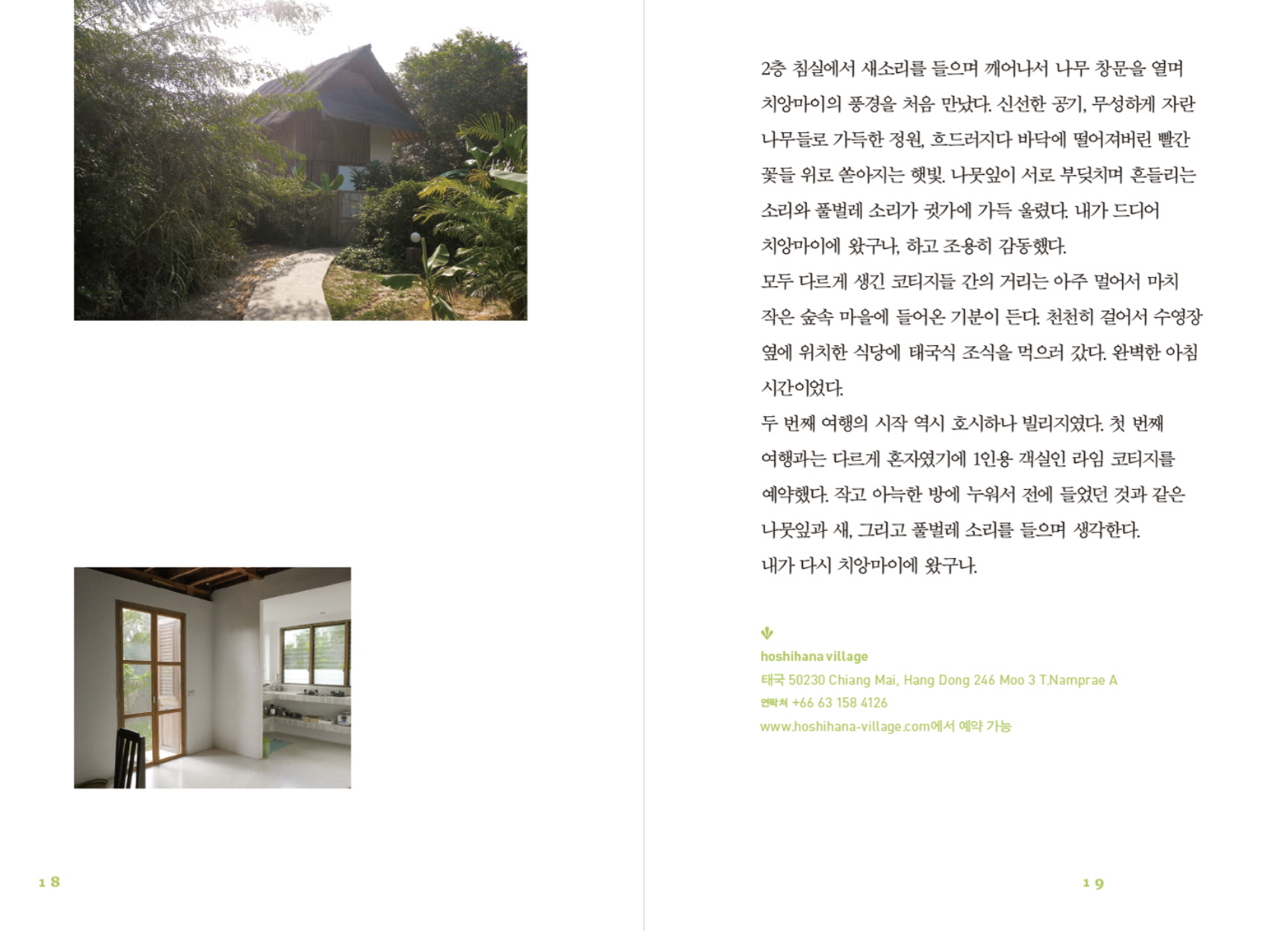 2층 침실에서 새소리를 들으며 깨어나서 나무 창문을 열며 치앙마이의 풍경을 처음 만났다. 신선한 공기, 무성하게 자란 나무들로 가득한 정원, 흐드러지다 바닥에 떨어져버린 빨간 꽃들 위로 쏟아지는 햇빛. 나뭇잎이 서로 부딪치며 흔들리는 소리와 풀벌레 소리가 귓가에 가득 울렸다. 내가 드디어 치앙마이에 왔구나, 하고 조용히 감동했다. 모두 다르게 생긴 코티지들 간의 거리는 아주 멀어서 마치 작은 숲속 마을에 들어온 기분이 든다. 천천히 걸어서 수영장 옆에 위치한 식당에 태국식 조식을 먹으러 갔다. 완벽한 아침 시간이었다. 두 번째 여행의 시작 역시 호시하나 빌리지였다. 첫 번째 여행과는 다르게 혼자였기에 1인용 객실인 라임 코티지를 예약했다. 작고 아늑한 방에 누워서 전에 들었던 것과 같은 나뭇잎과 새, 그리고 풀벌레 소리를 들으며 생각한다. 내가 다시 치앙마이에 왔구나.