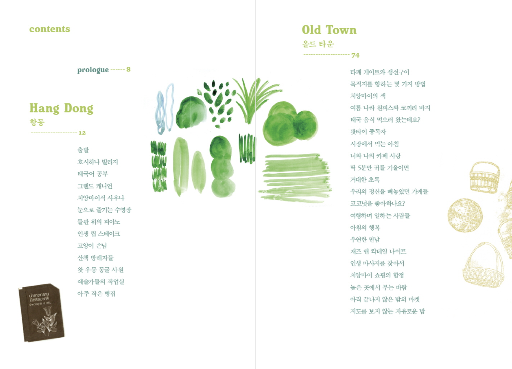 타패 게이트와 생선구이 / 목적지를 향하는 몇 가지 방법 / 치앙마이의 색 / 여름 나라 원피스와 코끼리 바지 / 태국 음식 먹으러 왔는데요? / 팟타이 중독자 / 시장에서 먹는 아침 / 너와 나의 카페 사랑 / 딱 5분만 귀를 기울이면 / 거대한 초록 / 우리의 정신을 빼놓았던 가게들 / 코코넛을 좋아하나요? / 여행하며 일하는 사람들 / 아침의 행복 / 우연한 만남 / 재즈 앤 칵테일 나이트 / 인생 마사지를 찾아서 / 치앙마이 쇼핑의 함정 / 높은 곳에서 부는 바람 / 아직 끝나지 않은 밤의 마켓 / 지도를 보지 않는 자유로운 밤