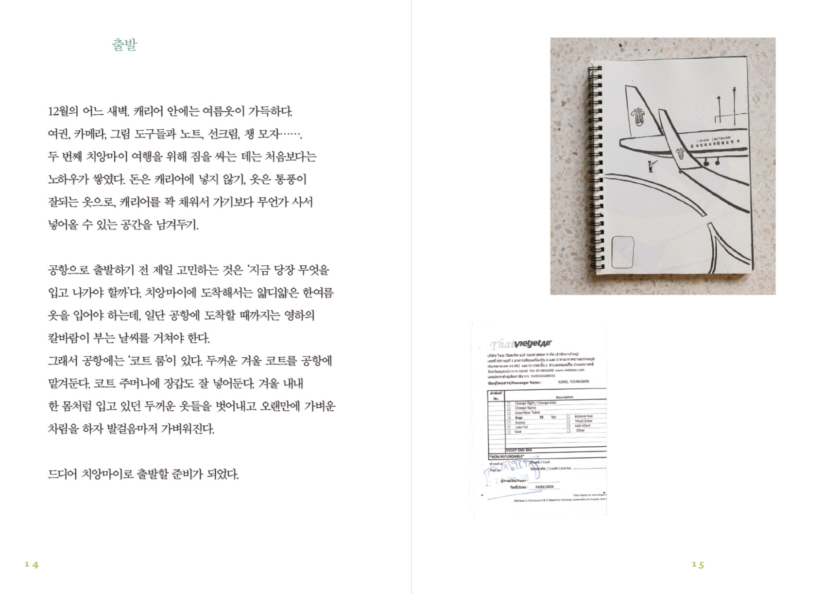 영민에게 치앙마이는 밝고 부드러운 레몬 빛으로, 나무들의 진한 초록으로, 길가에 피어 있는 꽃의 빨강으로, 수영장의 청량한 파랑으로, 스님의 선명한 주황색 옷으로 다가온다. 무질서한 것 같지만 ‘자세히 보면 더없이 예쁜’ 이곳에서 영민은 ‘5분 여행’을 권한다. 여행하다 보면 소소하게 뜨기 마련인 5분, 영민은 스마트폰을 내려놓고 눈앞에 있는 것을 집중해서 바라보면 발밑에 숨어 있는 하얀 꽃이 보이고, 길을 지나는 어린아이들의 웃음소리가 들려올 거라고 말한다.