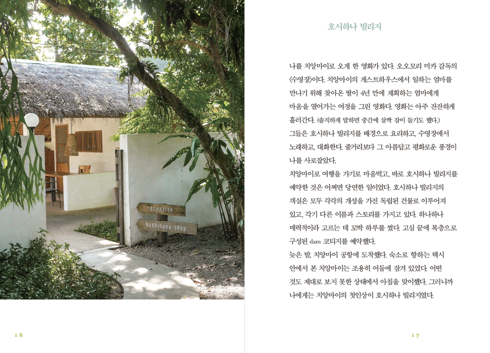 뜬금없는 동네의 에어비앤비 / 식물원이 있는 오후 / 시내 가기 싫은 날 / 숲속의 빵 마켓과 현지인의 비밀 장소 / 새벽 한 시, 그림을 그리기 좋은 시간 / 작은 낙원, 라야 헤리티지 / 다정한 새해 인사 / 용감한 치앙마이의 안내자 / 논 뷰 킨포크 / 눈부신 꿈의 풍경 / 한여름의 크리스마스 / 언젠가 또 시간을 낼 수 있다면