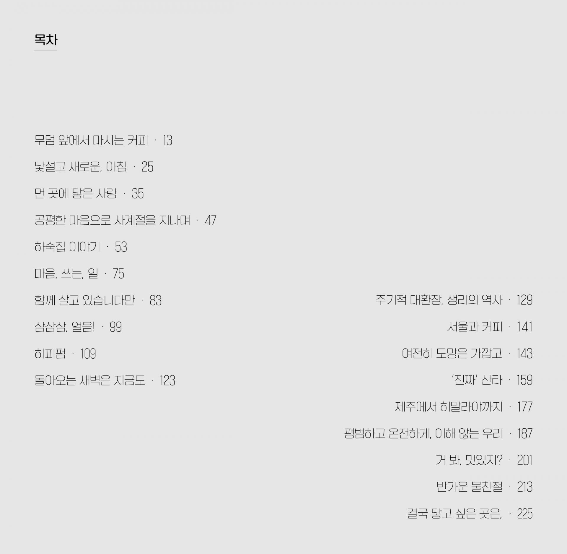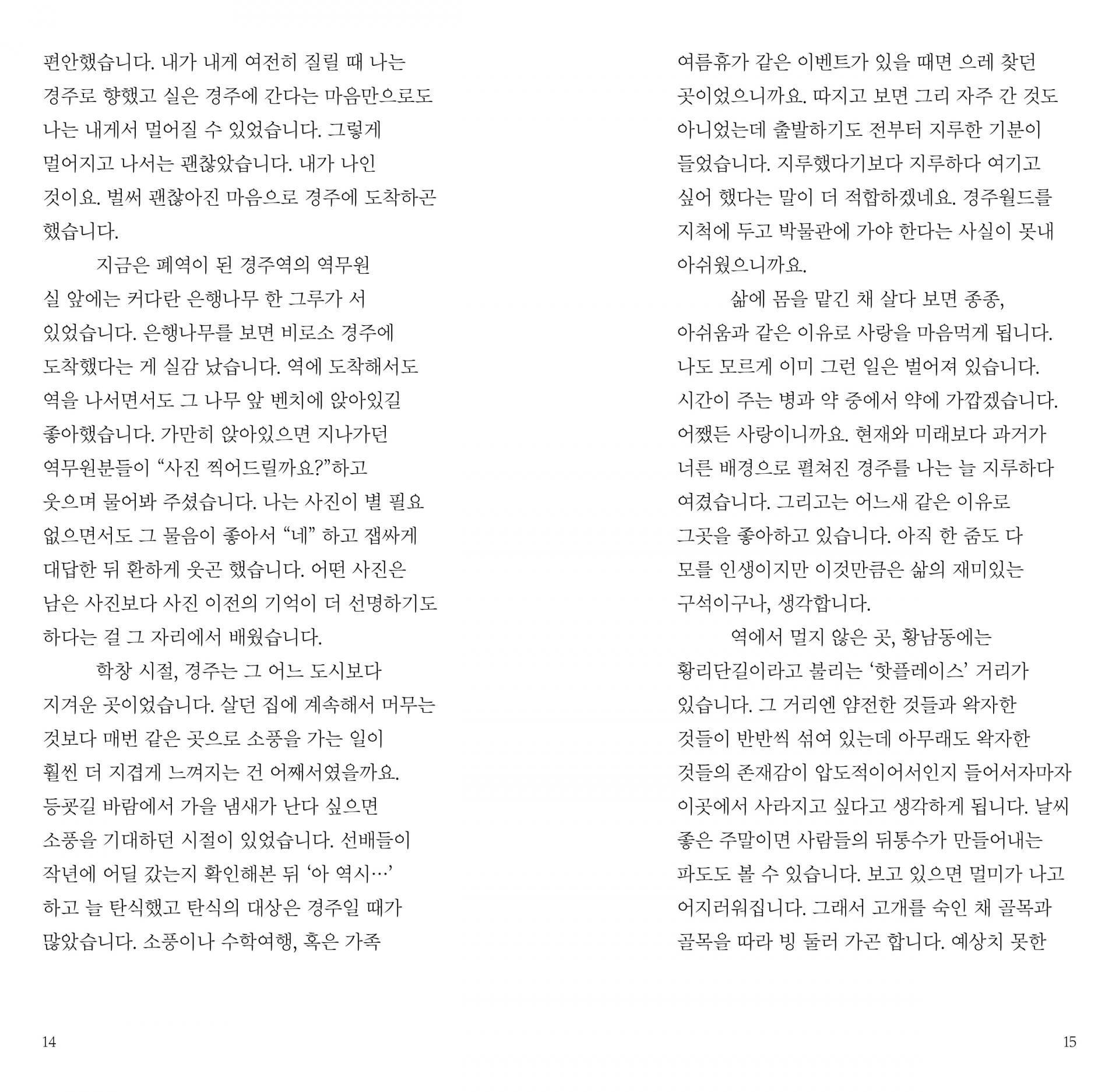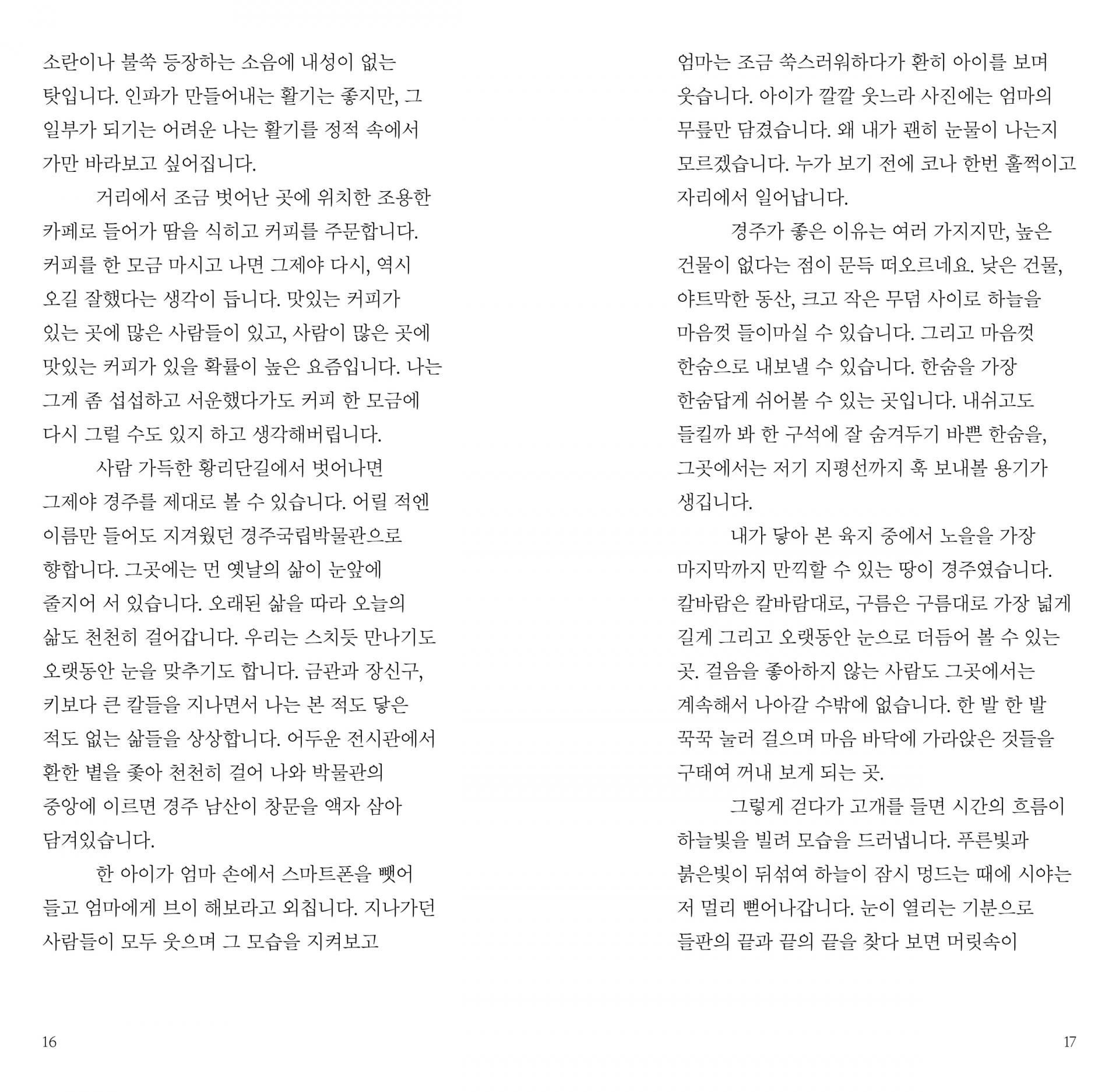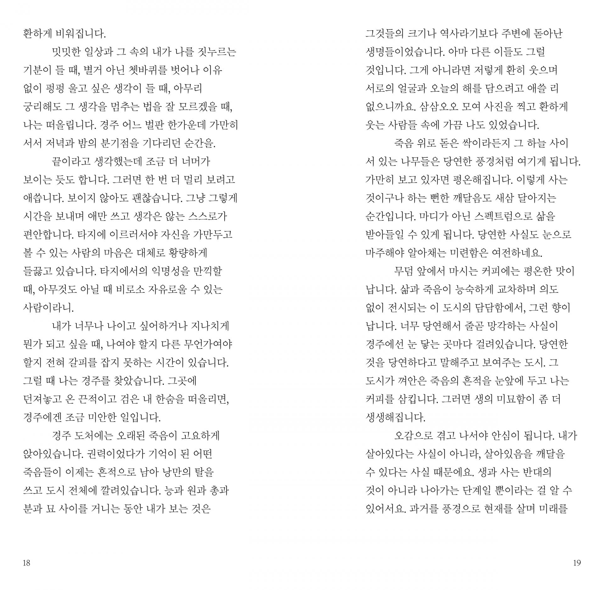 내가 너무나 나이고 싶어하거나 지나치게 뭔가 되고 싶을 때, 나여야 할지 다른 무언가여야 할지 전혀 갈피를 잡지 못하는 시간이 있습니다. 그럴 때 나는 경주를 찾았습니다. 그곳에 던져놓고 온 끈적이고 검은 내 한숨을 떠올리면, 경주에겐 조금 미안한 일입니다. _18p <무덤 앞에서 마시는 커피>