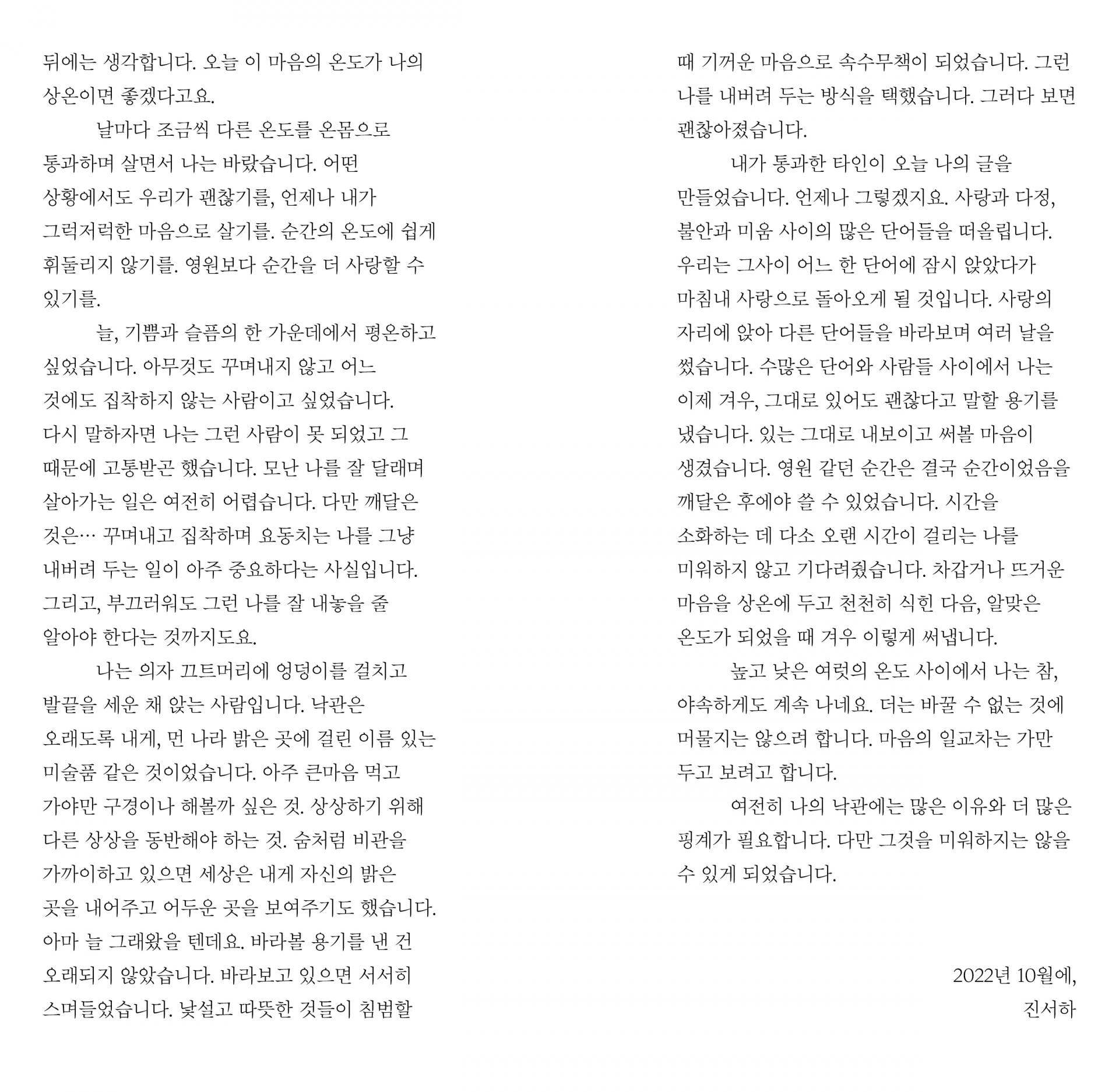 누군가의 인생 한 조각이 담긴 에세이는, 어쩌면 ‘남의 이야기’로만 그칠 수도 있다. 그러나 진서하 작가의 글들은 과거의 내가 겪었고, 현재의 내가 겪으며, 미래의 내가 겪을지도 모를 것들로 온통 이루어져 있다. 지금 당신이 있는 곳의 상온은 어떠한가? 그곳이 어디든 가장 적당한 온도로 이 책이 스며들 수 있길 바란다.