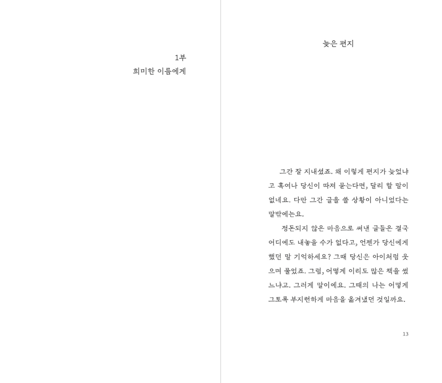 어렵게 쓴 글자들이 조금도 아깝지 않다면 거짓말이겠지만, 서랍을 닫으며 그만 단념하기로 했어요. 나는 오래 이야기하고 싶은 사람이고 그러기 위해서는 나를 제대로 읽어줄 당신이 필요하거든요. -14p 〈늦은 편지〉