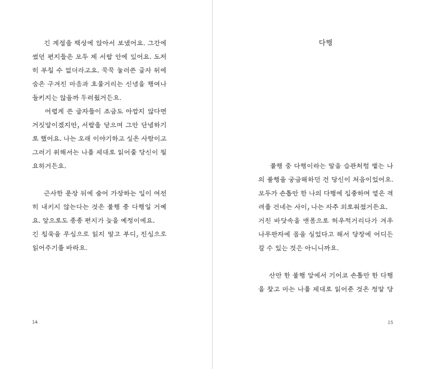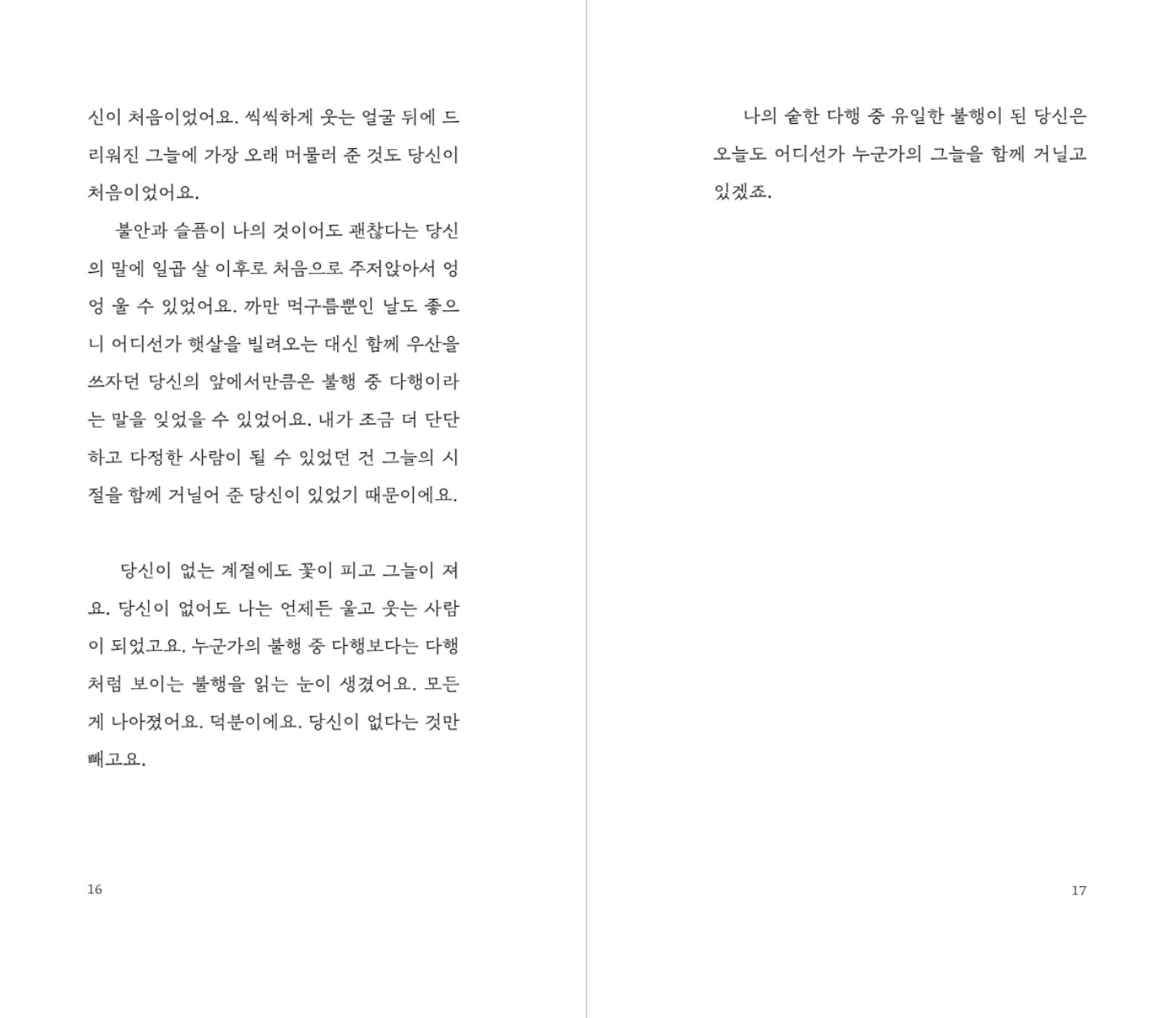 까만 먹구름뿐인 날도 좋으니 어디선가 햇살을 빌려오는 대신 함께 우산을 쓰자던 당신의 앞에서만큼은 불행 중 다행이라는 말을 잊었을 수 있었어요. 내가 조금 더 단단하고 다정한 사람이 될 수 있었던 건 그늘의 시절을 함께 거닐어 준 당신이 있었기 때문이에요. - 16p 〈다행〉