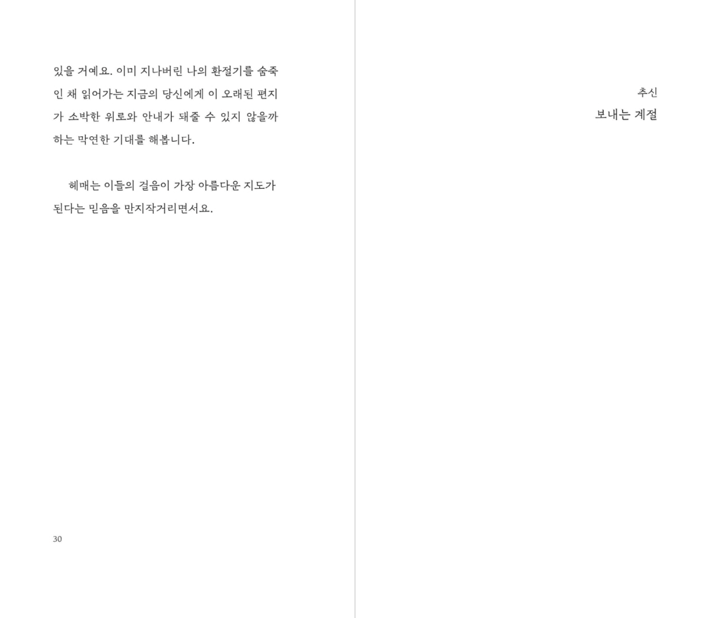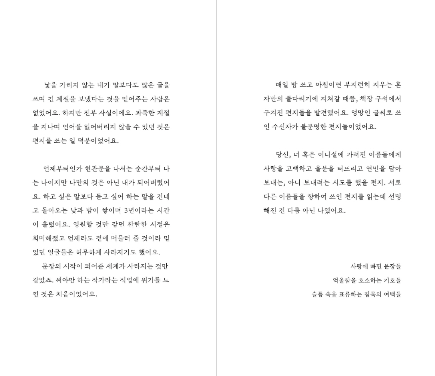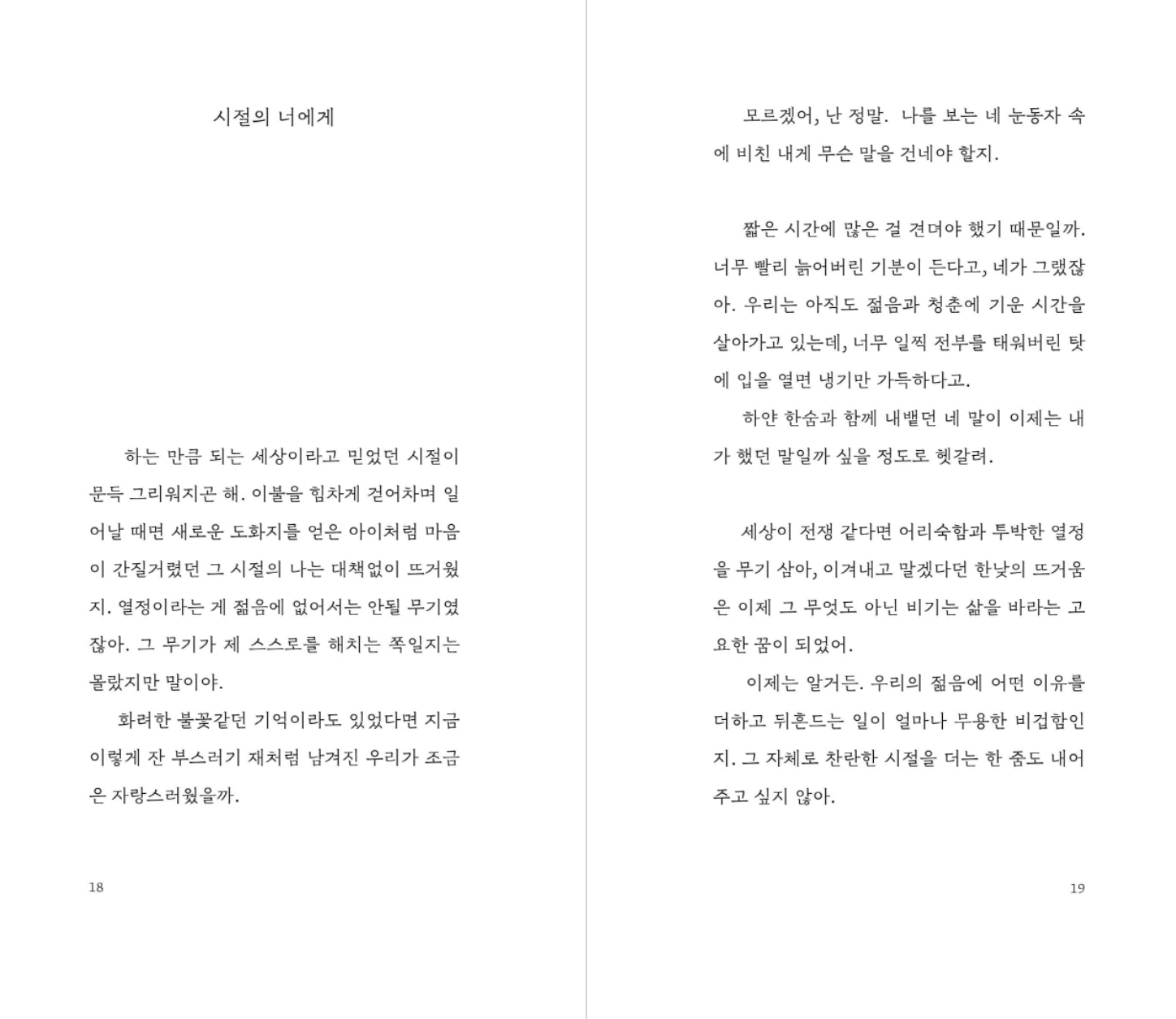 언제부터인가 현관문을 나서는 순간부터 나는 나이지만 나만의 것은 아닌 내가 되어버렸어요. 하고 싶은 말보다 듣고 싶어 하는 말을 건네고 돌아오는 낮과 밤이 쌓이며 3년이라는 시간이 흘렀어요. 영원할 것만 같던 찬란한 시절은 희미해졌고 언제라도 곁에 머물러 줄 것이라 믿었던 얼굴들은 허무하게 사라지기도 했어요. - 149p 〈추신 : 보내는 계절〉