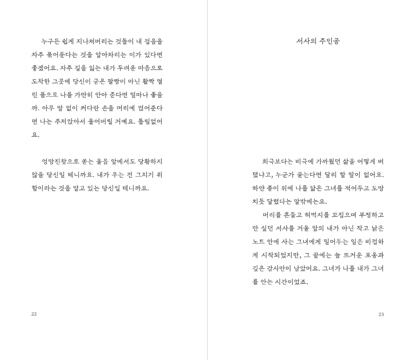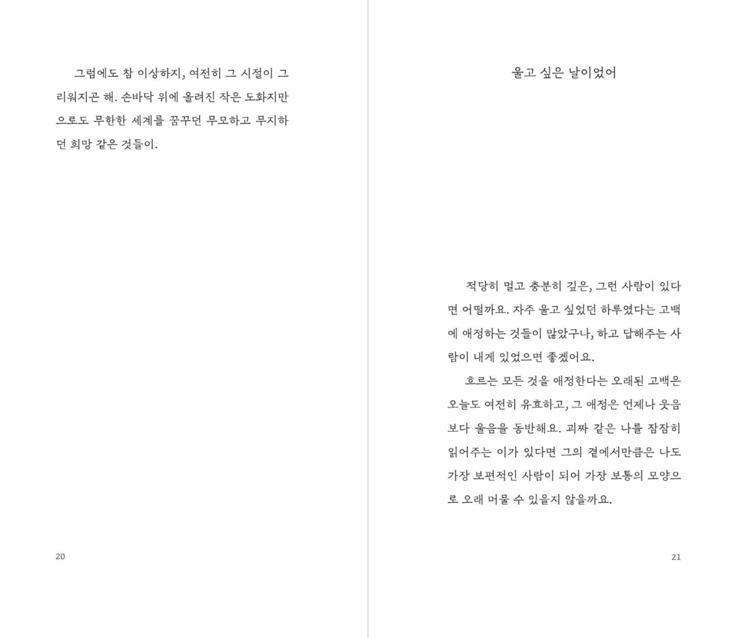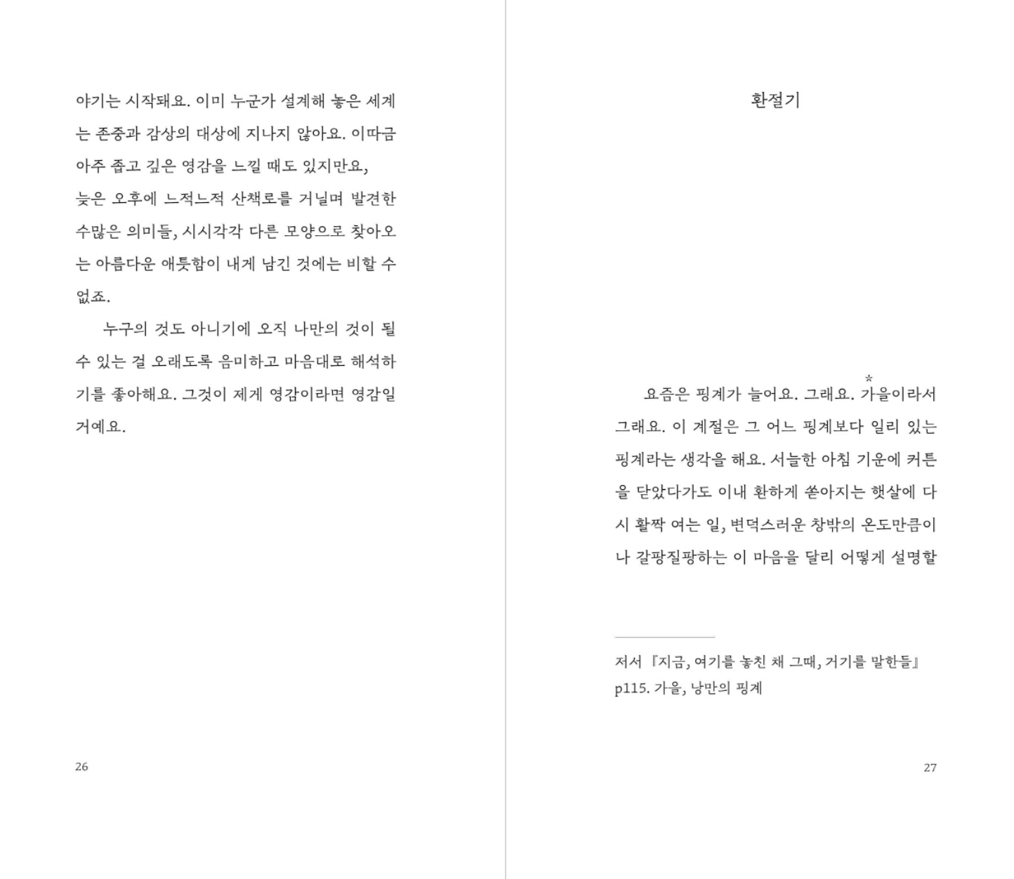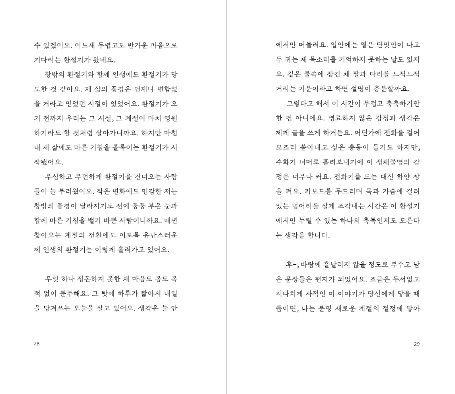 언제부터인가 현관문을 나서는 순간부터 나는 나이지만 나만의 것은 아닌 내가 되어버렸어요. 하고 싶은 말보다 듣고 싶어 하는 말을 건네고 돌아오는 낮과 밤이 쌓이며 3년이라는 시간이 흘렀어요. 영원할 것만 같던 찬란한 시절은 희미해졌고 언제라도 곁에 머물러 줄 것이라 믿었던 얼굴들은 허무하게 사라지기도 했어요. - 149p 〈추신 : 보내는 계절〉