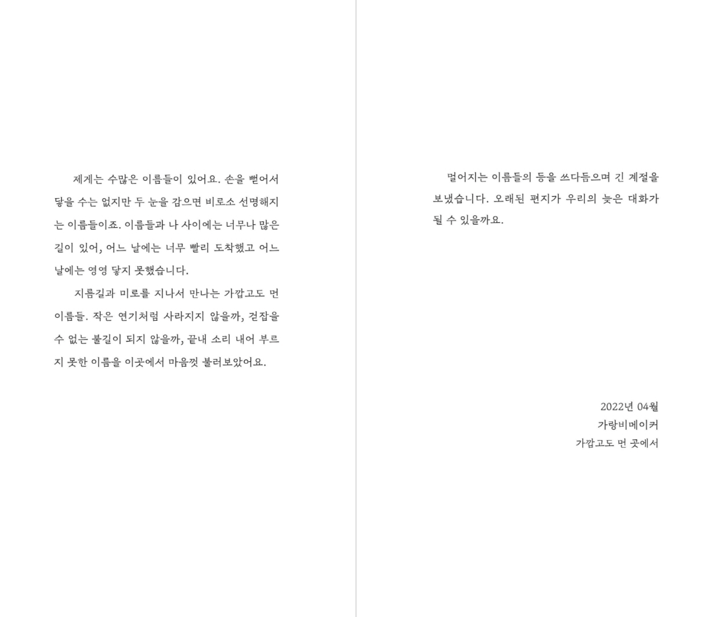 “제게는 수많은 이름들이 있어요. 손을 뻗어서닿을 수는 없지만 두 눈을 감으면 비로소 선명해지는 이름들. (중략) 멀어지는 이름들의 등을 쓰다듬으며 긴 계절을 보냈습니다. 오래된 편지가 우리의 늦은 대화가 될 수 있을까요.”