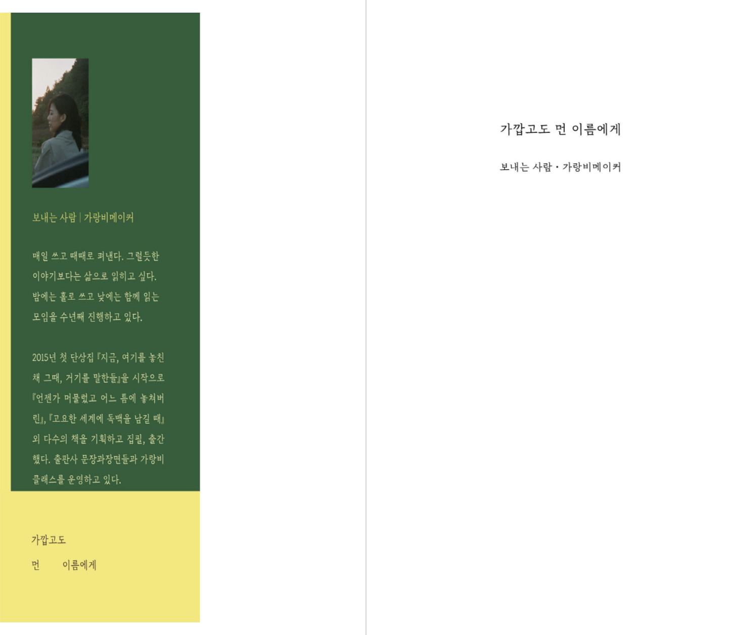 가랑비메이커의 3년 만의 신간 『가깝고도 먼 이름에게』는 3년이라는 공백의 시간을 통해 침묵으로 쓴 편지들의 집합이다. 매일 모니터 앞에서, 사람들 앞에서 수많은 문장을 내놓아야 하는 작가라는 직업에 대한 깊은 사유를 하던 어느 계절, 우연히 발견한 부치지 못한 편지들에서 책 『가깝고도 먼 이름에게』가 시작되었다.