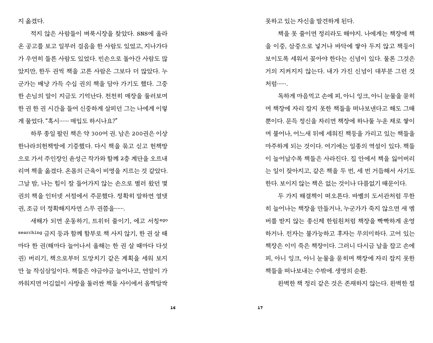 그리고 충분히 교감했으면 버린다. (……) 삶이 유한하기에 소중하듯 책도 그러기를 바란다. 절판된 책은 어디에서든 구할 수 없기를 바란다. 그래서 버린다. 안락사이다. (디자이너 심우진)