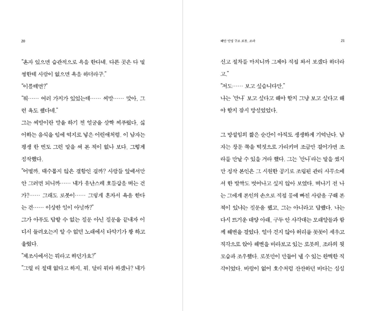 “도청을 하라는 건가요?” 아이 엄마가 침을 삼키는 소리가 들렸다. “문제가 될 건 없습니다. 아이에게서 동의를 얻었다고 하면 그만이니까요.” “바셀미는요? 바셀미의 동의는 얻지 않아도 되나요?” “로봇의 동의는 구하지 않아도 괜찮습니다, 법적으로요.”