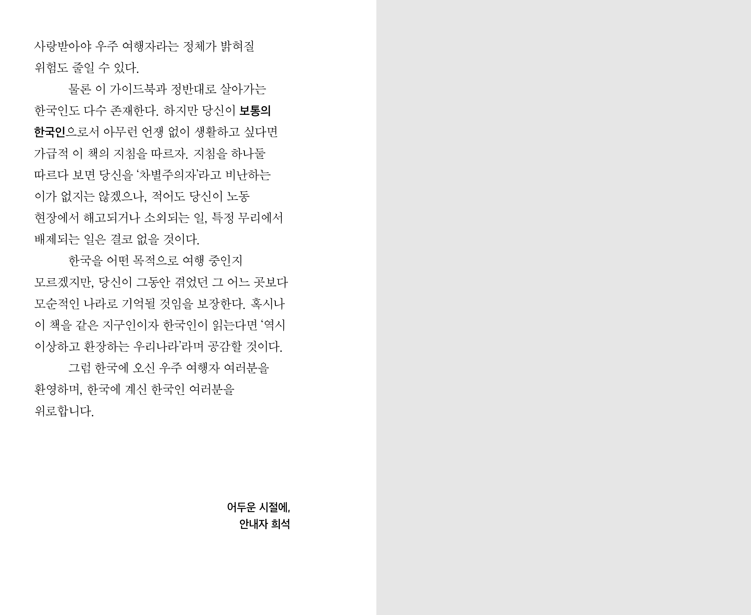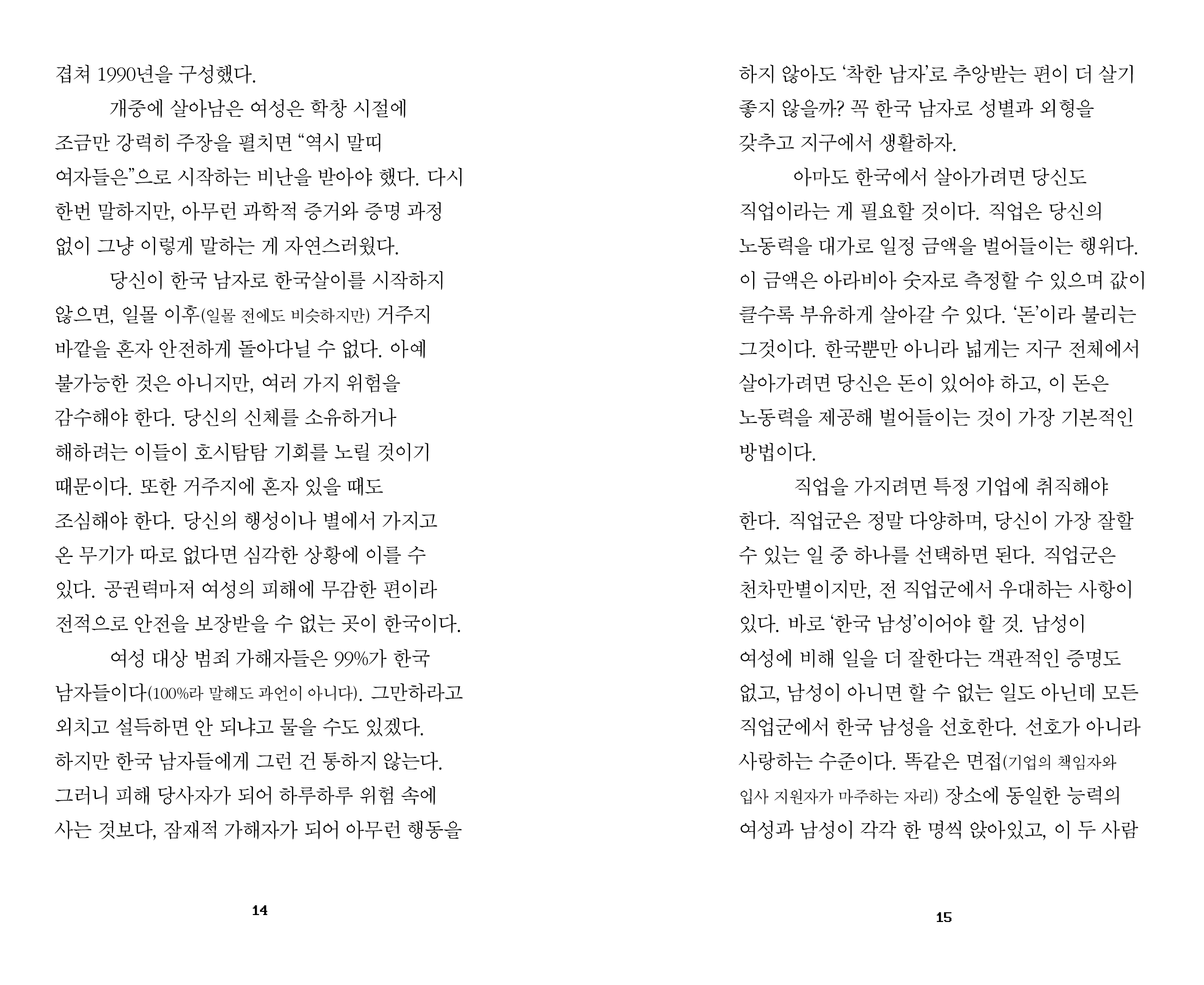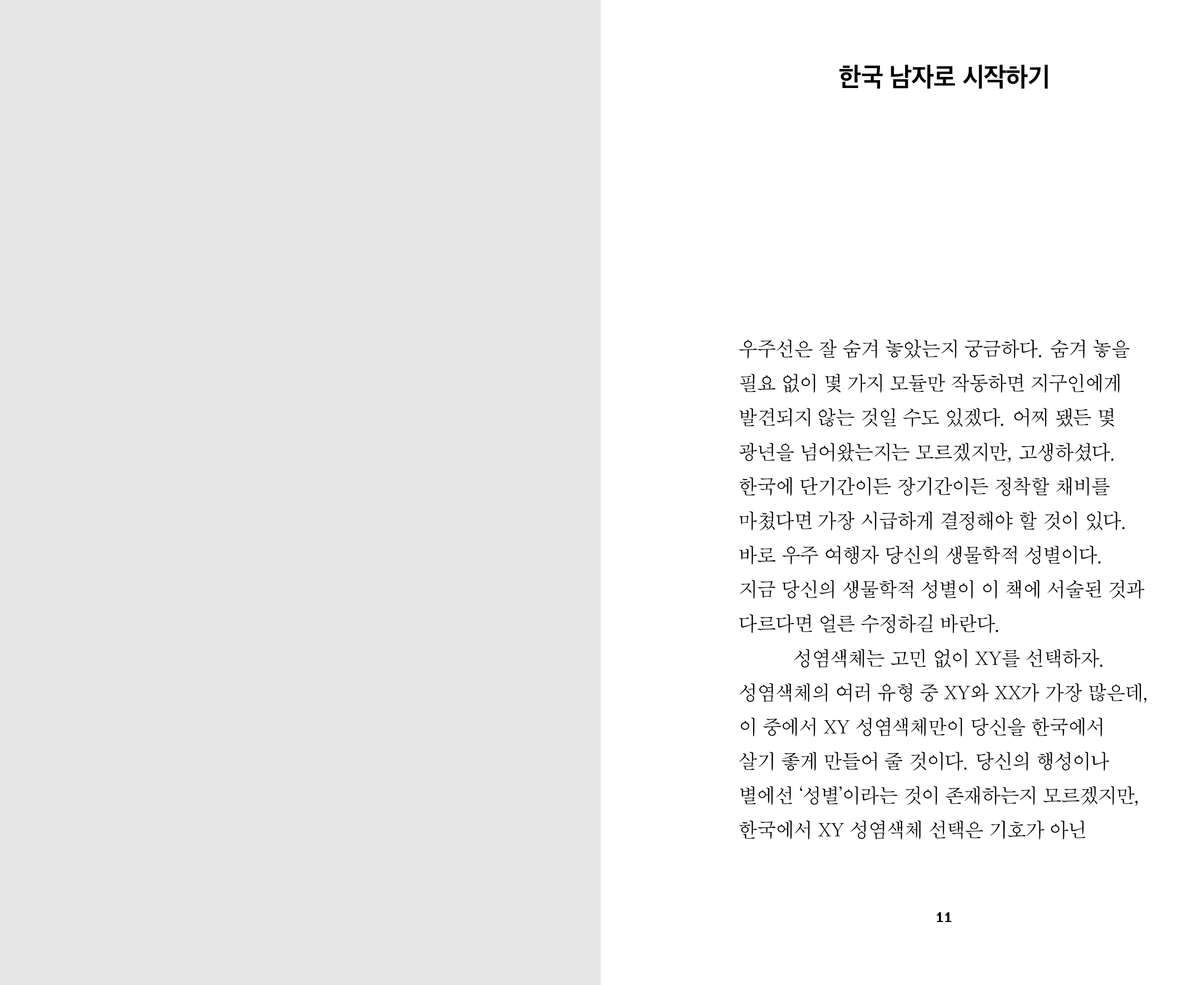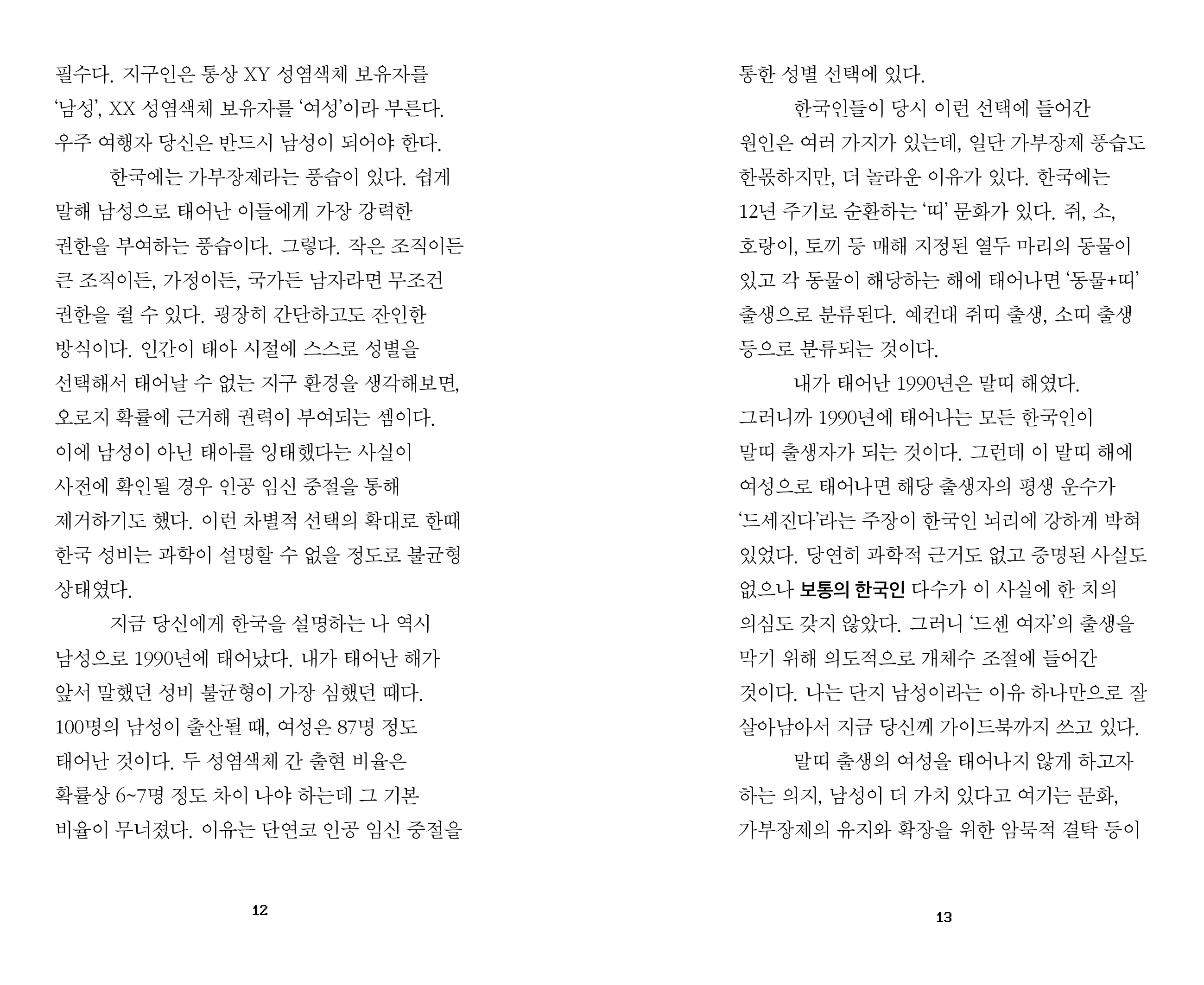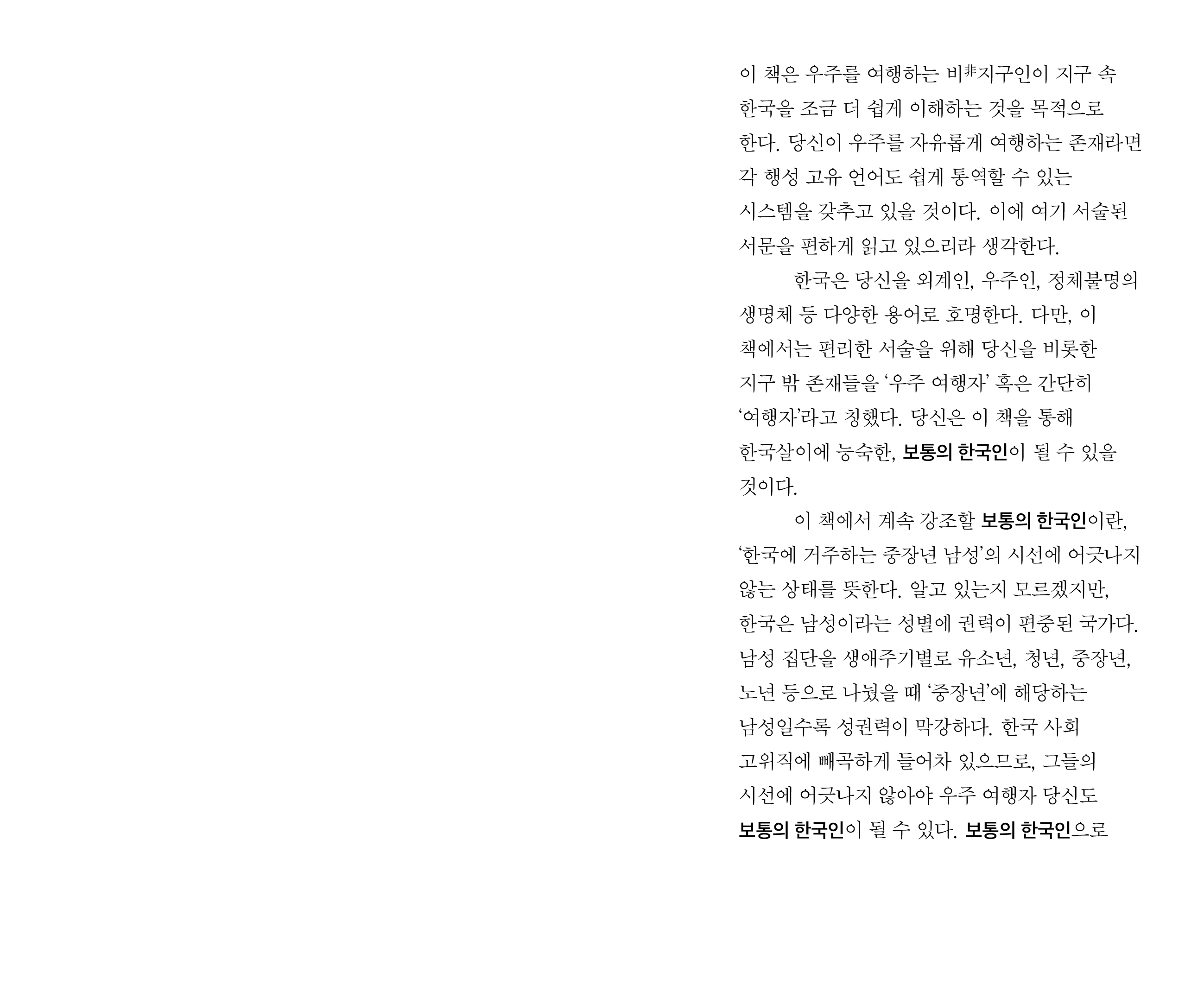 이 책은 우주를 여행하는 비(非)지구인이 지구 속 한국을 조금 더 쉽게 이해하는 것을 목적으로 한다. (중략) 이 책에서 계속 강조할 ‘보통의 한국인’이란, ‘한국에 거주하는 중장년 남성’의 시선에 어긋나지 않는 상태를 뜻한다. 알고 있는지 모르겠지만, 한국은 남성이라는 성별에 권력이 편중된 국가다. 남성 집단을 생애주기별로 유소년, 청년, 중장년, 노년 등으로 나눴을 때 ‘중장년’에 해당하는 남성일수록 성권력이 막강하다. 한국 사회 고위직에 빼곡하게 들어차 있으므로, 그들의 시선에 어긋나지 않아야 우주 여행자 당신도 보통의 한국인이 될 수 있다.