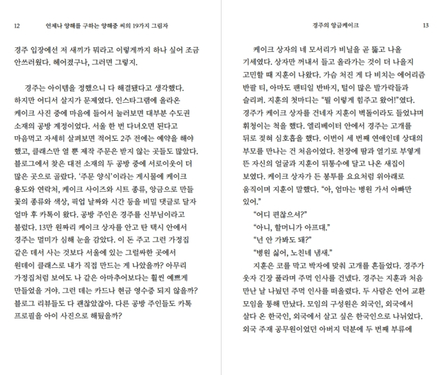 『언제나 양해를 구하는 양해중 씨의 19가지 그림자』는 타인의 삶에 남긴 양해의 몇 마디를 통해 ‘양해중’이라는 인물을 짐작해보는 19편의 연작 소설이다. 양해중 씨가 때마다 내린 결정 및 이로 인해 구하게 된 양해와 직ㆍ간접적으로 연결된 사건들 속에서 한 사람이 가질 수 있는 여러 형태의 그림자를 비춰본다.