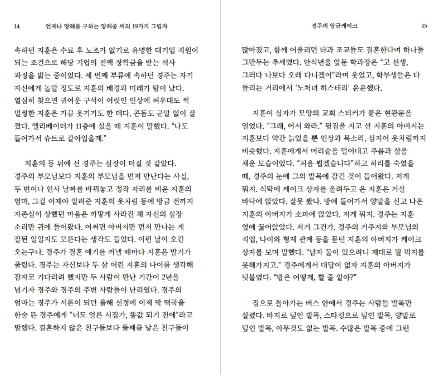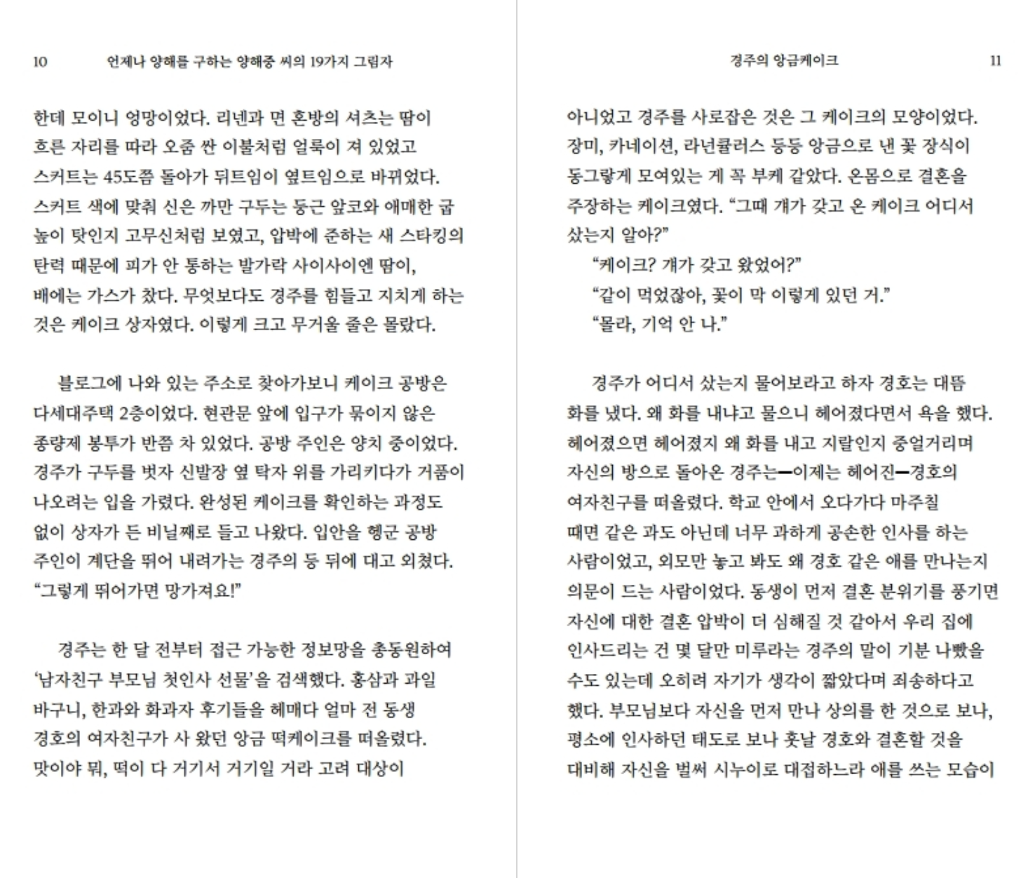 p.11 : 부모님보다 자신을 먼저 만나 상의를 한 것으로 보나, 평소에 인사하던 태도로 보나 훗날 경호와 결혼할 것을 대비해 자신을 벌써 시누이로 대접하느라 애를 쓰는 모습이 경주 입장에선 저 새끼가 뭐라고 이렇게까지 하나 싶어 안쓰러웠다.