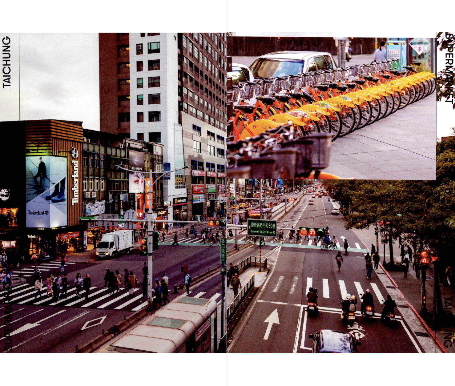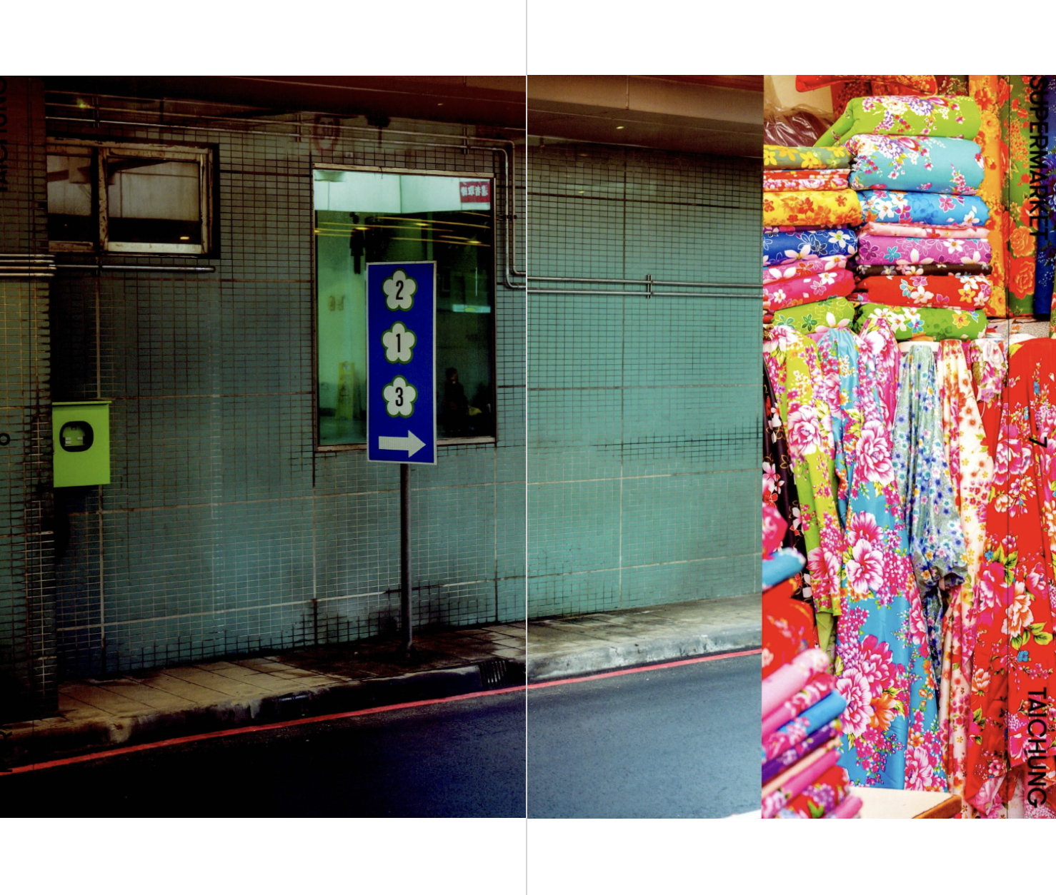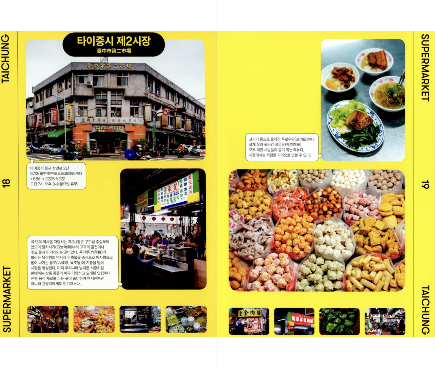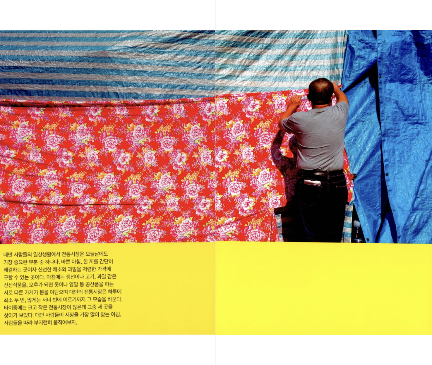 대만 사람들의 일상생활에서 전통시장은 오늘날에도 가장 중요한 부분 중 하나다. 바쁜 아침, 한 끼를 간단히 해결하는 곳이자 신선한 채소와 과일을 저렴한 가격에 구할 수 있는 곳이다. 아침에는 생선이나 고기, 과일 같은 신선식품을, 오후가 되면 옷이나 양말 등 공산품을 파는 서로 다른 가게가 문을 여닫으며 대만의 전통시장은 하루에 최소 두 번, 많게는 서너 번에 이르기까지 그 모습을 바꾼다. - 16쪽, ‘LOCAL MARKET IN TAICHUNG’ 중에서