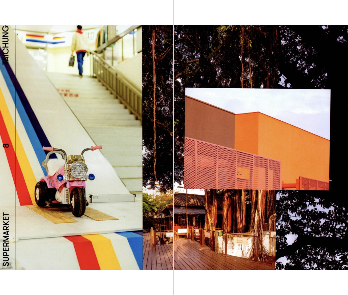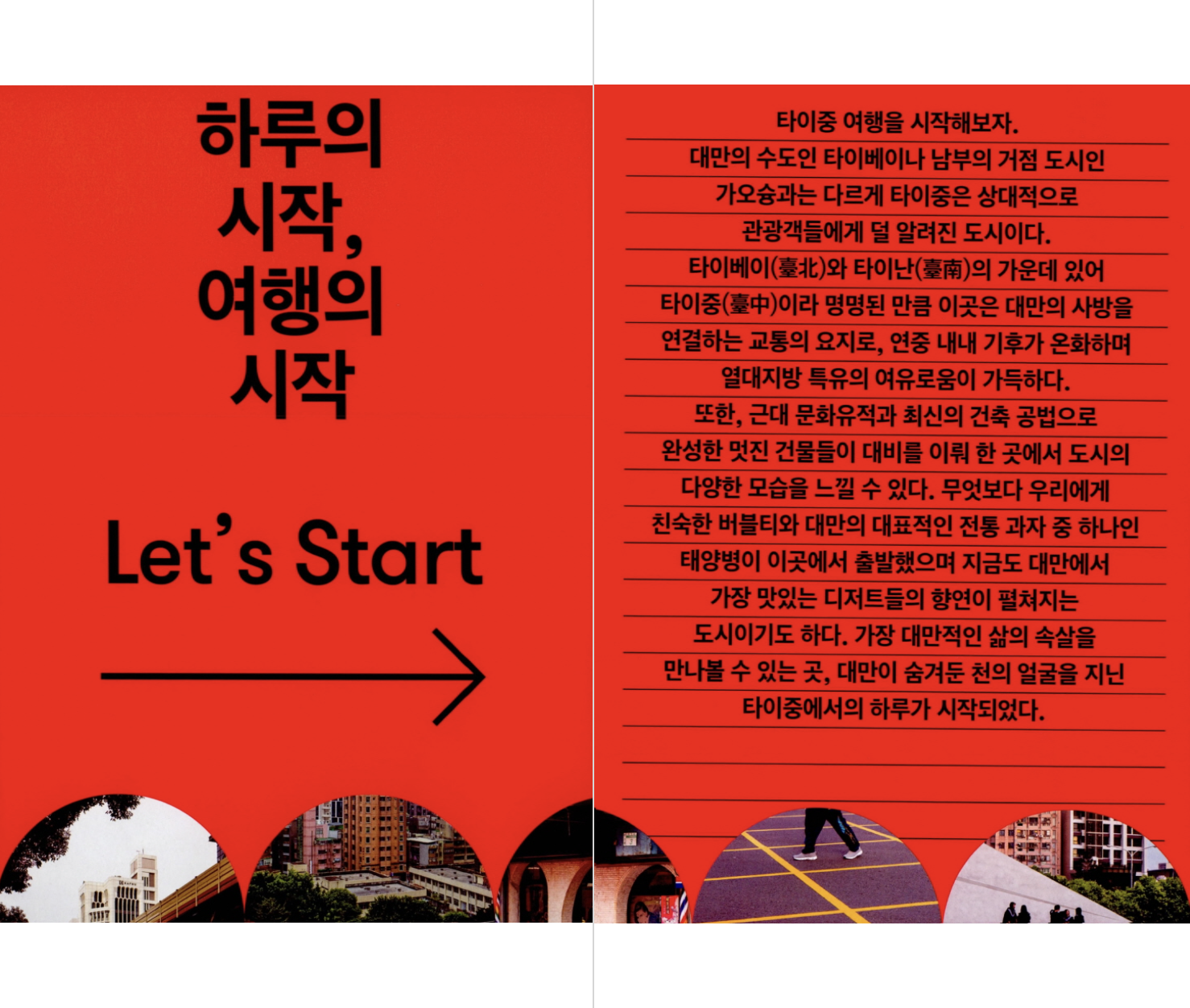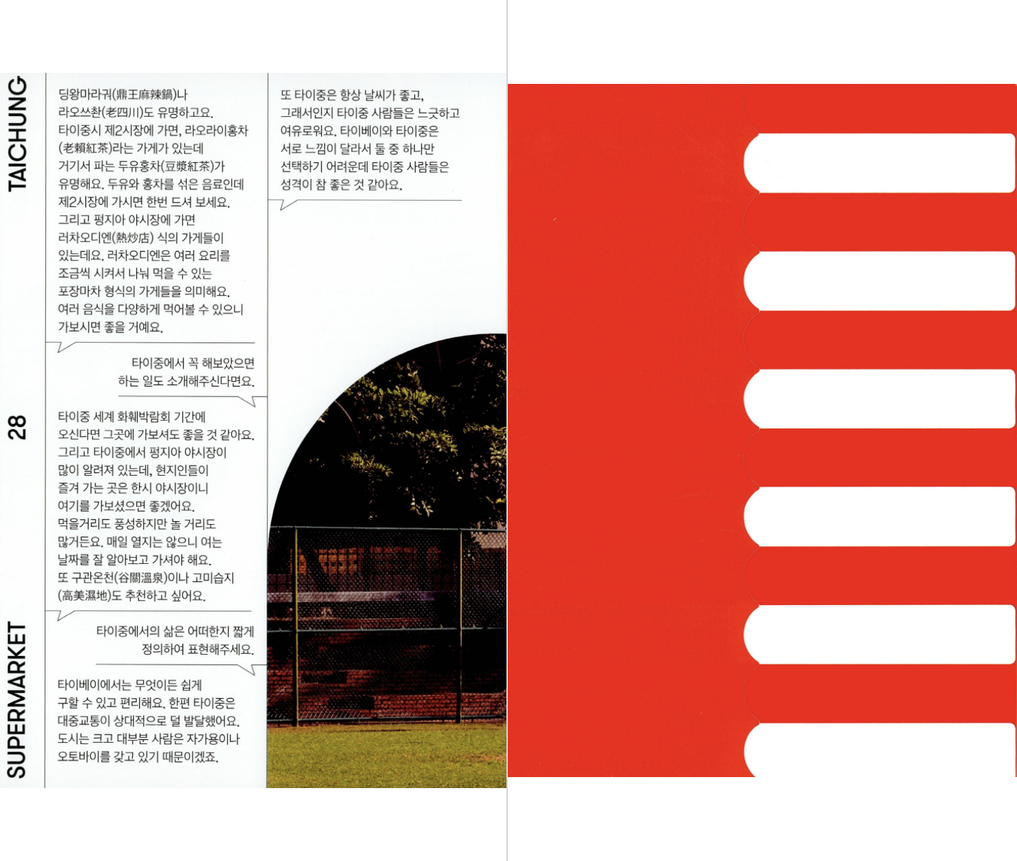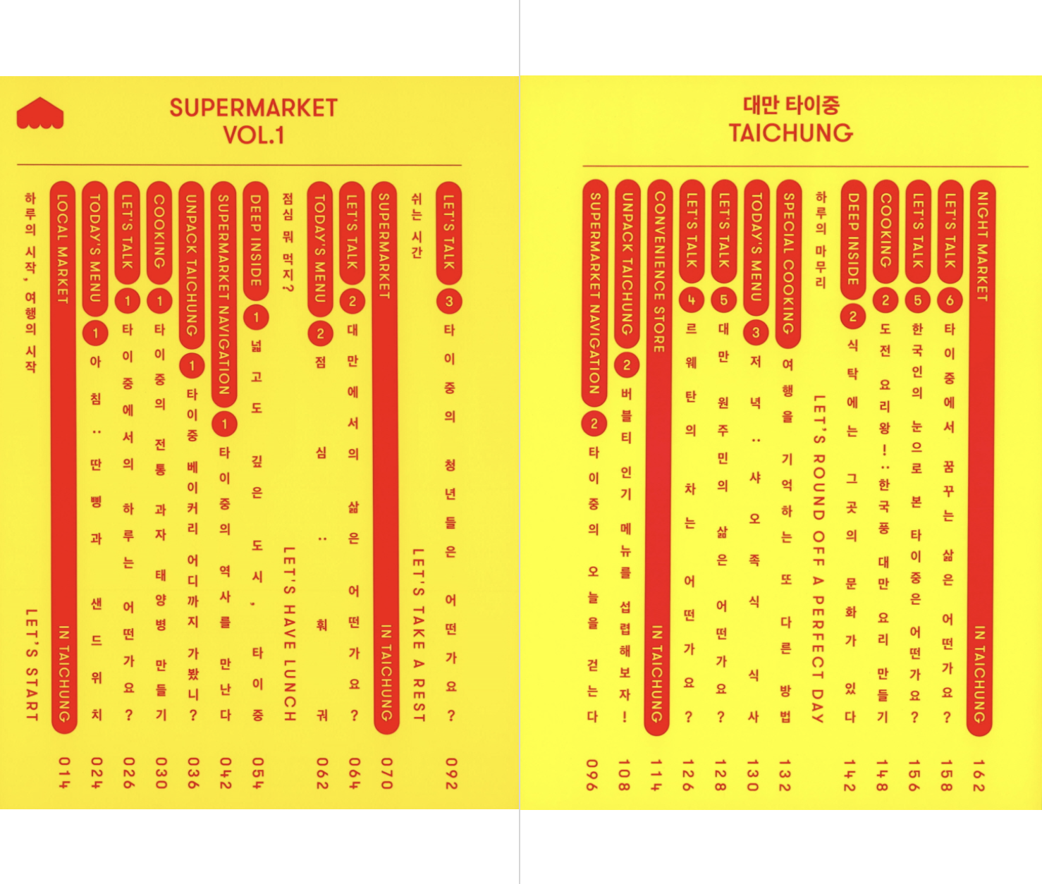 대만 사람들의 일상생활에서 전통시장은 오늘날에도 가장 중요한 부분 중 하나다. 바쁜 아침, 한 끼를 간단히 해결하는 곳이자 신선한 채소와 과일을 저렴한 가격에 구할 수 있는 곳이다. 아침에는 생선이나 고기, 과일 같은 신선식품을, 오후가 되면 옷이나 양말 등 공산품을 파는 서로 다른 가게가 문을 여닫으며 대만의 전통시장은 하루에 최소 두 번, 많게는 서너 번에 이르기까지 그 모습을 바꾼다. - 16쪽, ‘LOCAL MARKET IN TAICHUNG’ 중에서