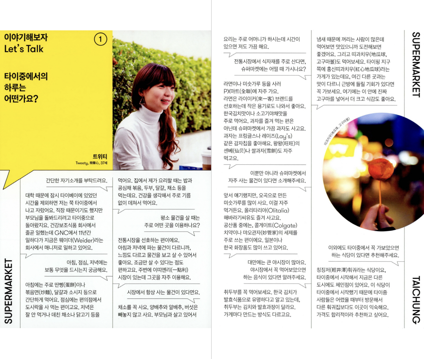 “타이베이와 타이중은 서로 느낌이 달라서 둘 중 하나만 선택하기 어려운데 타이중 사람들은 성격이 참 좋은 것 같아요.” - 29쪽, ‘타이중에서의 하루는 어떤가요? - 트위티’ 중에서