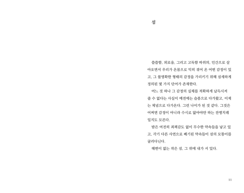 아무도 없는 바다. 연극 무대처럼 준비된 세계. 먼 훗날의 그림자처럼 드리우는 너. 차마 커튼을 내리지 못하는 나. 마지막 빛이 떠나간 바다 위로 비가 내린다. 모든 것이 사라졌지만 사라진 것은 아무것도 없었다. 파도는 미스터리를 실어 나른다. 아무렇게나 휘두른 물감들이 우리를 흠뻑 물들였다. 수만 번의 여름, 수만 번의 겨울. 나는 너를 기다리고 싶었다. 너는 나를 기다릴 수 있을까.