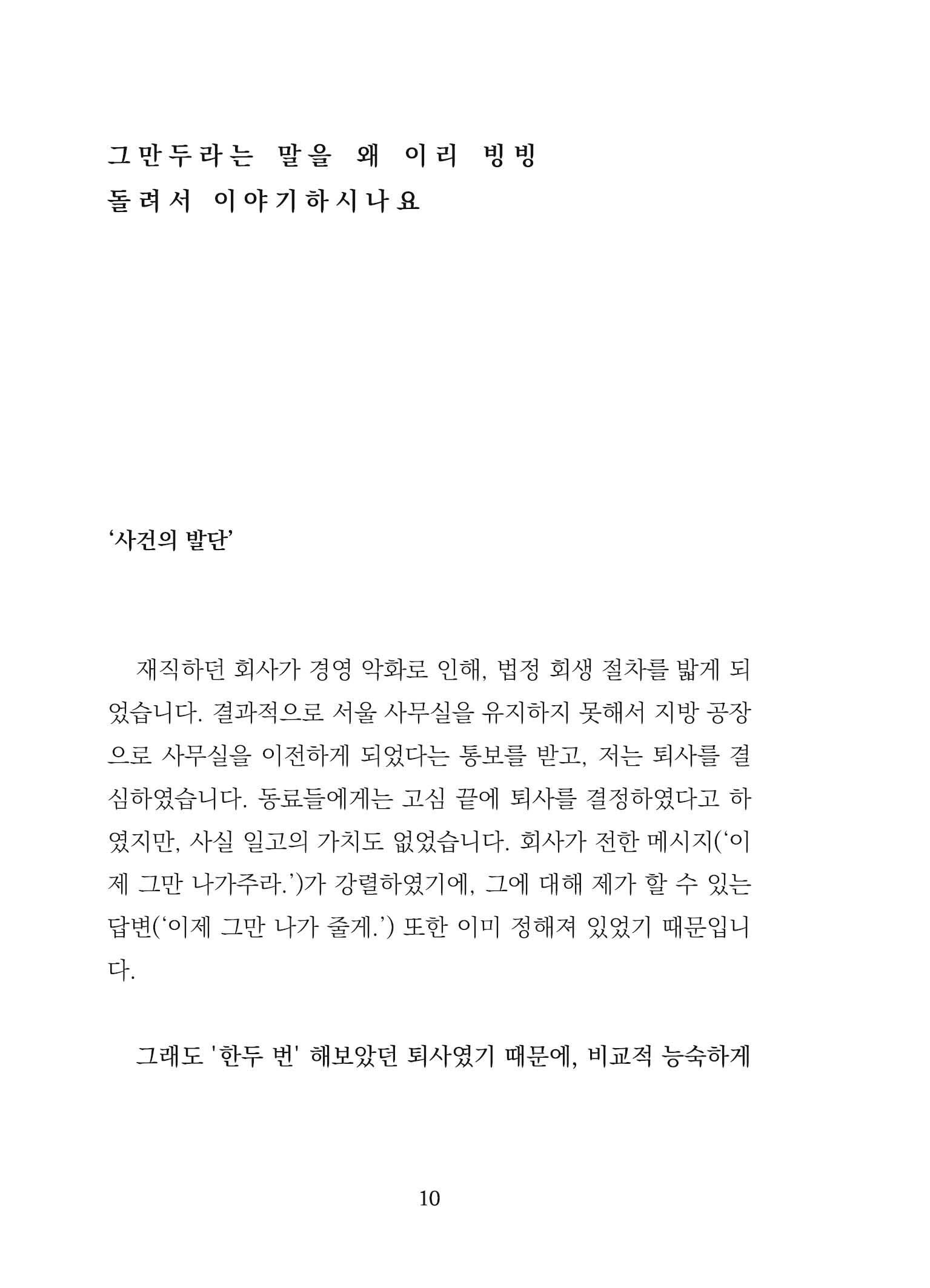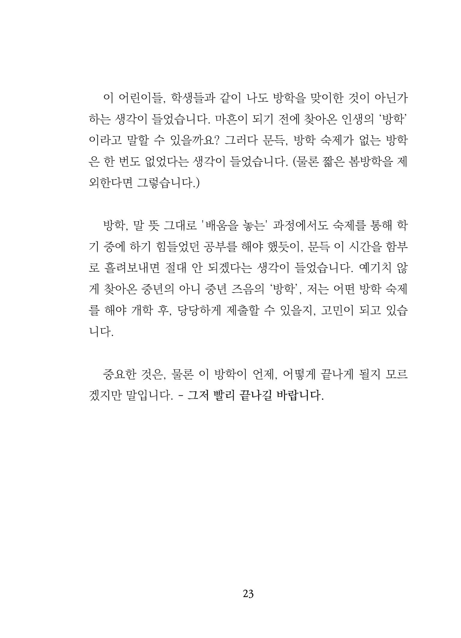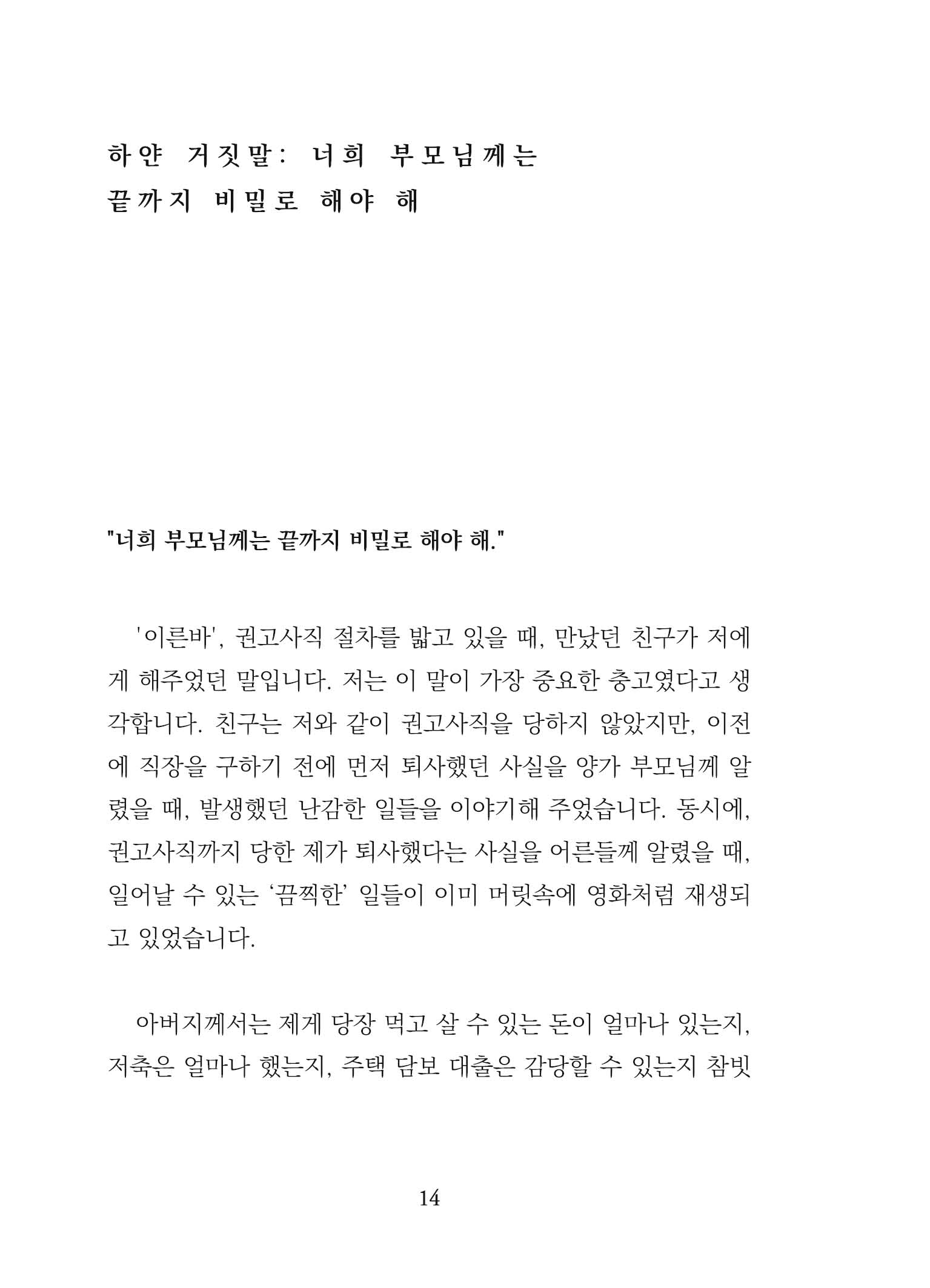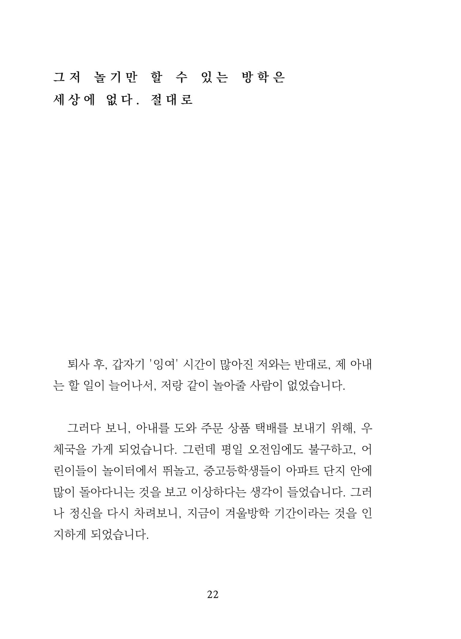 한때 '작가'가 꿈이던 평범한 회사원 사호. 잘나가던 회사가 하루아침에 망했습니다. 이 글은 예기치 않은 인생의 방학을 맞이한 그의 지극히 개인적인 징비록입니다. 그동안 비밀로 할 수밖에 없었던 퇴사에 관한 사호의 웃픈 이야기와 그의 아내가 그린 귀여운 삽화들로 구성된 사호/정화백 부부 작가의 첫 공동 에세이입니다.