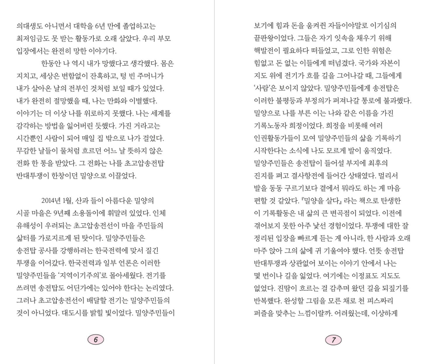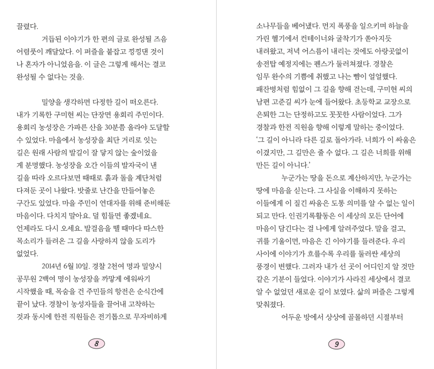 이 장면에서 나는 나와 동료들이 함께해온 인권기록활동의 여러 장면들을 떠올렸다. 생애를 뒤흔드는 종류의 사회적 고통을 경험한 사람들이 그저 말하는 것만으로 치유될 거란 생각은 통하지 않았다. 적어도 내 경험으로는 그랬다. 사랑하는 사람을 느닷없이 잃은 사람들, 수용 시설에 갇혀 가혹한 폭력을 당한 사람들, 끔찍한 사고에서 생존한 사람들의 이야기를 들을 때 나는 늘 죄의식 비슷한 감정을 느껴야 했다. 그들이 자신의 상처에 대해 말한다는 건 그 상처를 다시 헤집기를 무릅쓰는 일이었으므로. 그럼에도 불구하고 그들과 우리가 대화를 그만두지 않았던 이유는 무엇일까.