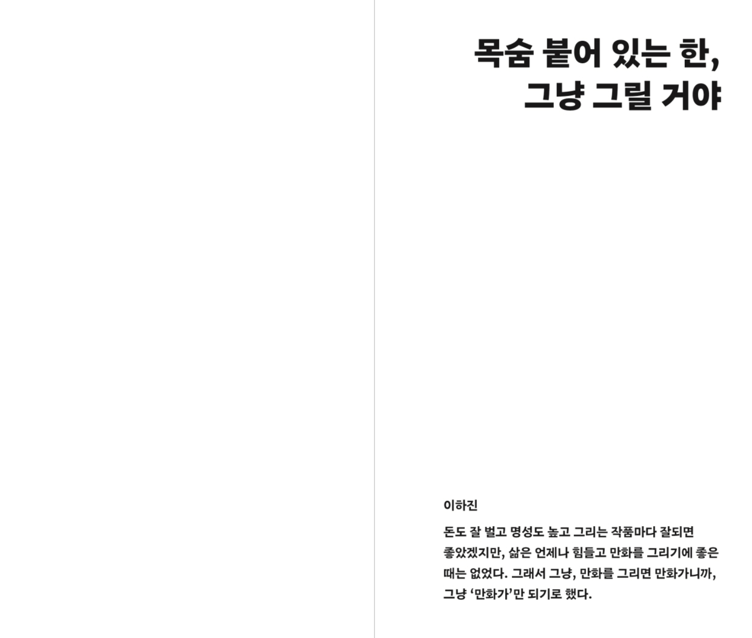 “내가 실패를 하도 많이 해서 그런가, 되는대로 살자는 마음이야. 이제 나이도 많은데 뭐. 인생이라는 게 그렇게 계획할 수 있는 게 많지 않아. 난 목숨 붙어 있는 한 그냥 그릴 거야. 만화 그리면 만화가 아닌가. 내 사주에 ‘수’기가 없다고 했잖아. 그건 내가 예술가로 성공할 사주가 아니라는 뜻이기도 해. 만화가로 성공하지 못할 사주라고 하니까 마음이 편해지더라. 그래, 나는 원래 디폴트가 그거지(웃음).”