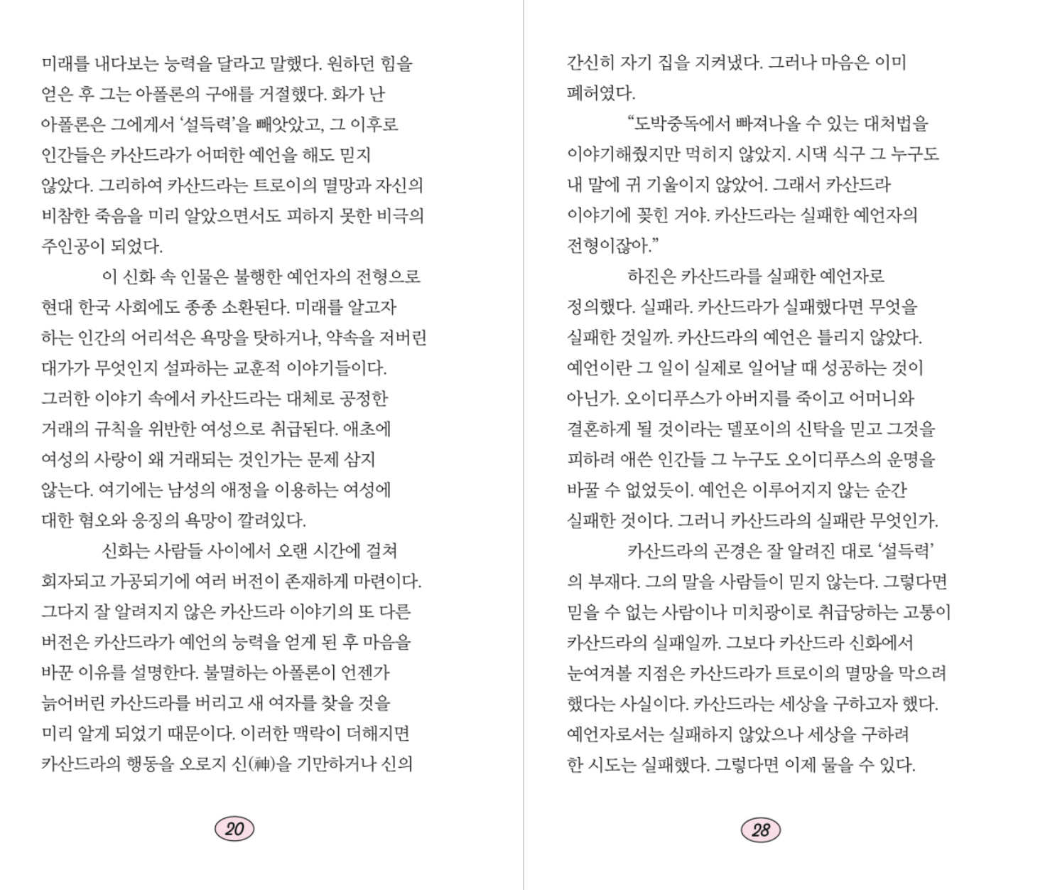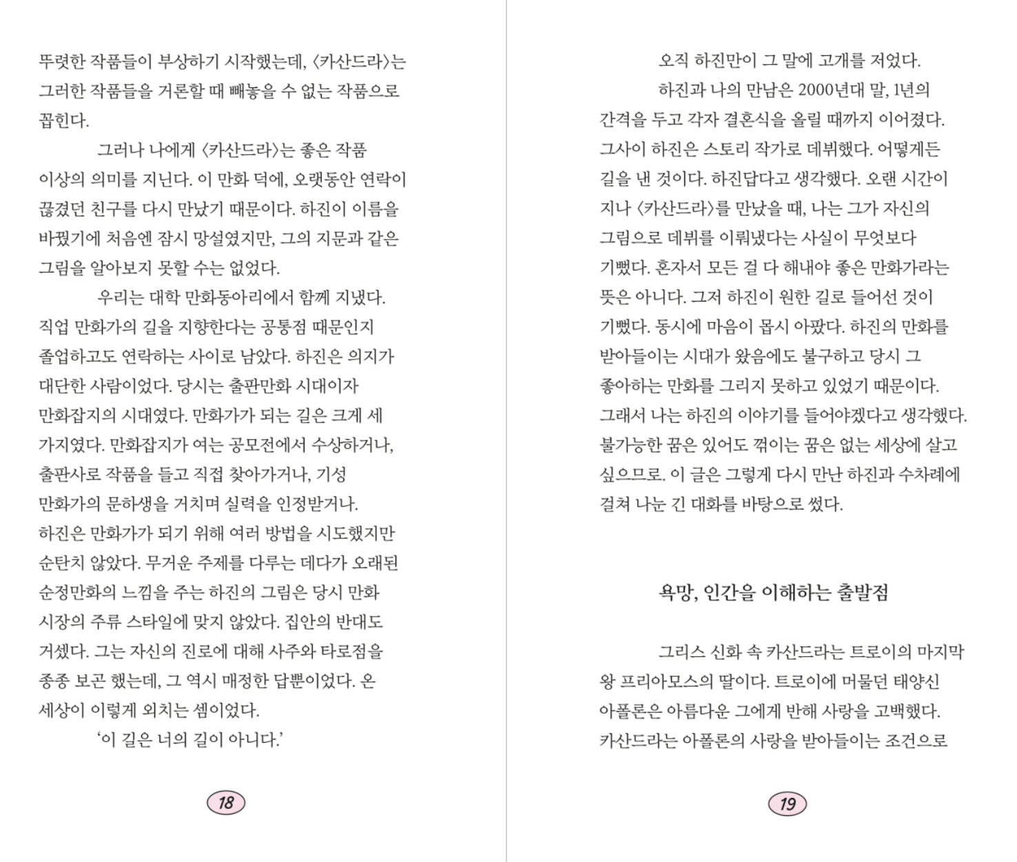 먼저 저자는 저마다 다른 삶의 슬픔과 기쁨을 버텨내온 다양한 나이대 여성 창작자들의 ‘작지만 위대한’ 역사를 추적한다. 그들이 그려내는 만화 속 인물은, 우리가 익히 보아온 소년만화 혹은 순정만화 속 클리셰 인물들하고는 거리가 멀다. 지혜를 인정받고 진정한 예언가로 다시 태어난 신화 속 여성 카산드라부터, 독박육아를 상세하게 기록하며 그에 대한 ‘화’를 사회 공통의 문제로 인식하기 시작하는 젖먹이 엄마, 자기가 나고 자란 땅과 엄마로부터 독립하는 젊은 여성, 고독사라는 인생의 마지막 위기를 앞에 두고 방법을 찾아나가는 비수도권 소도시의 각계각층 노인들, ‘중2병’이라는 혐오의 주요 피해자이지만 첫사랑을 통해 다른 세계와 접속하는 열다섯 살 소녀까지, 이 다양한 인물들은 또 저마다 복잡한 궤적을 그리며 여성 작가의 삶과 풍부하게 결합한다.