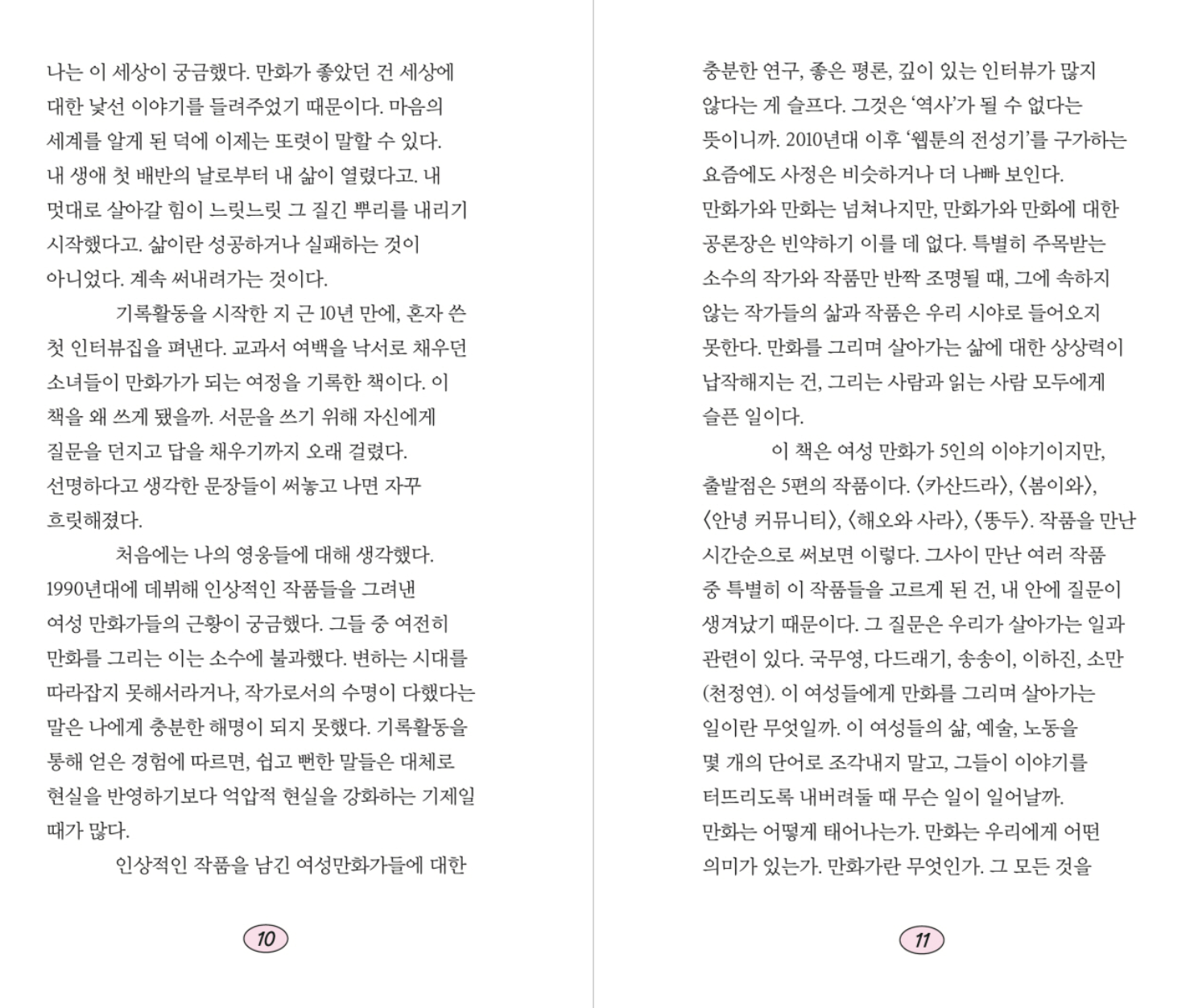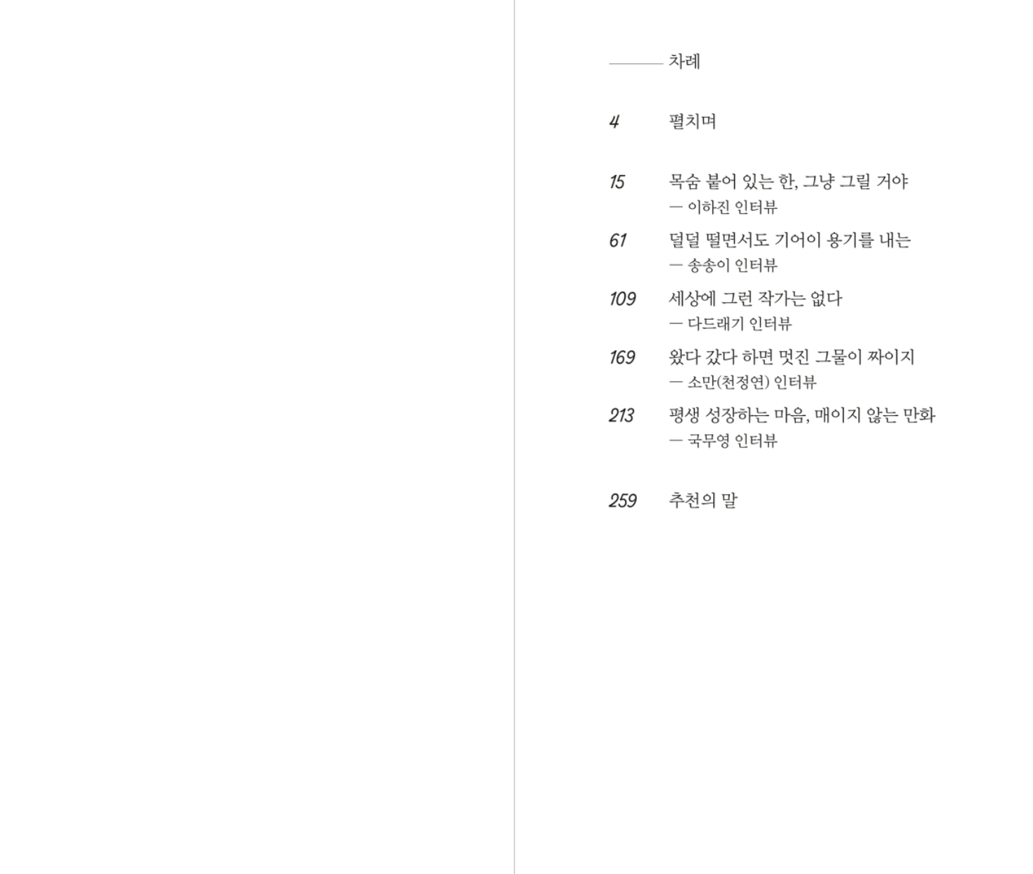 이 책의 특이점을 하나 꼽자면 저자의 이력이다. 인권기록활동가라는, 만화 독자들에게는 조금 낯설지도 모르는 직업 말이다. 저자는 10년 가까이 인권이 무너지고 있는 현장 또는 참사 생존자들을 취재해 그들의 억눌린 목소리를 듣고 기록하고 사회에 알리는 일을 해왔다. 그런 그가 10년 만에 펴내는 첫 단독 인터뷰집의 주제가 의외로 ‘만화’였던 것은 알고 보면 필연이다. 그 자신이 어릴 때부터 대학 때까지 직업 만화가를 꿈꿨으며 현재도 만화가로서의 자의식을 소중히 지키고 있는 사람이기 때문이다. 그래서 이 책에는 인권기록활동가가 아닌 다른 기자나 업계 종사자였다면 담아내기 어려웠을 법한 삶과 사유의 두께가 더해져 있다. 단지 만화의 스토리와 등장인물의 이야기 외에도 그것을 창조한 만화가 자신과 주변의 이야기, 자기 삶과의 교차 지점을 응시하며 사유하는 인터뷰어 즉 저자의 이야기까지, 우리가 상상할 수 있는 것보다 더 넓고 깊은 정체성의 서사들이 가득 얽혀 있다.
