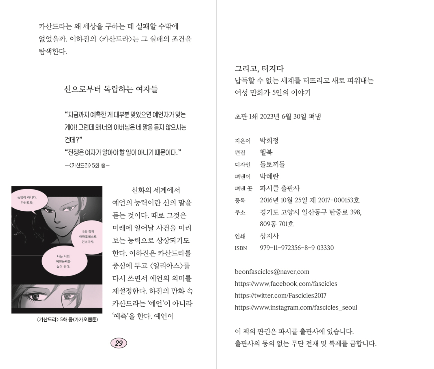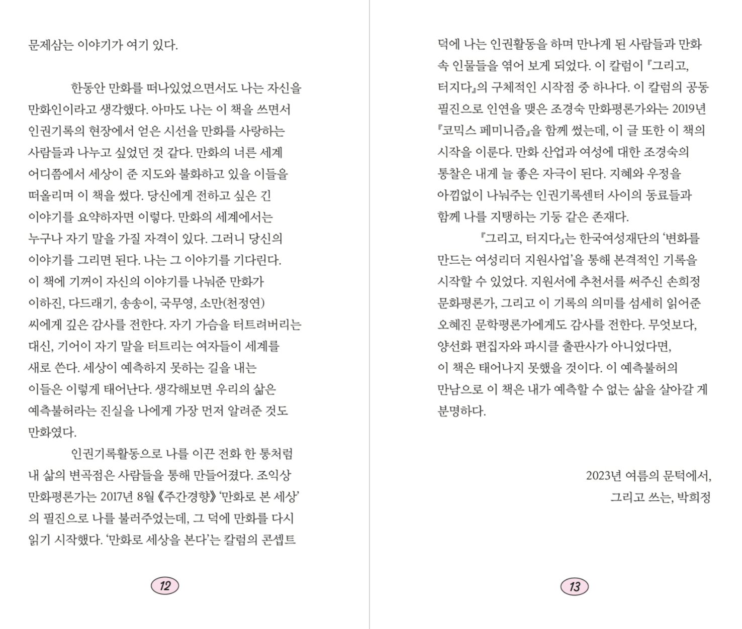 이 책에 기꺼이 자신의 이야기를 나눠준 만화가 이하진, 다드래기, 송송이, 국무영, 소만(천정연) 씨에게 깊은 감사를 전한다. 자기 가슴을 터트려버리는 대신, 기어이 자기 말을 터트리는 여자들이 세계를 새로 쓴다.