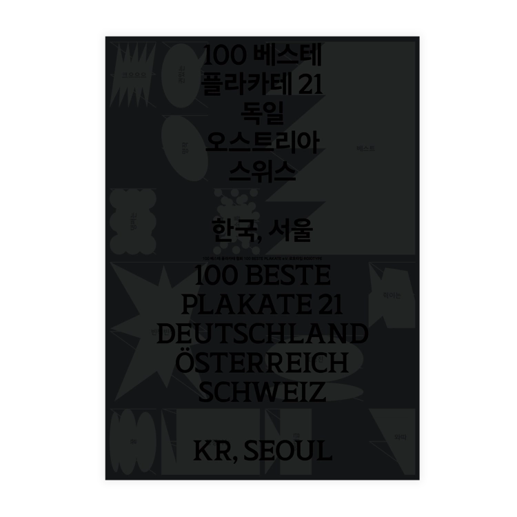 '100 베스테 플라카테'는 2001년 부터 시작된 공모전으로 독일, 오스트리아, 스위스 독일어권 3개국 내에서 제작되거나 디자인된 다양한 기법의 포스터 작품 100점을 선정합니다. '100 베스테 플라카테 21 독일 오스트리아 스위스 한국, 서울' 한국 전시 도록은 2021년에 전시된 포스터를 보여주는 동시에 포스터에 관한 콘텐츠를 담고 있는 책입니다.