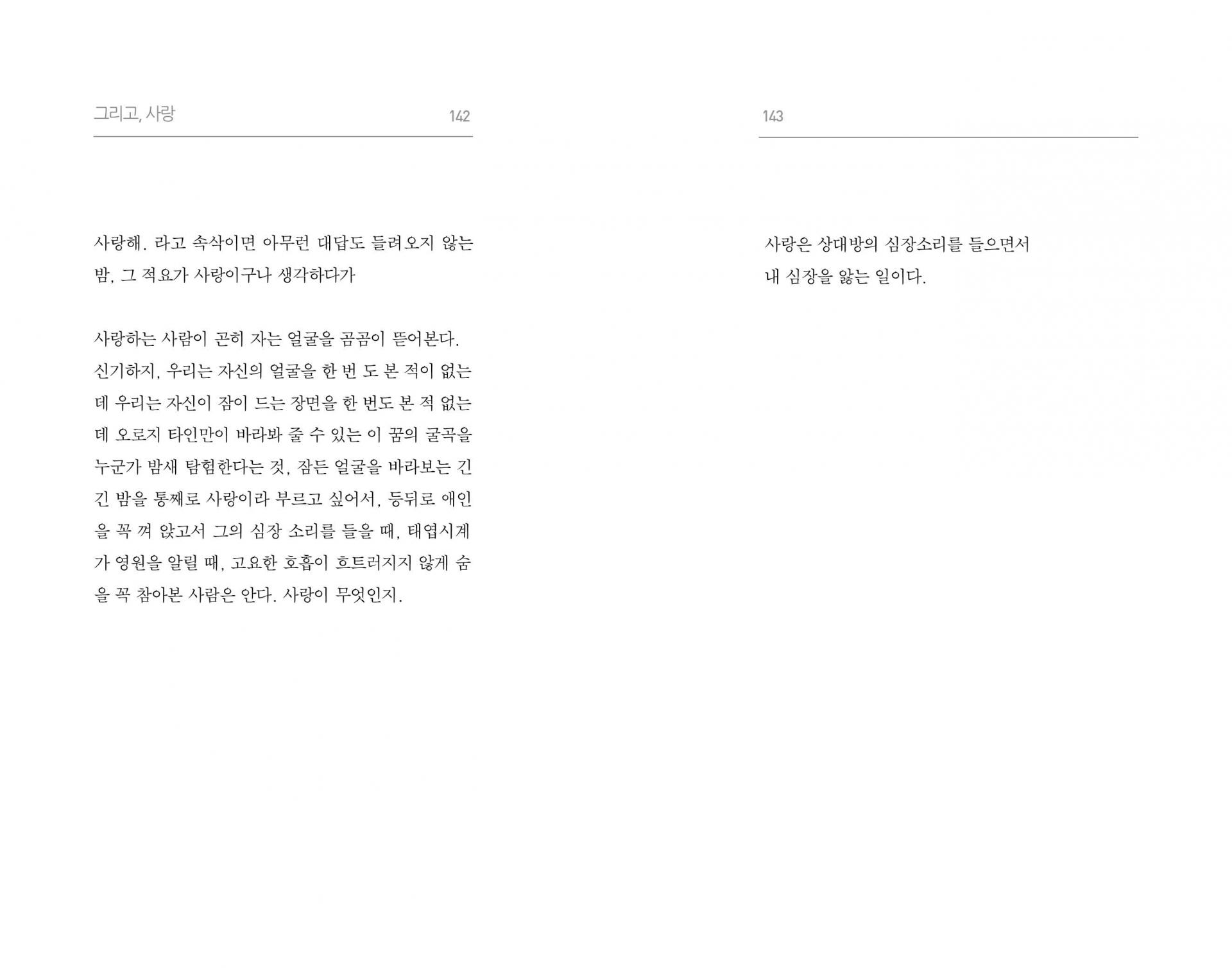 사랑을 말하며 사는 이곳이, 왠지 슬프기도 하지만, 사랑이 필요없는 완전한 세계에서 살아가는 것보다 더 아름다운 일 같다는 생각도 든다. 이별에 대한 유예 없이 무한을 살아가야 한다면, 마음도 없이 긴긴 생의 시간을 보내야 하는 세계가 있다면, 나에게는 그곳이 더 지옥 같기 때문에,