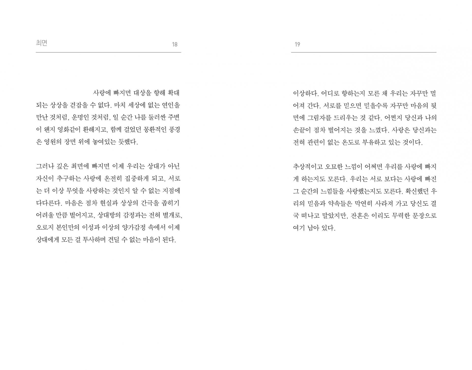 우리의 마음이 이제 더는 타오르지 않음을, 서로가 어느 시점에서부터인가 사라져 가고 있음을 느꼈다. 당신은 나에게서, 나는 당신에게서, 다시는 피우지 못할 불꽃처럼 까마득하게 사그라져 갔다. < 사랑이 사랑이기 이전에 도입부분 >