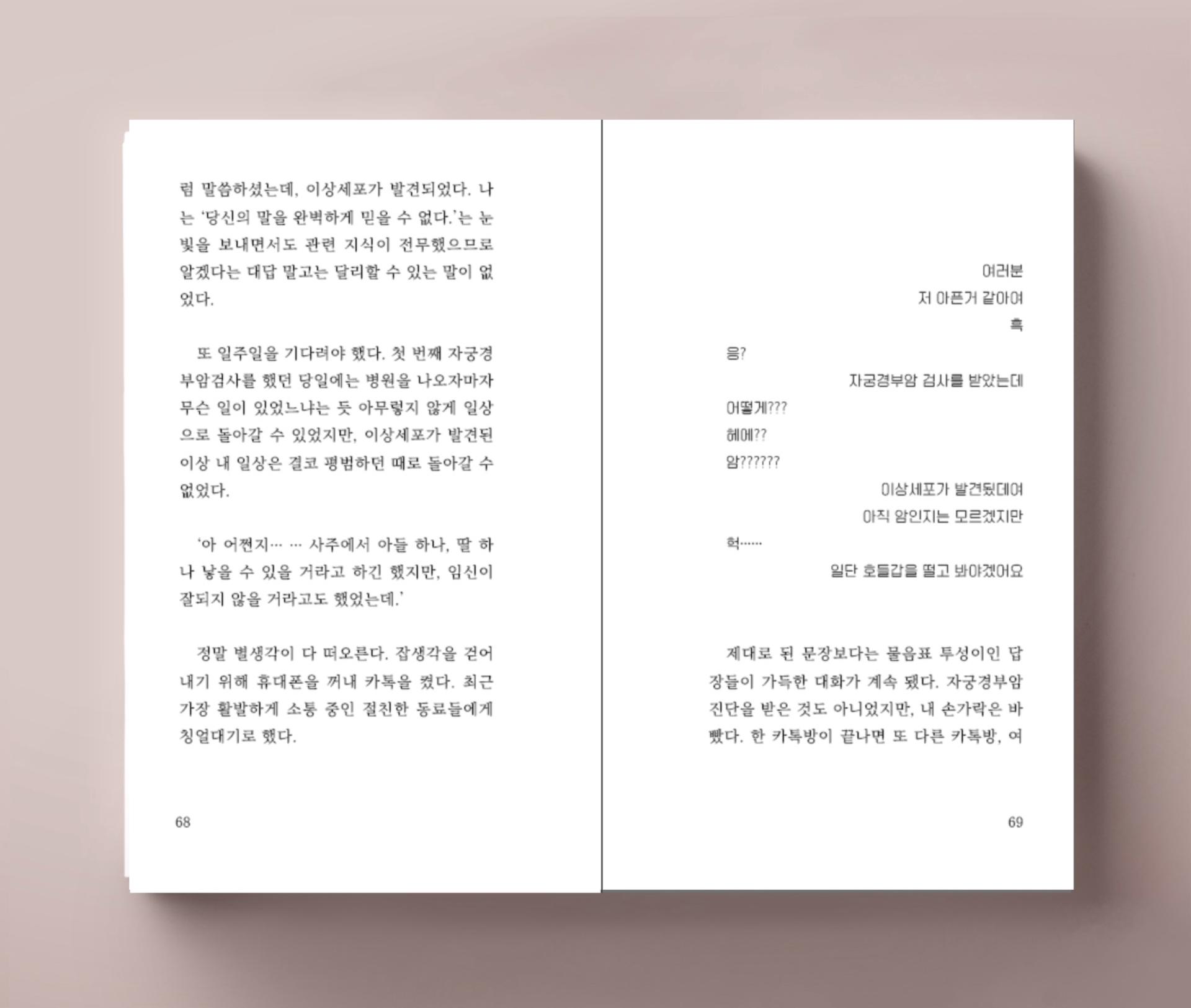 ‘이상 소견이 있습니다’는 자궁경부암 검사를 받은 후 달라진 일상을 겪으며 되돌아보는 자궁 경험담입니다. 자궁을 바라보는 예민한 인식이 조금이나마 아무렇지 않아지길 바라며 써내려갔습니다.