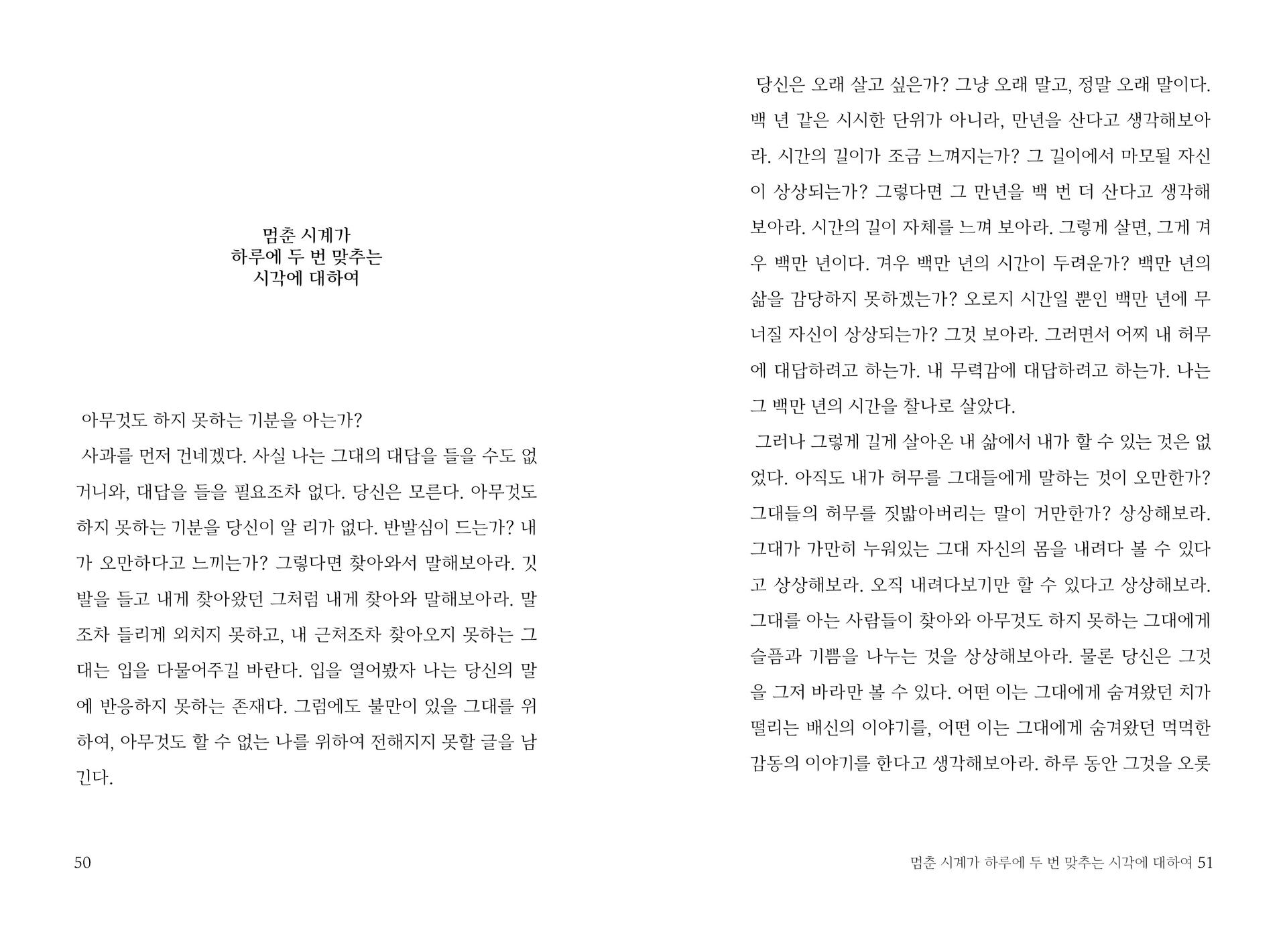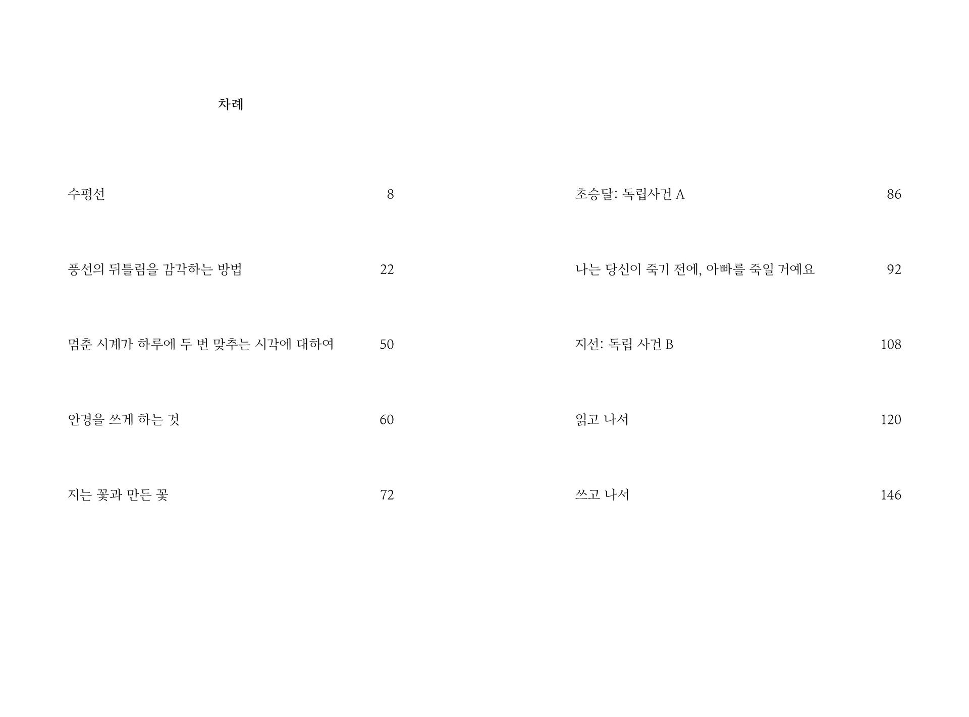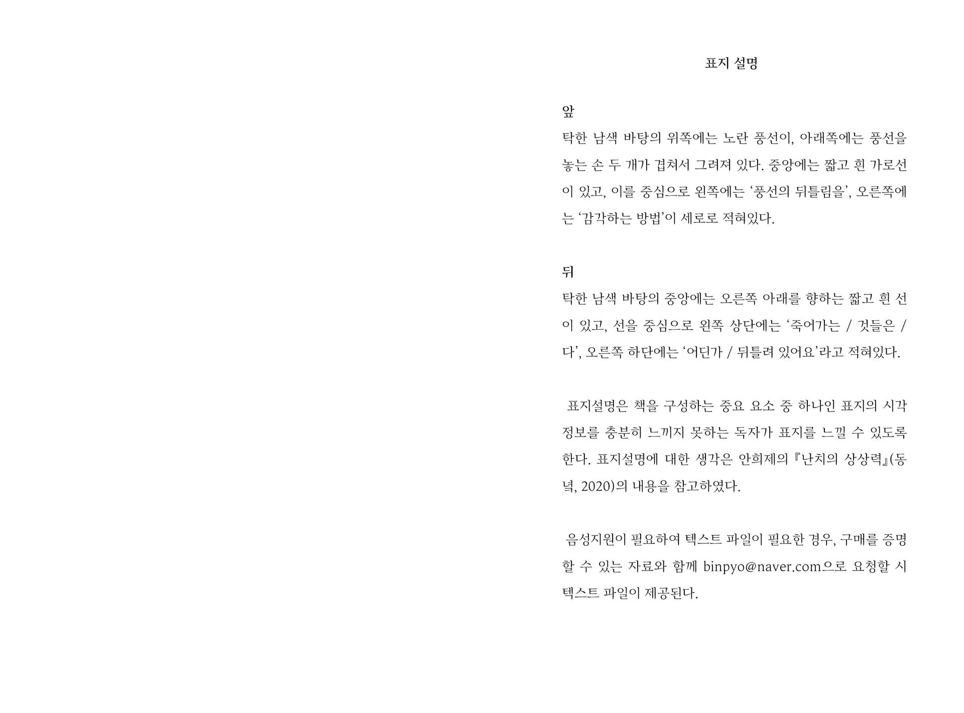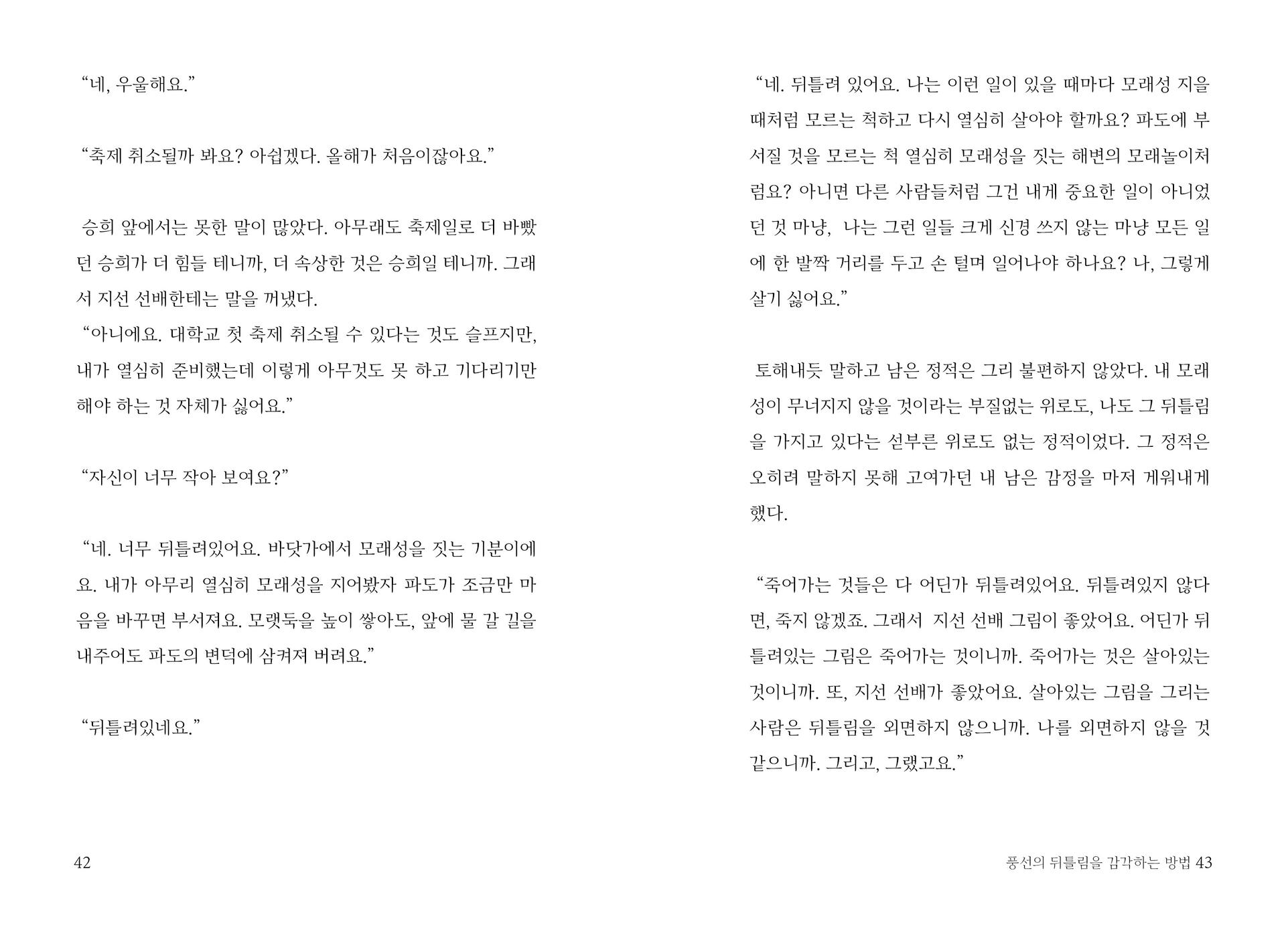 「풍선의 뒤틀림을 감각하는 방법」은 단편집이다. 같은 이름의 단편 소설을 쓰고 나니, 책이 쓰고 싶어졌다. 그래서 뒤틀림을 감각하는 소설들을 쓰고 모았다. 언젠가 바람이 빠지고 마는 풍선의 뒤틀림을, 언젠가 죽고 마는 사람의 뒤틀림을, 언젠가 죽지 못한 달의 뒤틀림을, 어떤 것들이 ‘당연하다’고 말하는 사회의 뒤틀림을 담았다. 소설에 등장하는 주인공들은 주어진 뒤틀림을 외면하지 않고, 혹은 외면하지 못하고 감각한다. 소설 밖의 더 많은 사람도, 우리 사회도 그랬으면 한다. 이 책이, 그 방법의 하나가 된다면, 그것참 좋겠다.