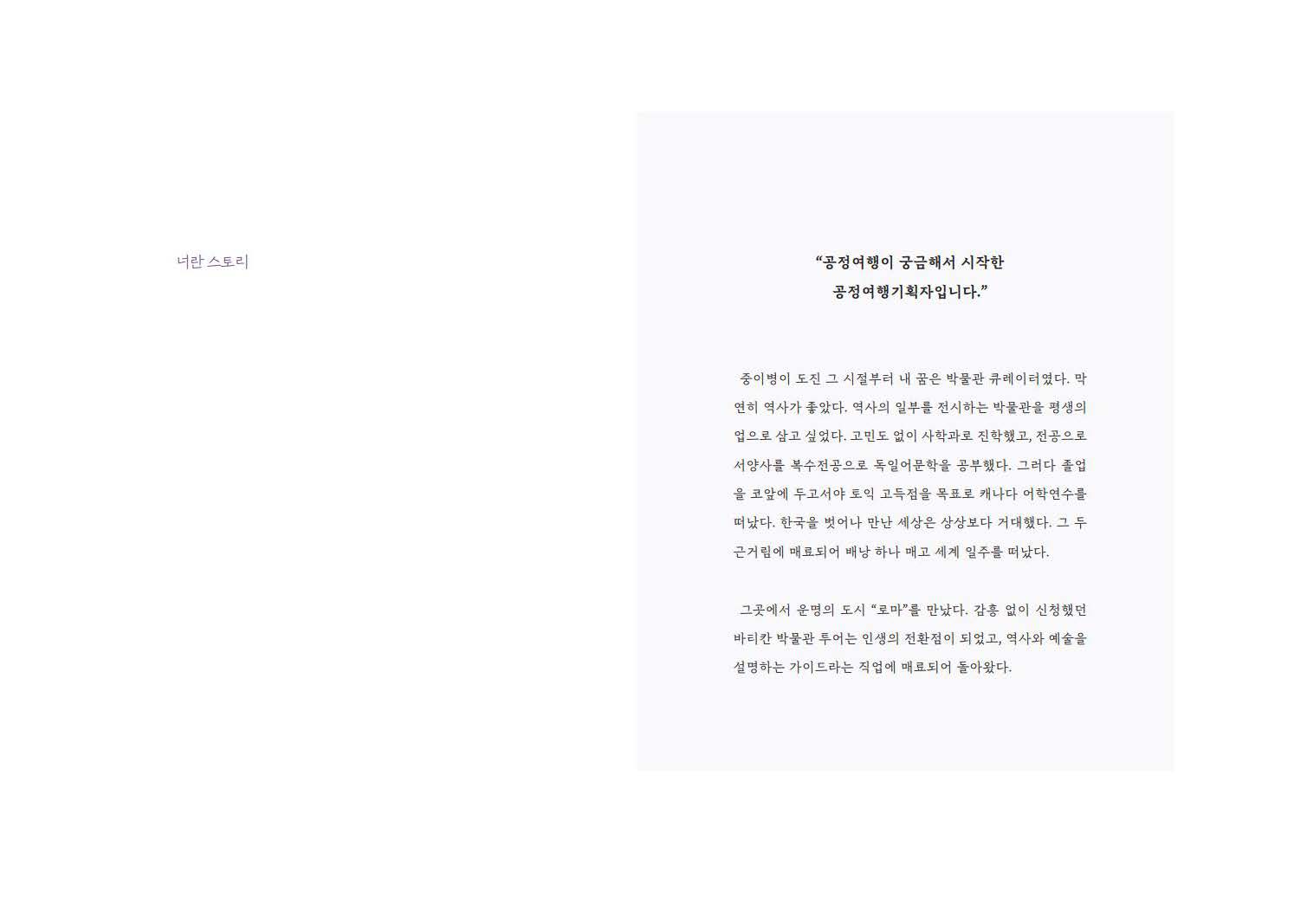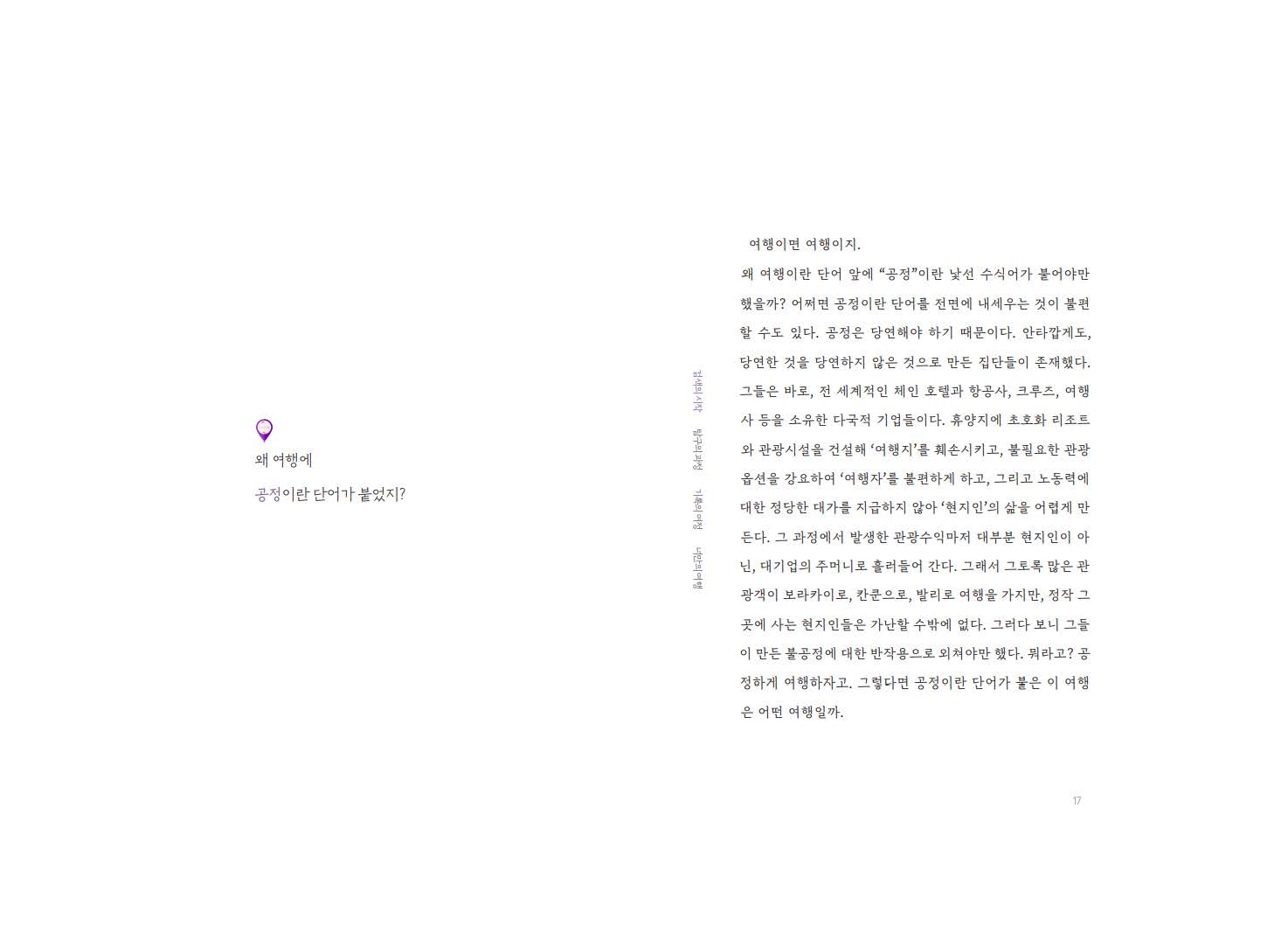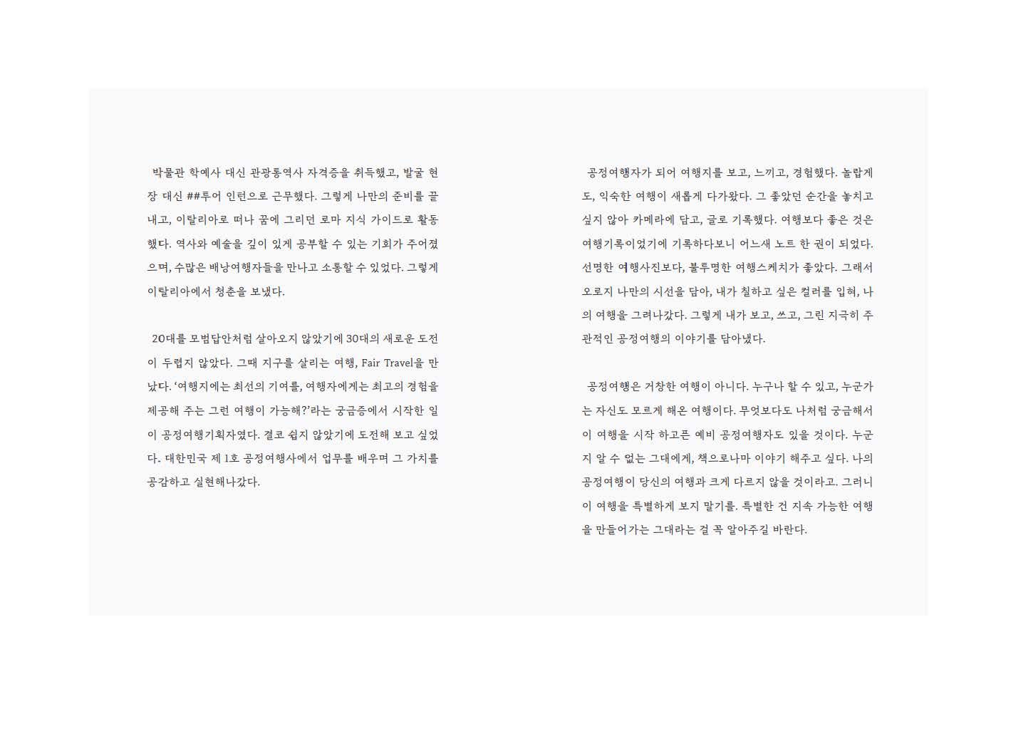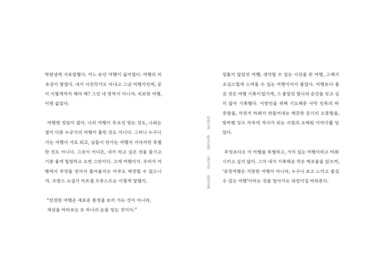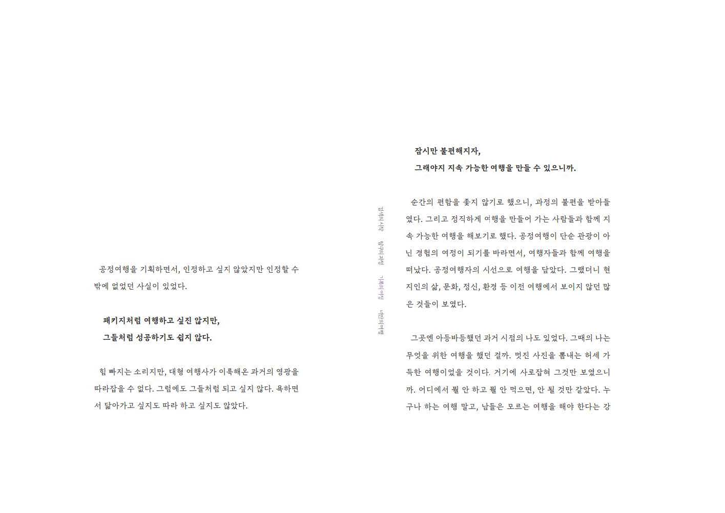 ‘여행지의 환경을, 현지인의 일상을, 여행자의 행복을 지켜주는’ 그런 여행이 가능할까? 그 막연한 궁금증이 도화선이 되어, 공정여행에 발을 담갔다. 사소한 불편을 감수하자, 소소한 즐거움이 따라왔다. 인사이트를 얻는 여행에 점점 스며들어 갔다. 여행보다 좋은 것은 여행 기록이었기에, 좋았던 찰나의 순간을 잊고 싶지 않아 기록했다. 선명한 사진보다 불투명한 스케치가 좋았기에, 여행의 기억을 그림으로 남겼다. 그렇게 공정여행기획자로서 보고, 쓰고, 그린 지극히 주관적인 이야기를 담아냈다. 저자는 담당하게 고백한다. 자신의 공정여행은 특별하지도, 거창하지도 않다고. 개인적인 취향으로 여행지를 선택했고, 일상적인 습관을 여행에서 실천해 나갔을 뿐이라고. 커피는 유리잔에, 젤라또는 콘에, 손수건과 텀블러는 가방에, 뭐 이런 습관들? 그러니 부담스러운 여행이 아니라, 누구나 보고, 느끼고, 즐길 수 있는 여행이라고. Fair Travel이 어떤 여행인지 궁금해하는 누군가에게 이 책이 산뜻한 시작점이길 바라본다.