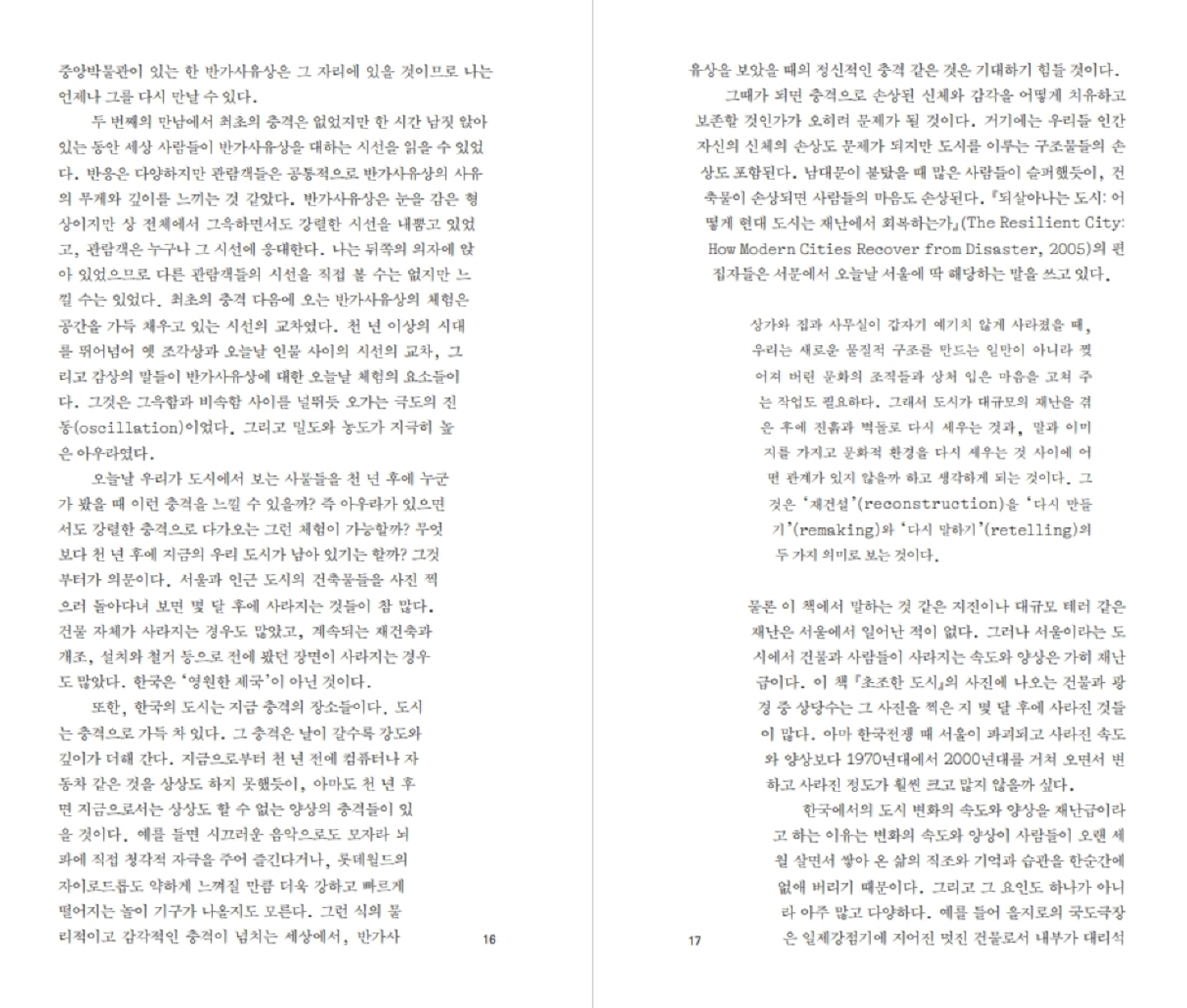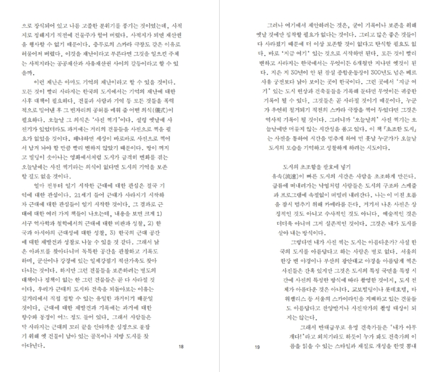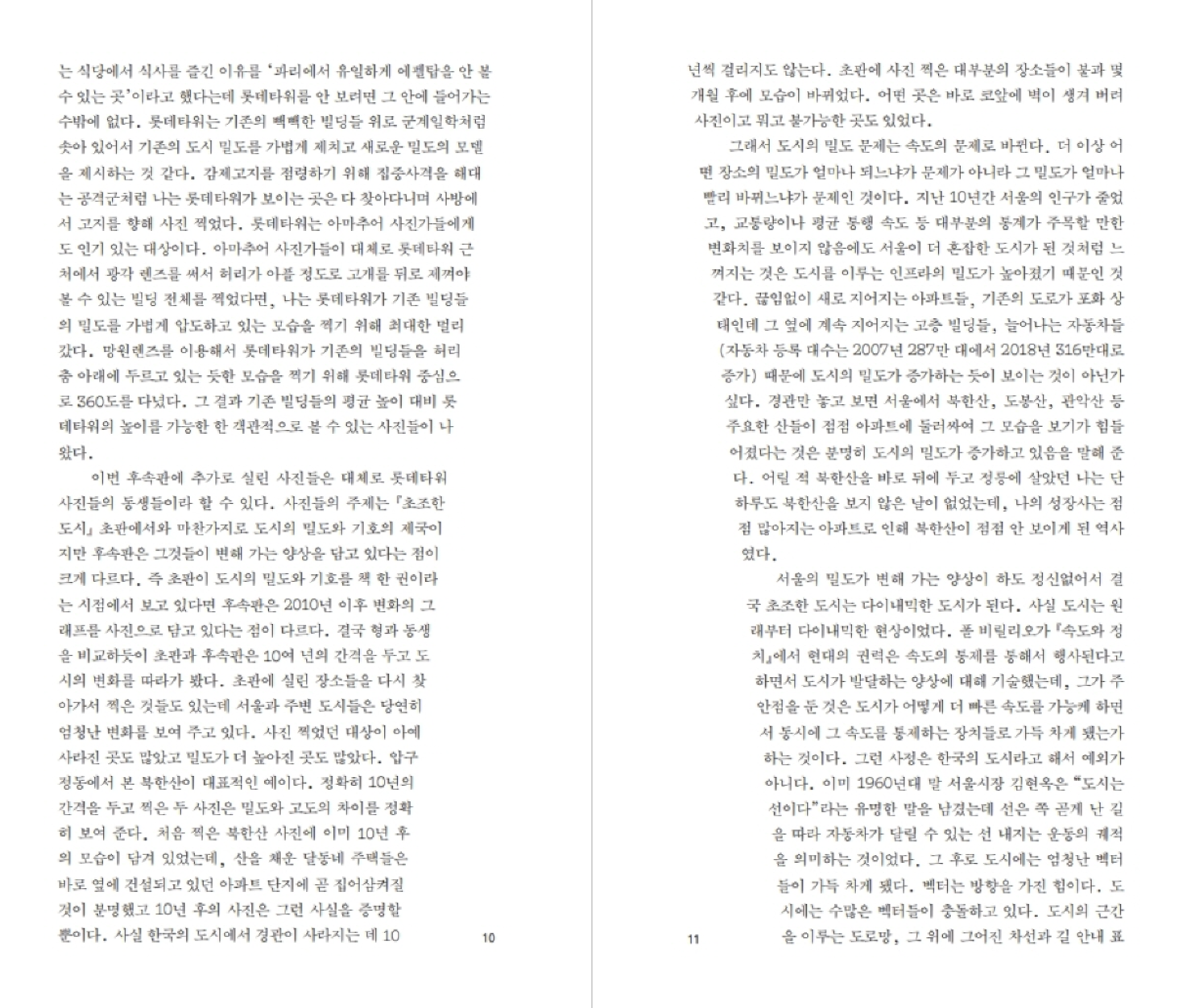 한국의 도시는 상상을 뛰어넘는 충격의 장소다. 오늘 멀쩡하던 건물이 내일이면 철거되고, 내일 세워졌던 건물은 몇 달 후면 바로 옆에 세워진 더 높은 건물에 가려 보이지 않는다. 도시의 밀도는 더 이상 공간의 문제가 아니라 시간의 문제다. 얼마나 많이 바뀌냐가 아닌, 얼마나 빨리 바뀌는지가 문제인 것이다. 도시의 빠른 유속은 그 속에 살아가는 사람들을 초조하게 만든다. 그렇다고 사람들이 매일 괴로워하며 도시를 살아가지는 않는다. 사람들은 저마다 자기 방식으로 도시의 초조함을 소화하며 살아간다. 자기가 보기 싫고 듣기 싫은 것은 괄호에 넣어버린다. 저자에게는 카메라가 바로 도시의 초조함을 괄호 안에 넣는 방식이다. 즉, 그의 목적은 도시의 아름다운 모습을 사진으로 담아내는 것이 아니고, 도시의 변화를 역사적으로 기록하려는 것도 아닌, 도시를 살아내기 위함이다.
