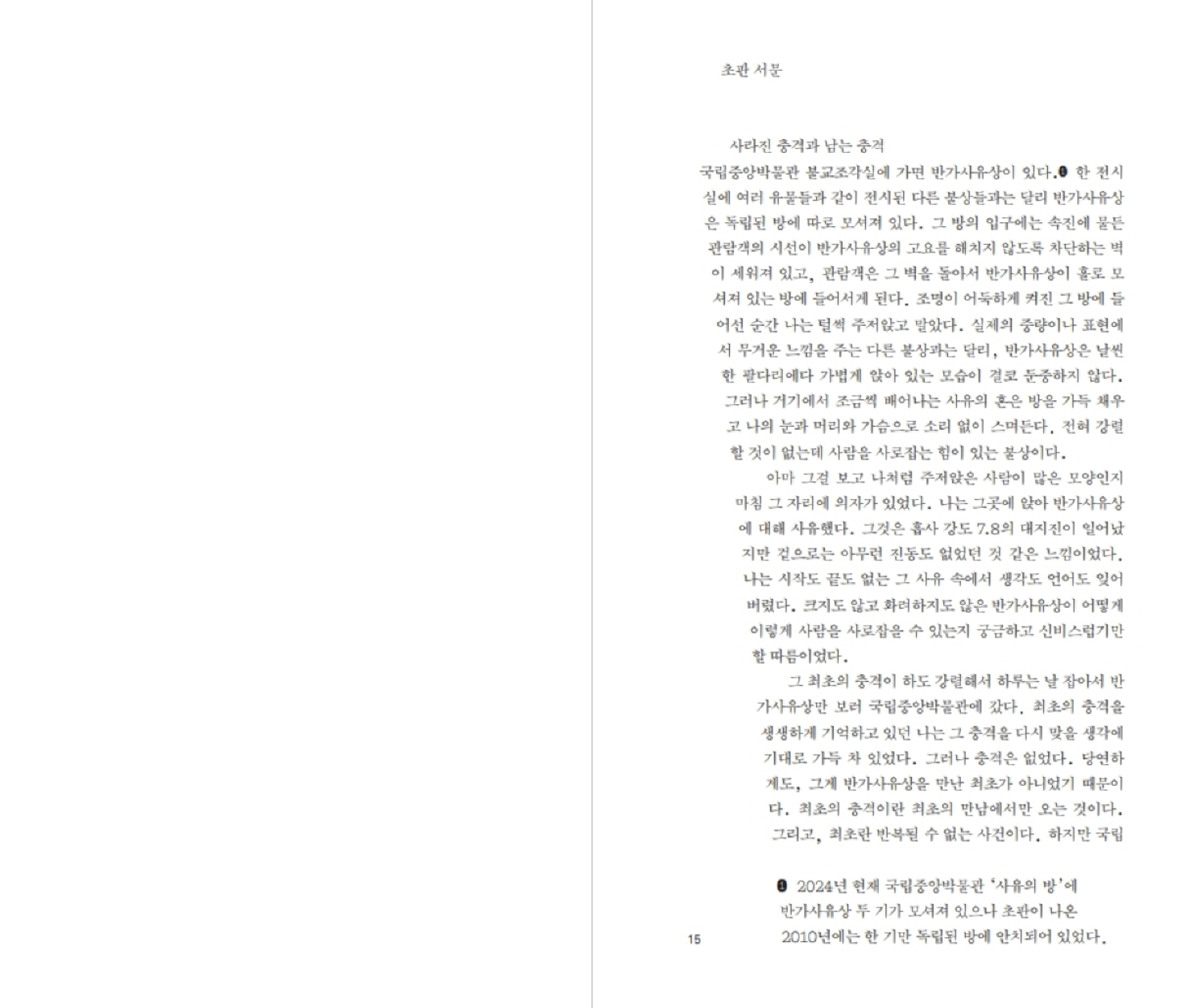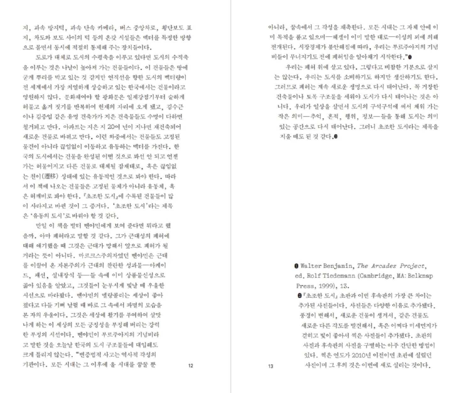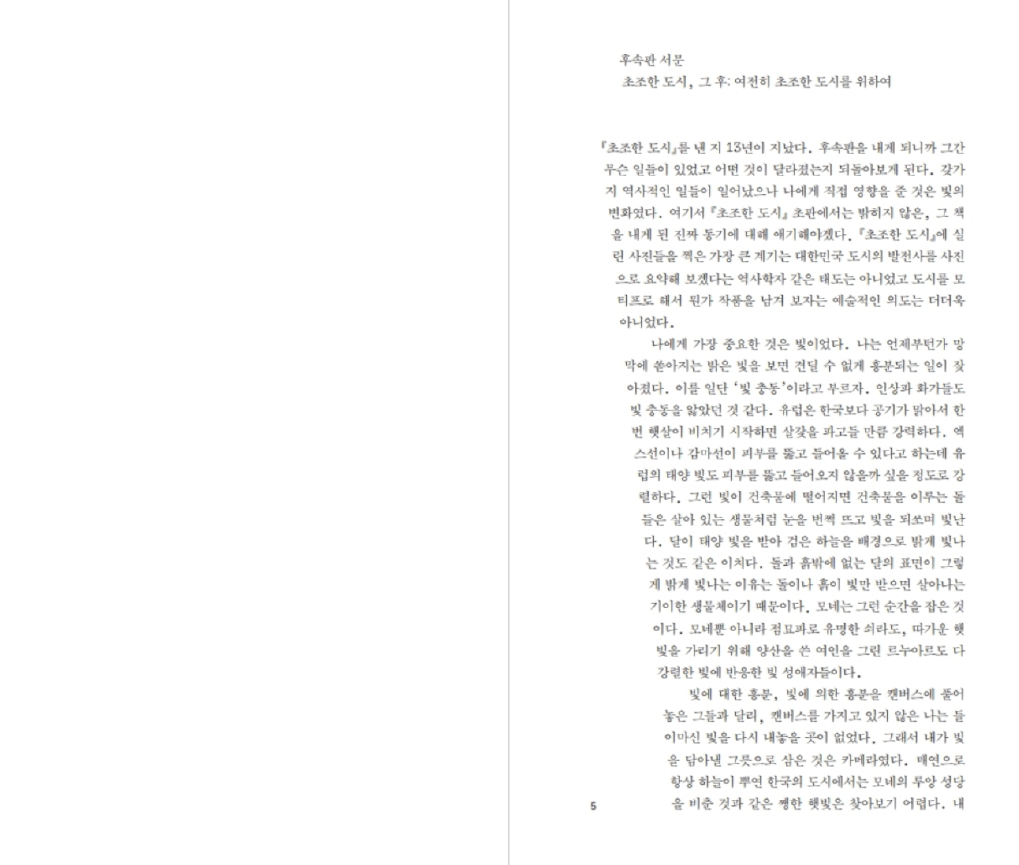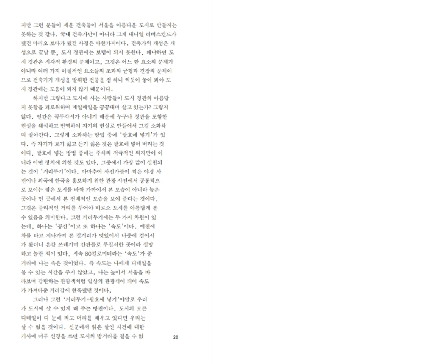 한국의 도시는 상상을 뛰어넘는 충격의 장소다. 오늘 멀쩡하던 건물이 내일이면 철거되고, 내일 세워졌던 건물은 몇 달 후면 바로 옆에 세워진 더 높은 건물에 가려 보이지 않는다. 도시의 밀도는 더 이상 공간의 문제가 아니라 시간의 문제다. 얼마나 많이 바뀌냐가 아닌, 얼마나 빨리 바뀌는지가 문제인 것이다. 도시의 빠른 유속은 그 속에 살아가는 사람들을 초조하게 만든다. 그렇다고 사람들이 매일 괴로워하며 도시를 살아가지는 않는다. 사람들은 저마다 자기 방식으로 도시의 초조함을 소화하며 살아간다. 자기가 보기 싫고 듣기 싫은 것은 괄호에 넣어버린다. 저자에게는 카메라가 바로 도시의 초조함을 괄호 안에 넣는 방식이다. 즉, 그의 목적은 도시의 아름다운 모습을 사진으로 담아내는 것이 아니고, 도시의 변화를 역사적으로 기록하려는 것도 아닌, 도시를 살아내기 위함이다.