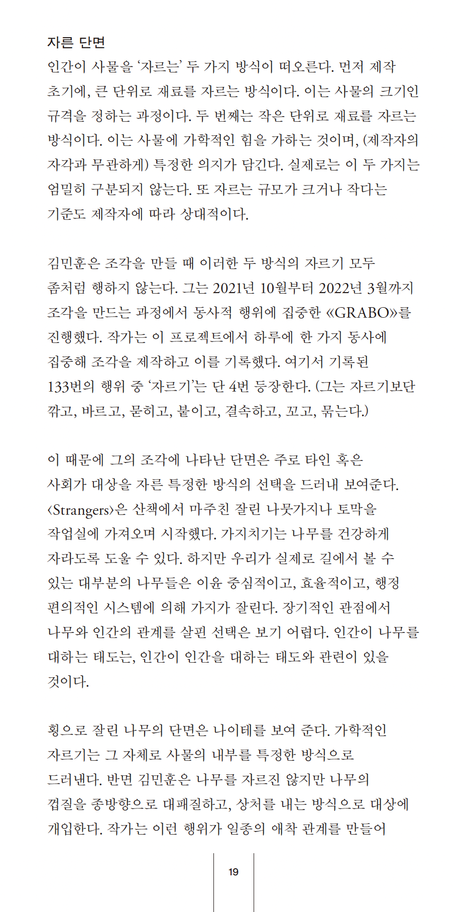 “곧이어 나는 김민훈의 조각이 품고 있는, 그의 조각의 뼈대를 이루고 있는 모종의 미학적 프로그램이 있으며 내게 아름다움의 관념을 불러일으킨 힘은 그것과 관련 있지 않을까 짐작해 봤다. 모든 조각들이 미학적 프로그램에 휘말려 있다는 생각이었다. 경험을 구조화할 정도의 힘이라면 보이는 것보다 강한 무언가가 분명 있을 수밖에 없기 때문이다.” – 이한범, 「아름다움과 기억 사이」, 《나뭇등걸》, 2024