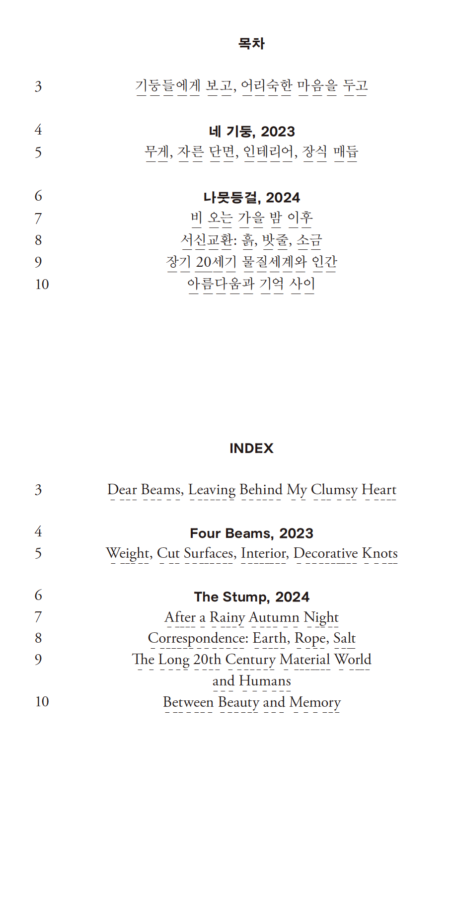 『기둥들』은 조각가 김민훈의 개인전 《네 기둥》(2023)과 《나뭇등걸》(2024)을 중심으로, 도록의 제목인 ‘기둥’은 구조물로서의 기둥이라기보다, 작가가 반복적으로 마주해 온 태도와 감각, 그리고 그것을 조각적으로 세우는 방식에 대한 은유로 쓰였다.