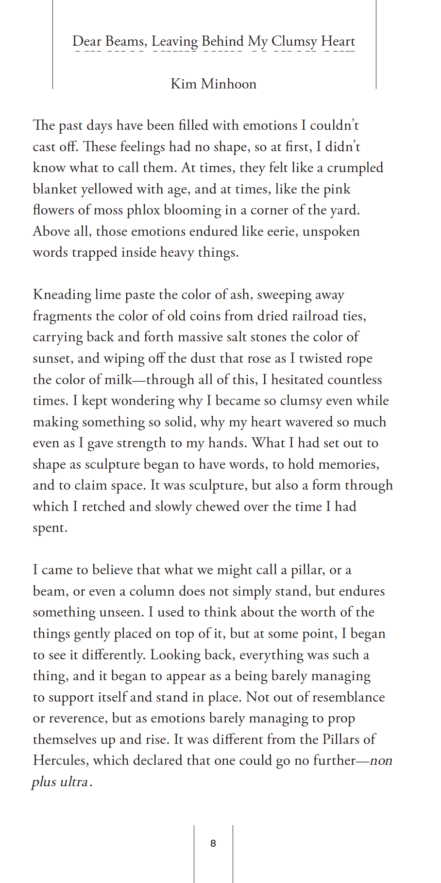 “조형적이고자 했던 것들이 점차 말을 갖고, 기억을 품고, 자리를 차지하기 시작했습니다. 그것은 조각이기도 했고, 제가 보낸 시간을 수차례 게워내며 뭉근히 되씹는 형식이기도 했습니다.” – 김민훈, 「기둥들에게 보고, 어리숙한 마음을 두고」
