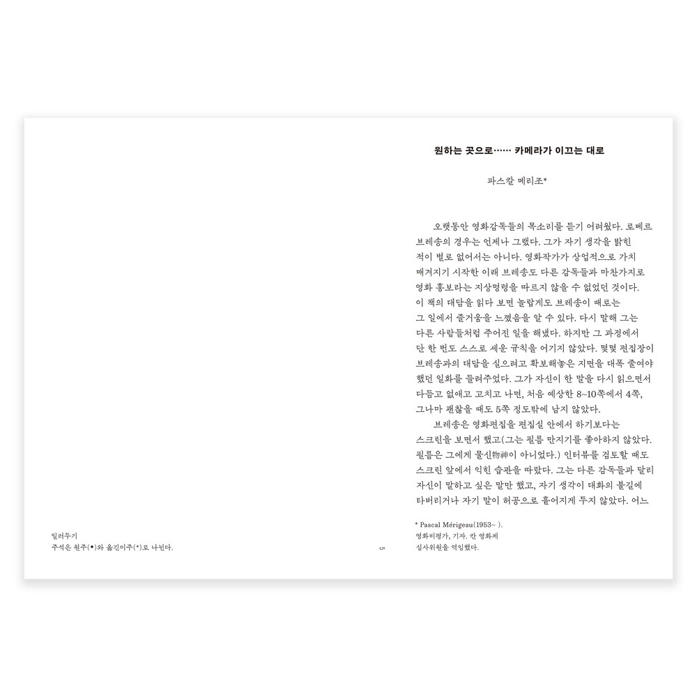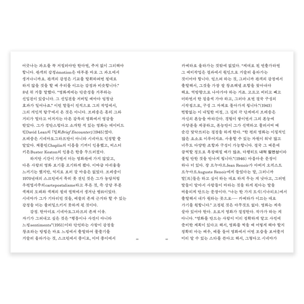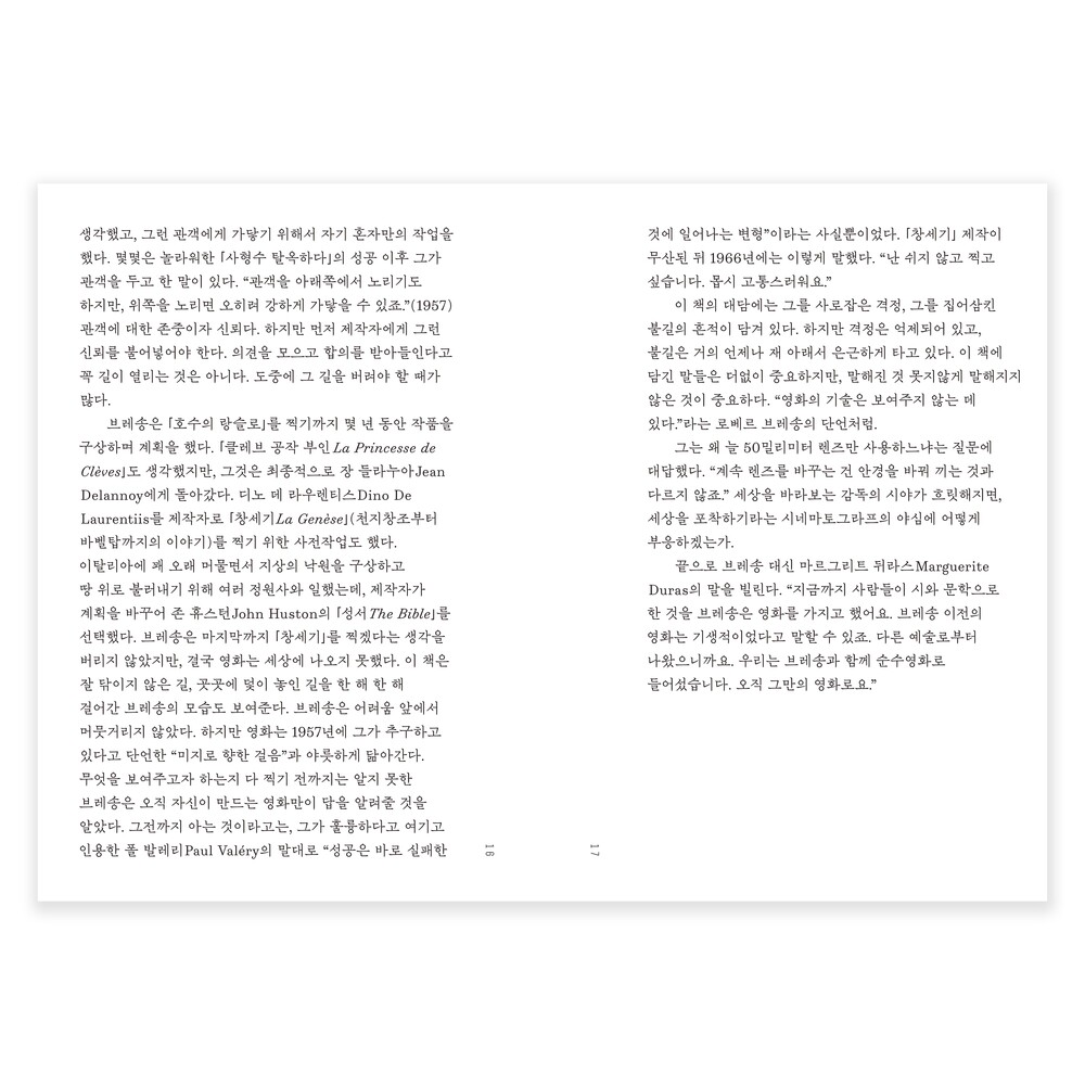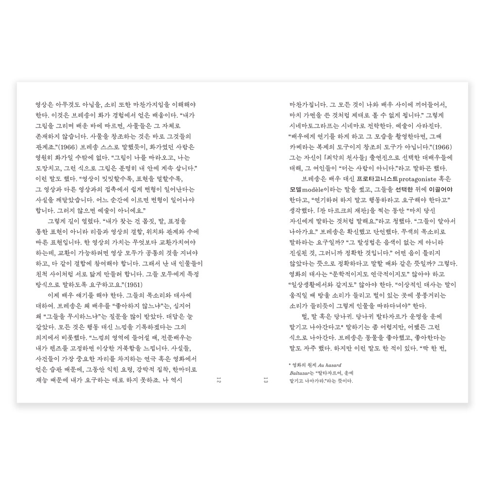 대담 선별은 그의 아내 밀렌 브레송이 맡았으며, 주요 작품과 개념을 중심으로 시간순 정렬되어 있어, 브레송의 창작 방식과 이론적 기반, 그리고 한 예술가의 철학적 진화를 조망하기에 탁월합니다. 개인사는 거의 알려지지 않은 인물이지만, 착상부터 완성까지 창작의 전 과정을 꿈;없고 가감없이 이야기하는 브레송의 목소리를 통해, 그의 정체성이 생생히 드러납니다.