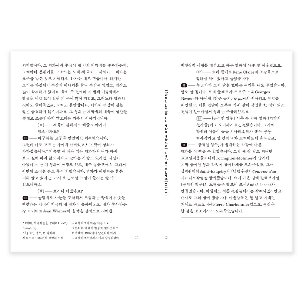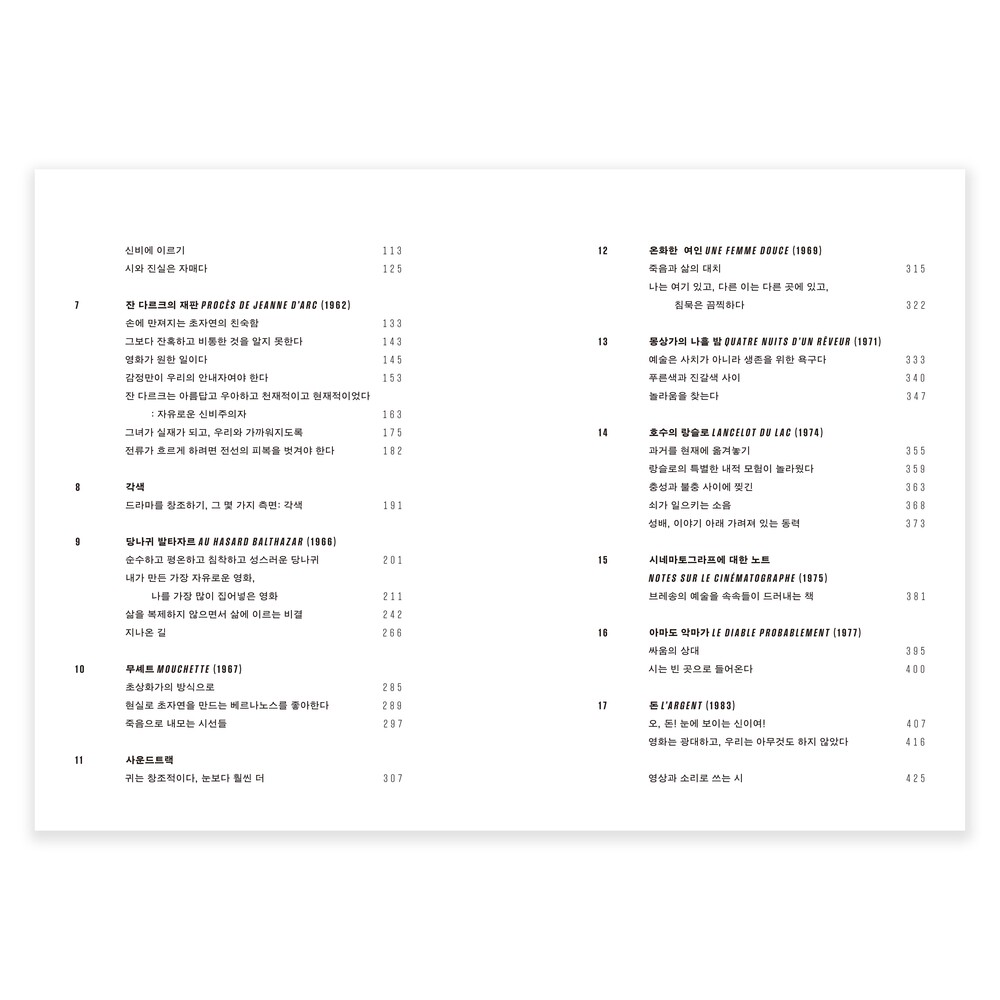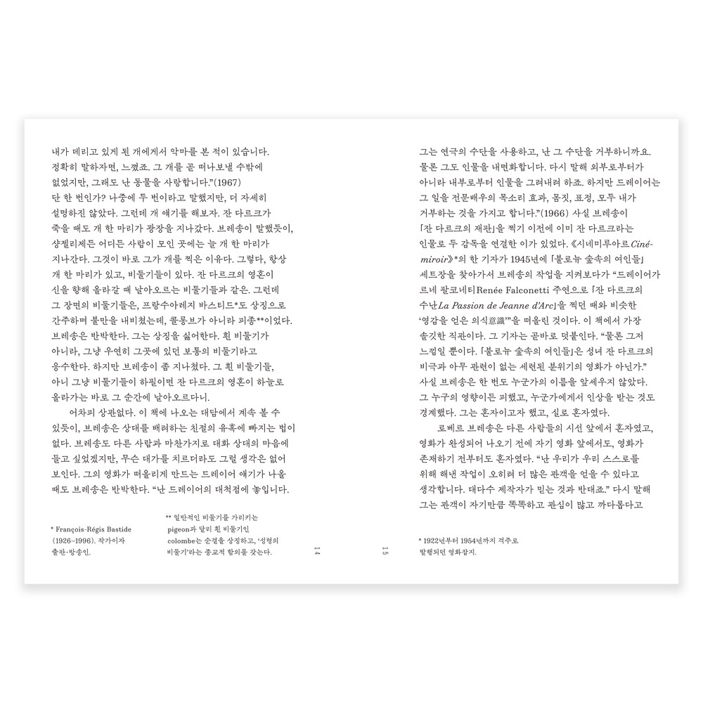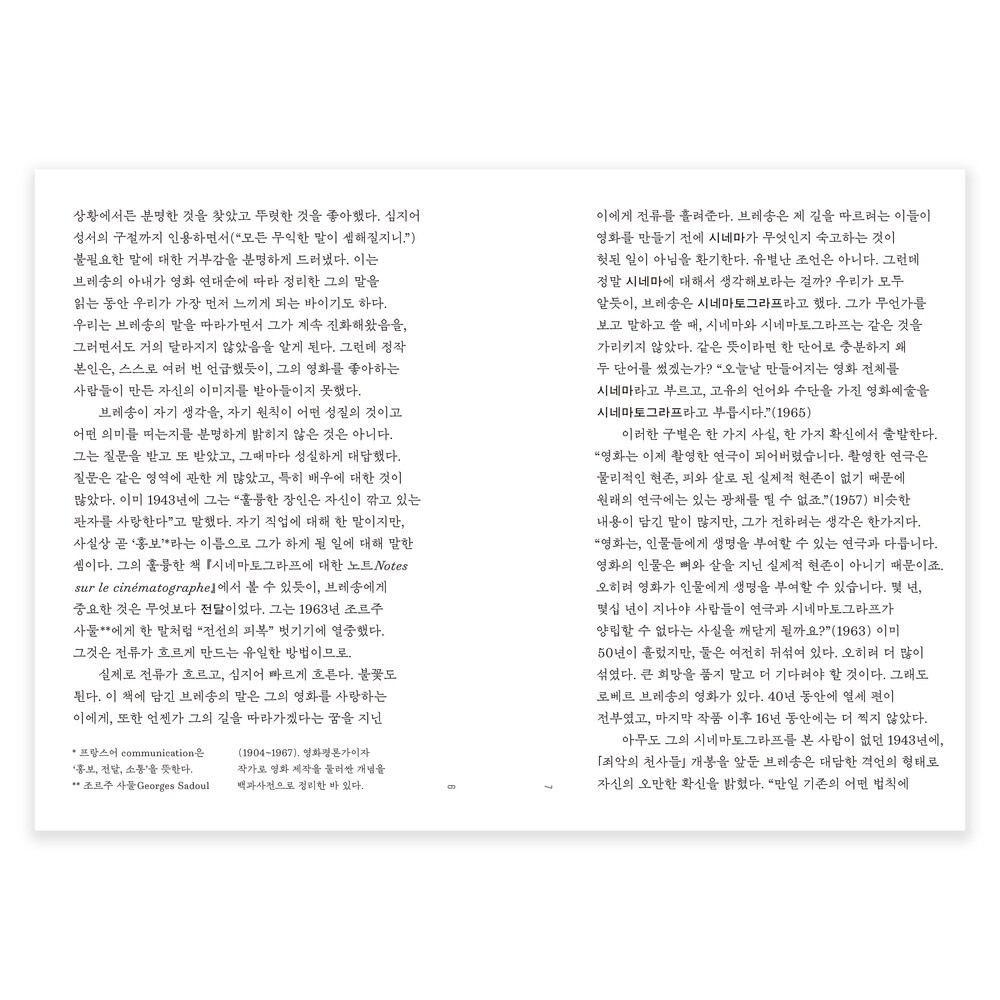대담 선별은 그의 아내 밀렌 브레송이 맡았으며, 주요 작품과 개념을 중심으로 시간순 정렬되어 있어, 브레송의 창작 방식과 이론적 기반, 그리고 한 예술가의 철학적 진화를 조망하기에 탁월합니다. 개인사는 거의 알려지지 않은 인물이지만, 착상부터 완성까지 창작의 전 과정을 꿈;없고 가감없이 이야기하는 브레송의 목소리를 통해, 그의 정체성이 생생히 드러납니다.
